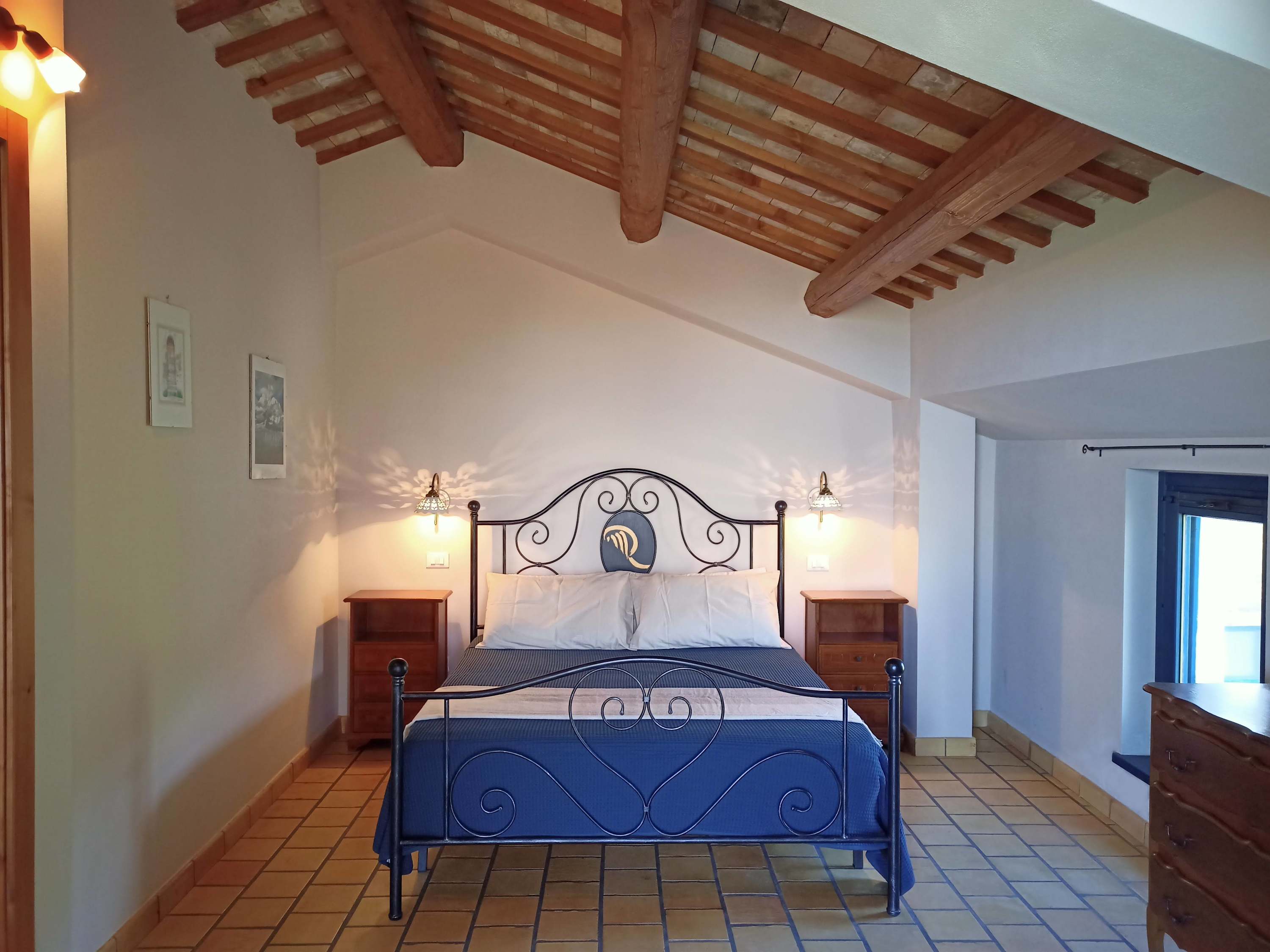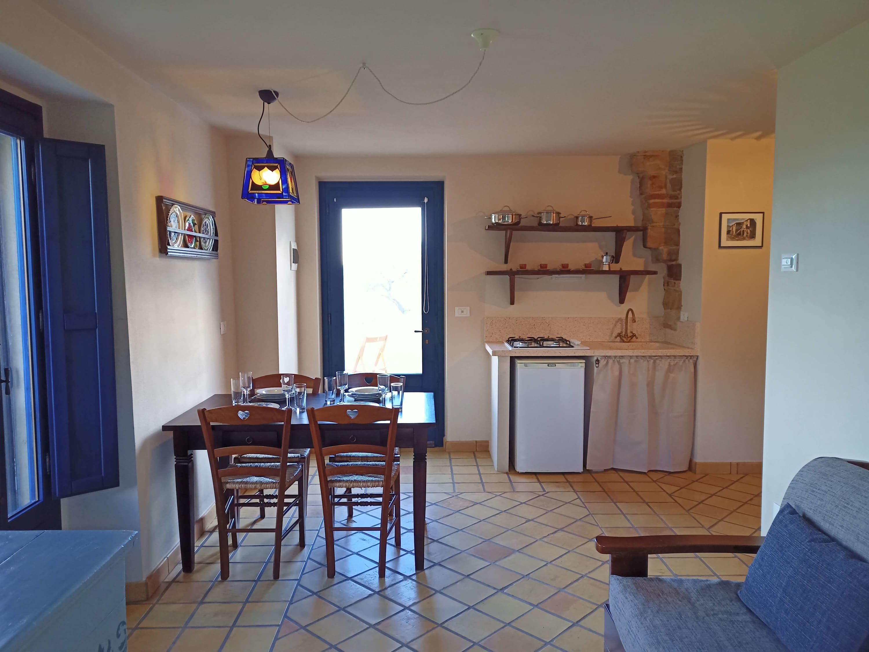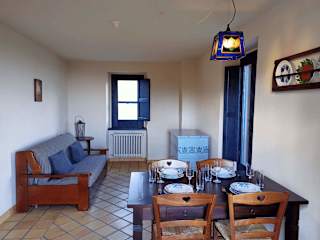 Inside, the accommodation is arranged over two floors, offering plenty of space to relax and unwind. On the first floor, there is a bright, open-plan living, kitchenette and dining area. The kitchenette is equipped with 4 ring gas hob, fridge, moka coffee maker and plenty of cookware, glassware and utensils. There is a comfortable sofa and a wooden table seating four. Finally, there is a bathroom on this floor. Stairs lead to the second floor where you will find the second bedroom. This is a charming room with a traditional, exposed, wooden beamed ceiling.