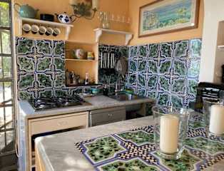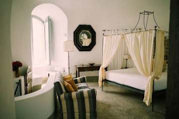 Guests will love living in this unique 13th century watchtower which boasts breathtaking 360 degree views from its private terraces. The tower itself is home to the master bedroom and bathroom which is contained within the room. A colourful annex is where guests will find a living area. Here there is a trundle bed which can sleep an additional guest as well as a small kitchen. Please note that the trundle bed is only suitable for an adult or child aged 14 or older. A second bathroom is located outside the tower on the terrace that surrounds it. The interior space measures just over 60 square metres.