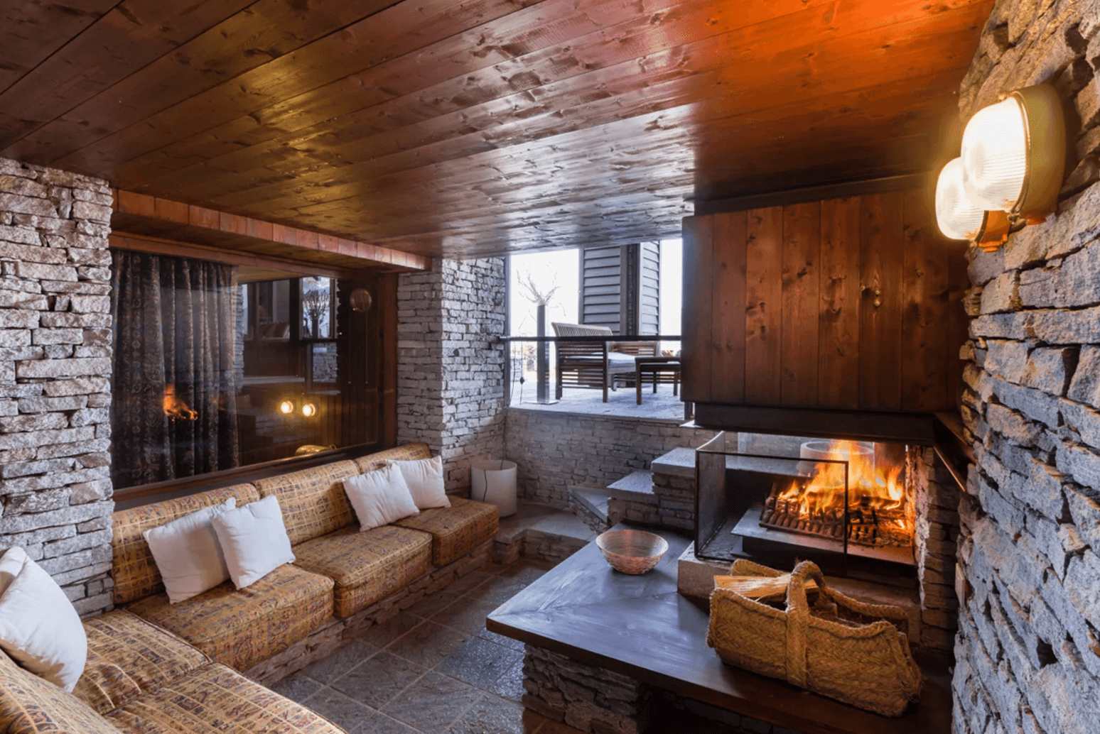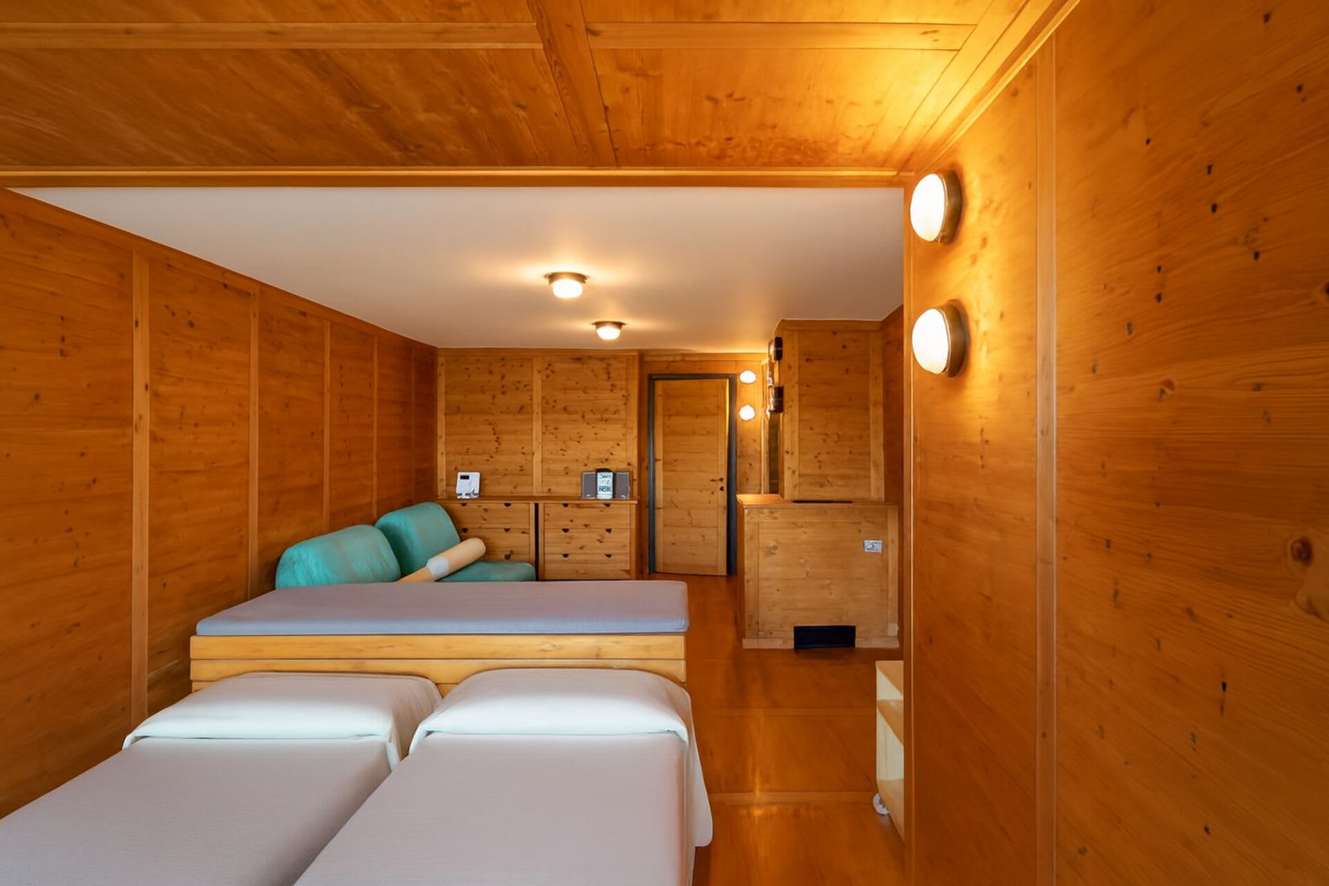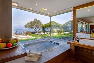 A flight of stairs leads to the lower level of Villa Ispra where there are some storage rooms as well as a laundry room. In addition, there are two further bedrooms on this floor, each with their own bathroom. One of these rooms doubles up as a gym and is equipped with a sauna whilst the other is a bedroom suite complete with king size bed, walk-in wardrobes, living area and kitchenette. It also has a large whirlpool bath which looks out over the pool towards the lake whilst the bathroom behind is equipped with a shower that doubles us as a Turkish bath, washbasin and WC.