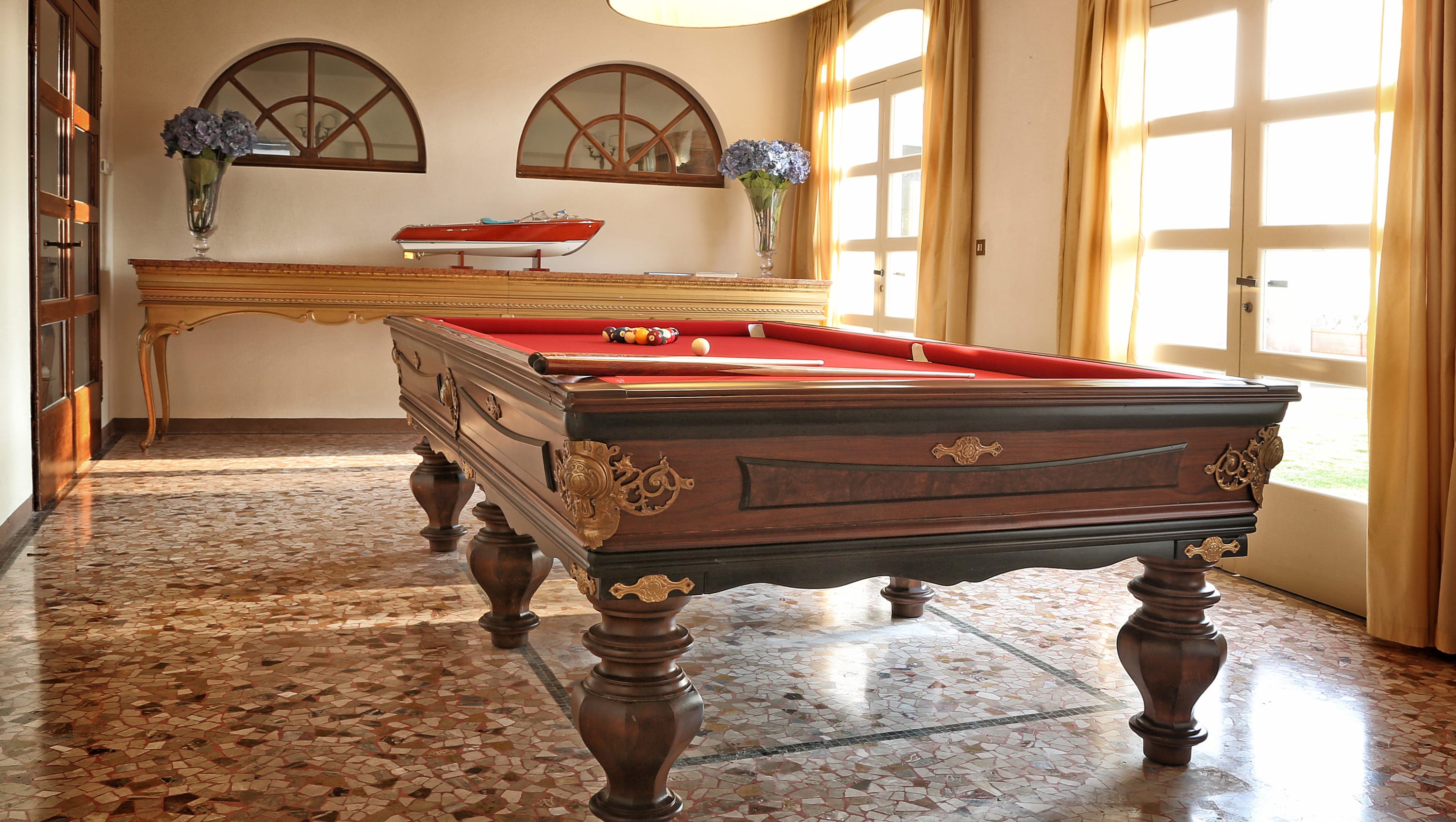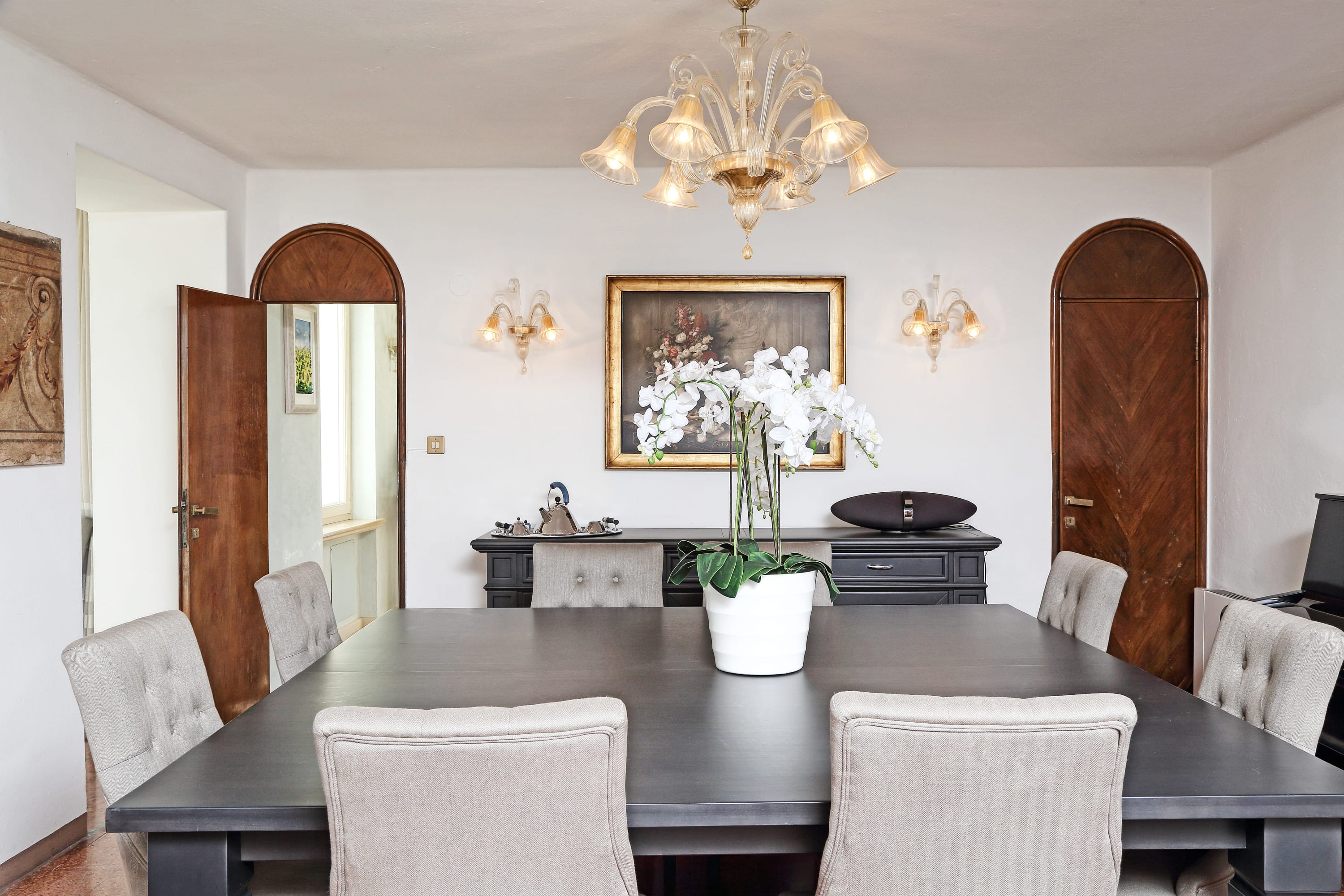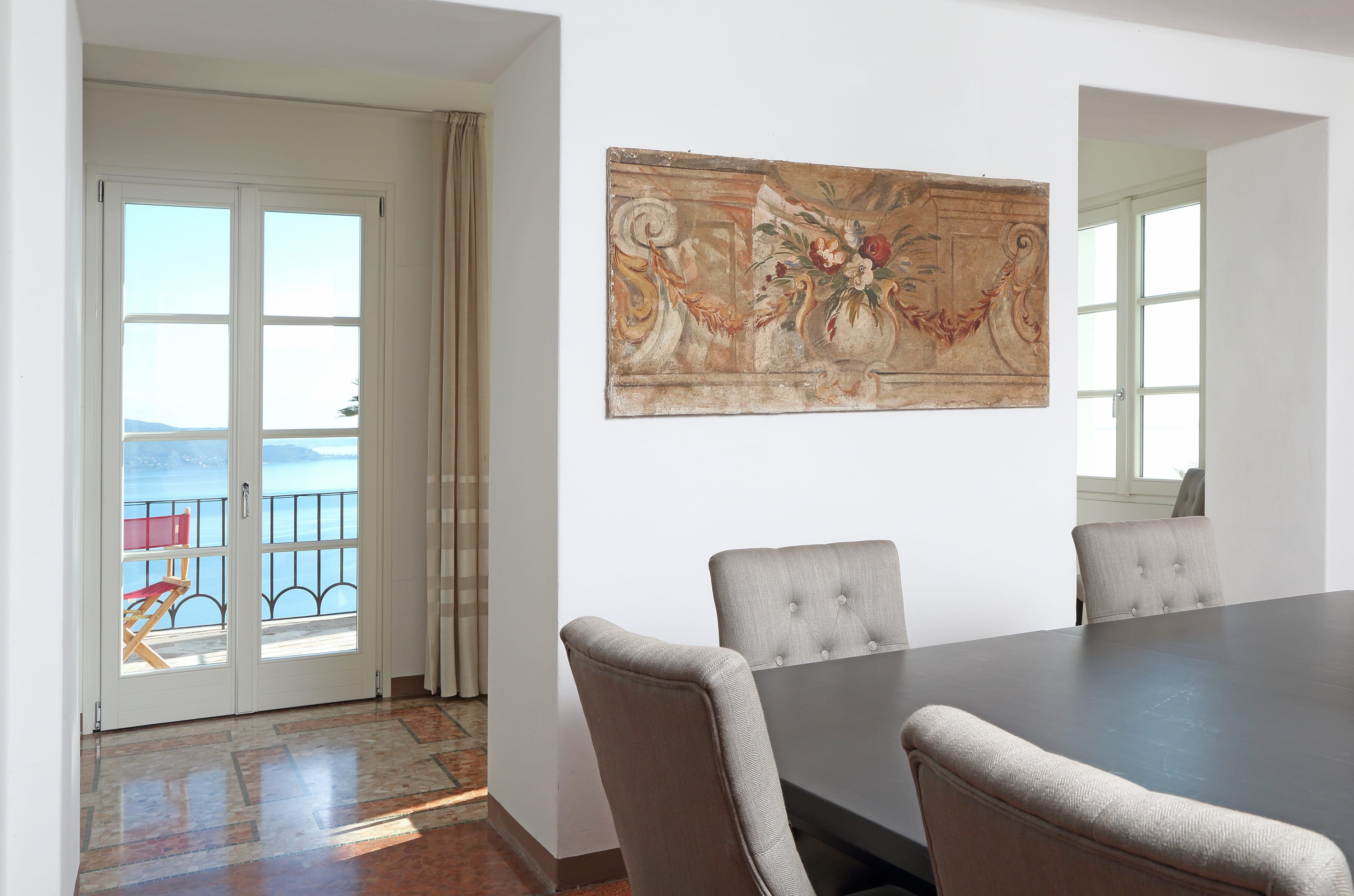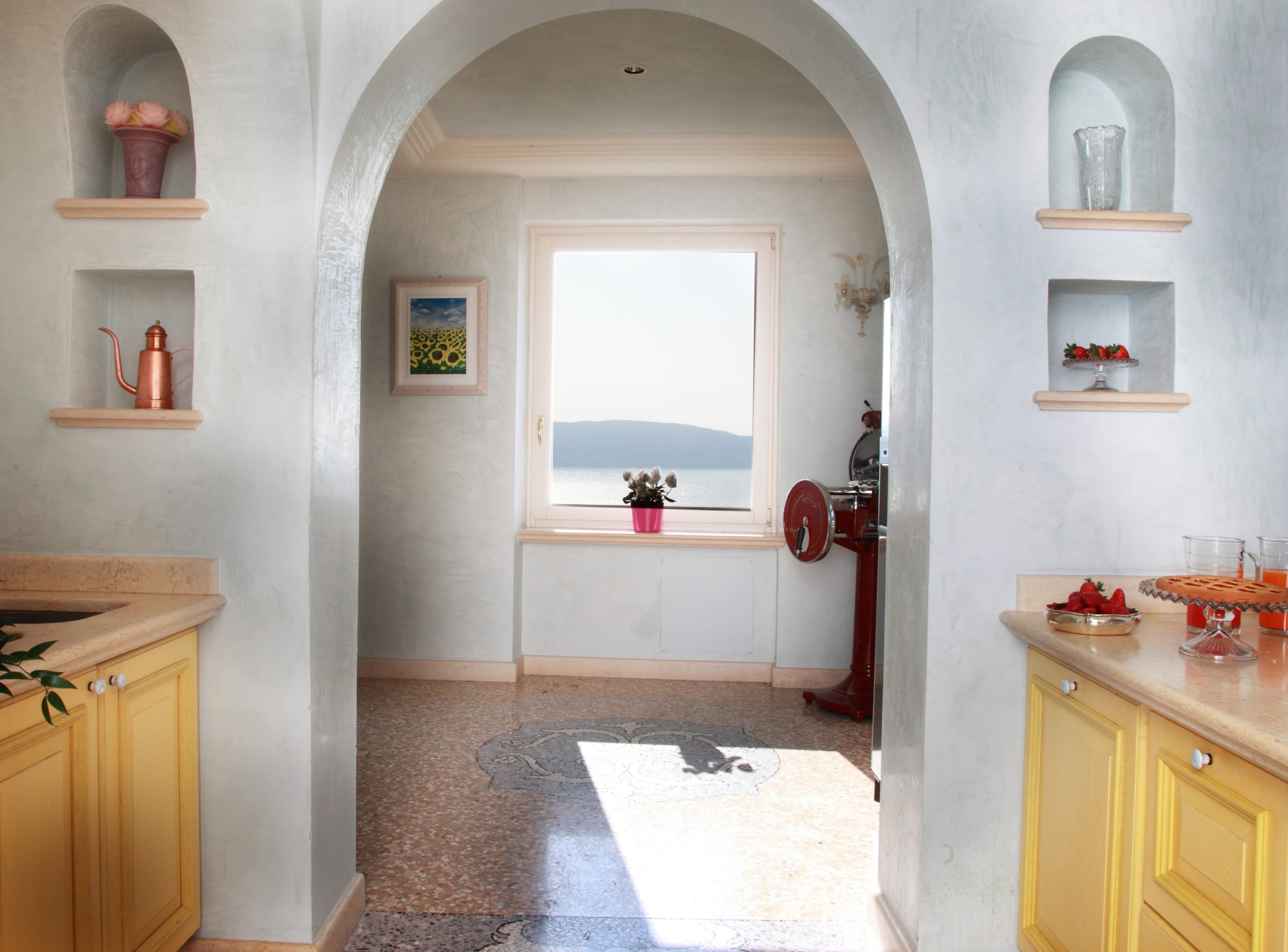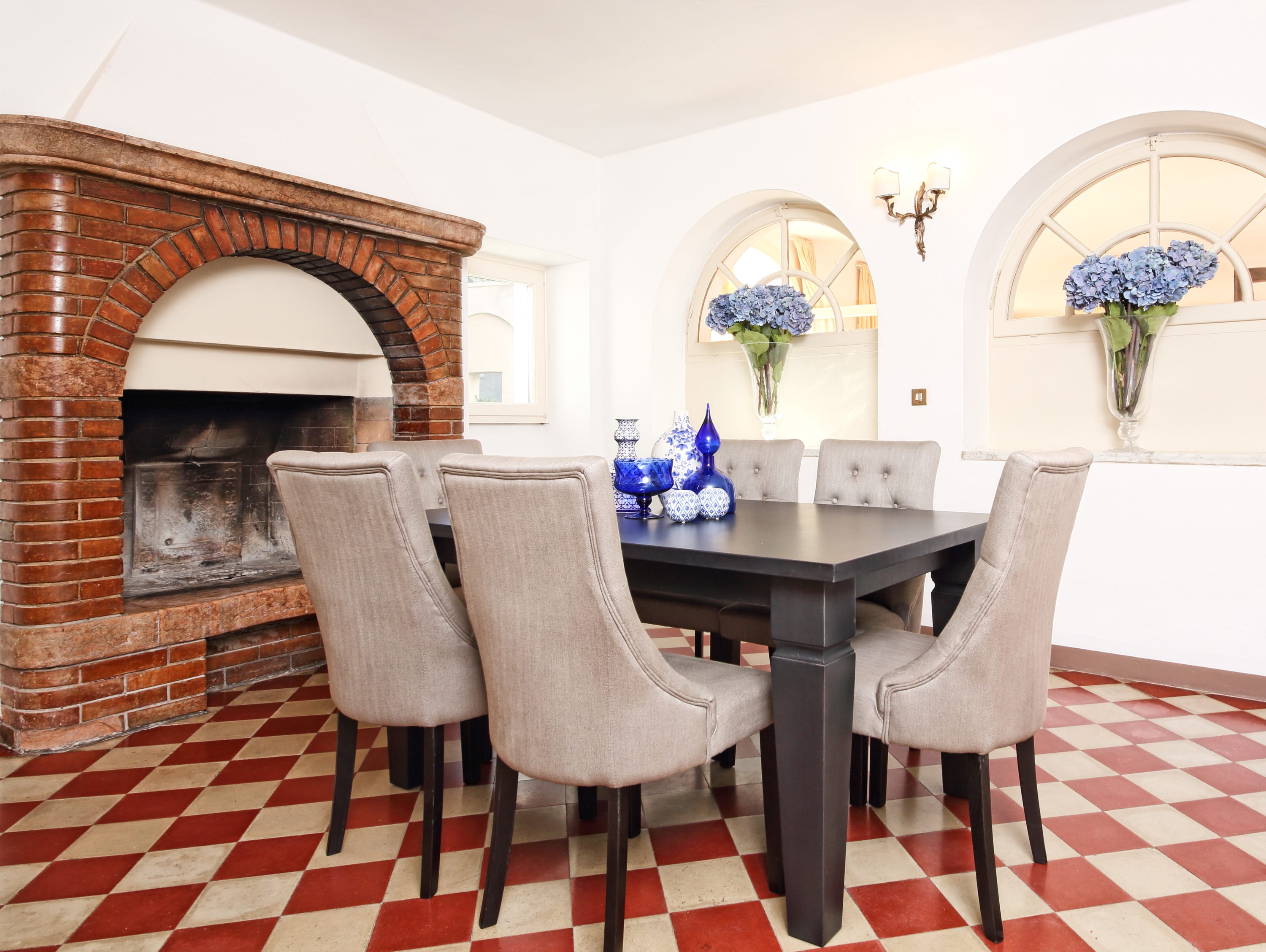 Inside there is a living and dining area. This is an elegant space with original Venetian floors and historical fireplaces. There is also a piano and a billiard room and a well equipped kitchen. Both the living rooms and the kitchen enjoy breathtaking views of Monte Baldo and the southern part of Lake Garda.