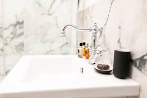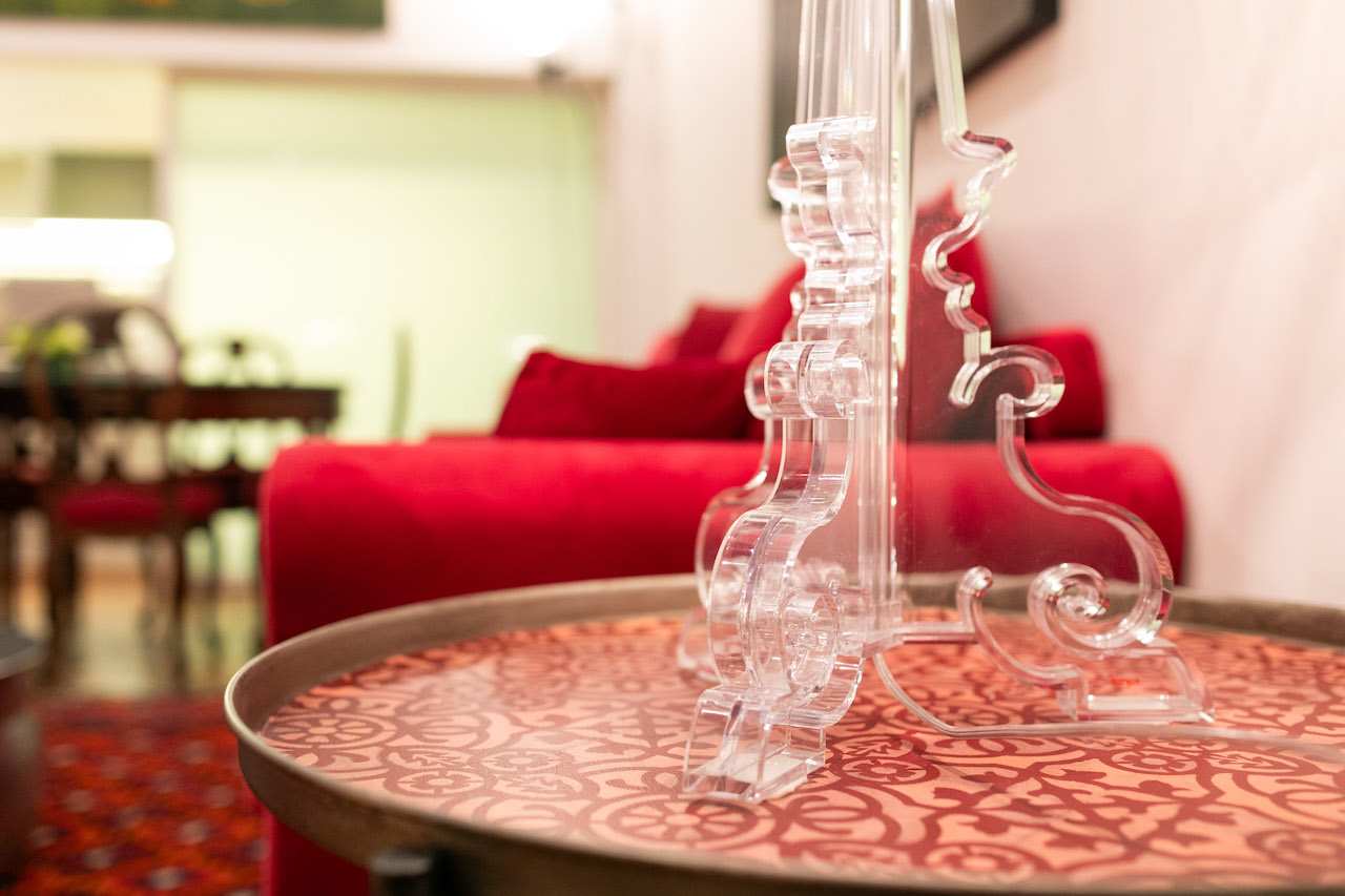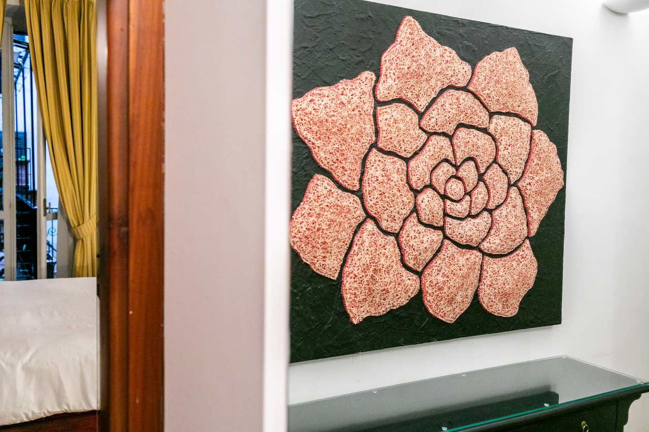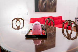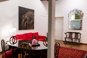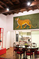 The apartment is on the first floor of this historic building, accessed via an elevator. Inside, furnishings are both stylish and colourful, using rich fabrics and deep colours to add character and warmth. Many of the pieces have a nod to India, with carved wooden headboards and a painted tiger which adorns the wall in the open plan living and dining area. Other pieces are beautiful antiques. The mix of contemporary and traditional creates a unique, warm and welcoming place to stay.