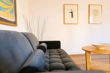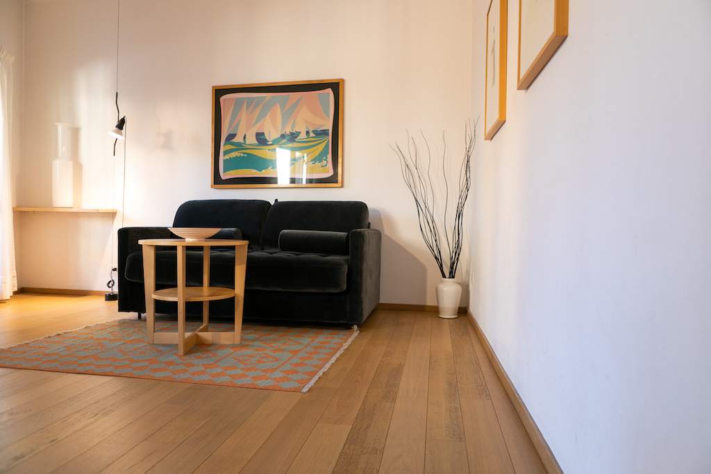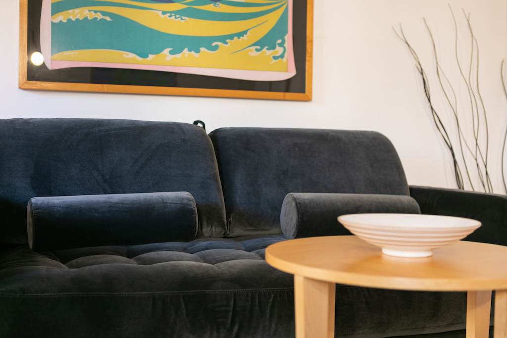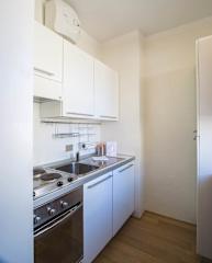 Inside, the apartment measures 65 square metres. It comprises a comfortable bedroom with a double bed, a living room with double sofa bednand dining table, an en-suite bathroom with shower, a kitchenette. The kitchenette is small but has everything you should need to prepare simple meals including a fridge, hob, oven and dishwasher. There is also a coffee machine.