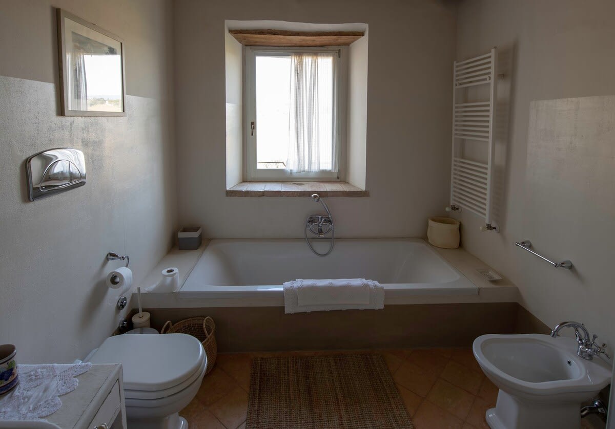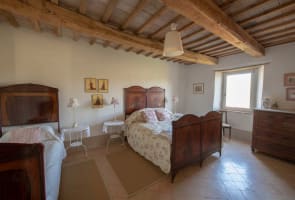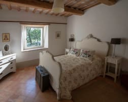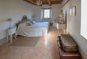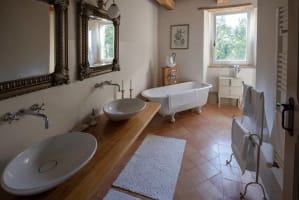 The stunning interior decor continues upstairs at this luxury Marche villa rental. On the first floor there is a beautiful master bedroom suite with adjoining single room or dressing room. These rooms share a bathroom. In addition there is a smaller double bedroom with a French 'one and a half bed' as well as two further bedrooms (one with kingsize bed and one with both queen and single bed). The bathroom shared between these two rooms has a sunken bath, WC, bidet and large walk-in shower.