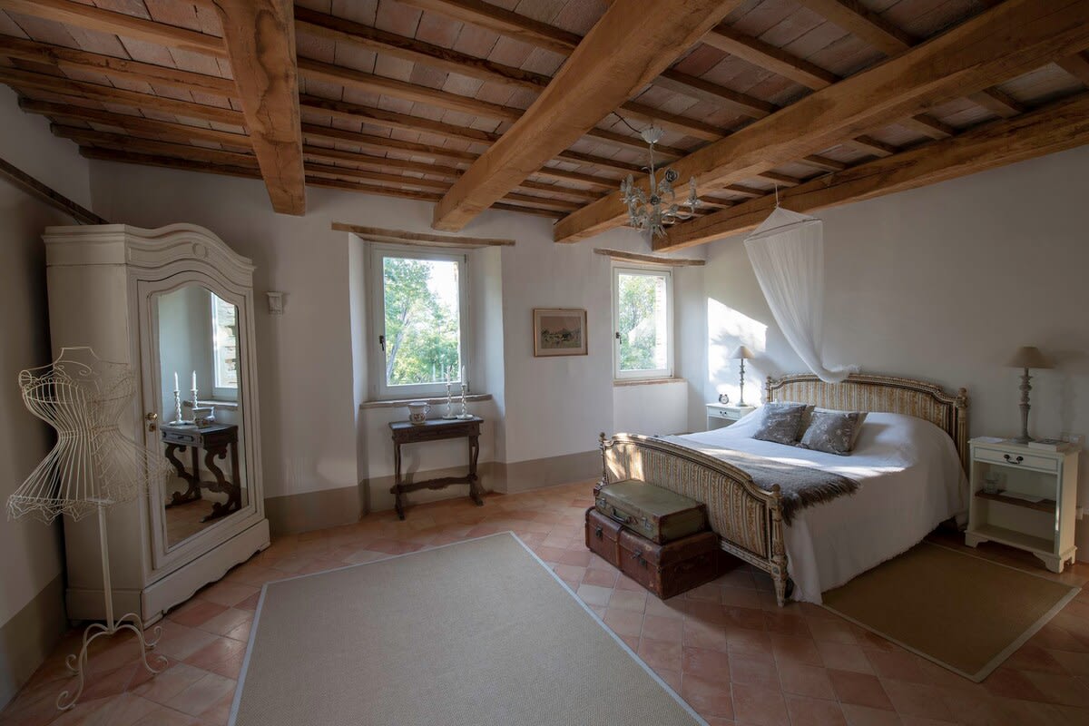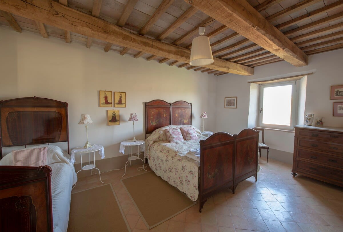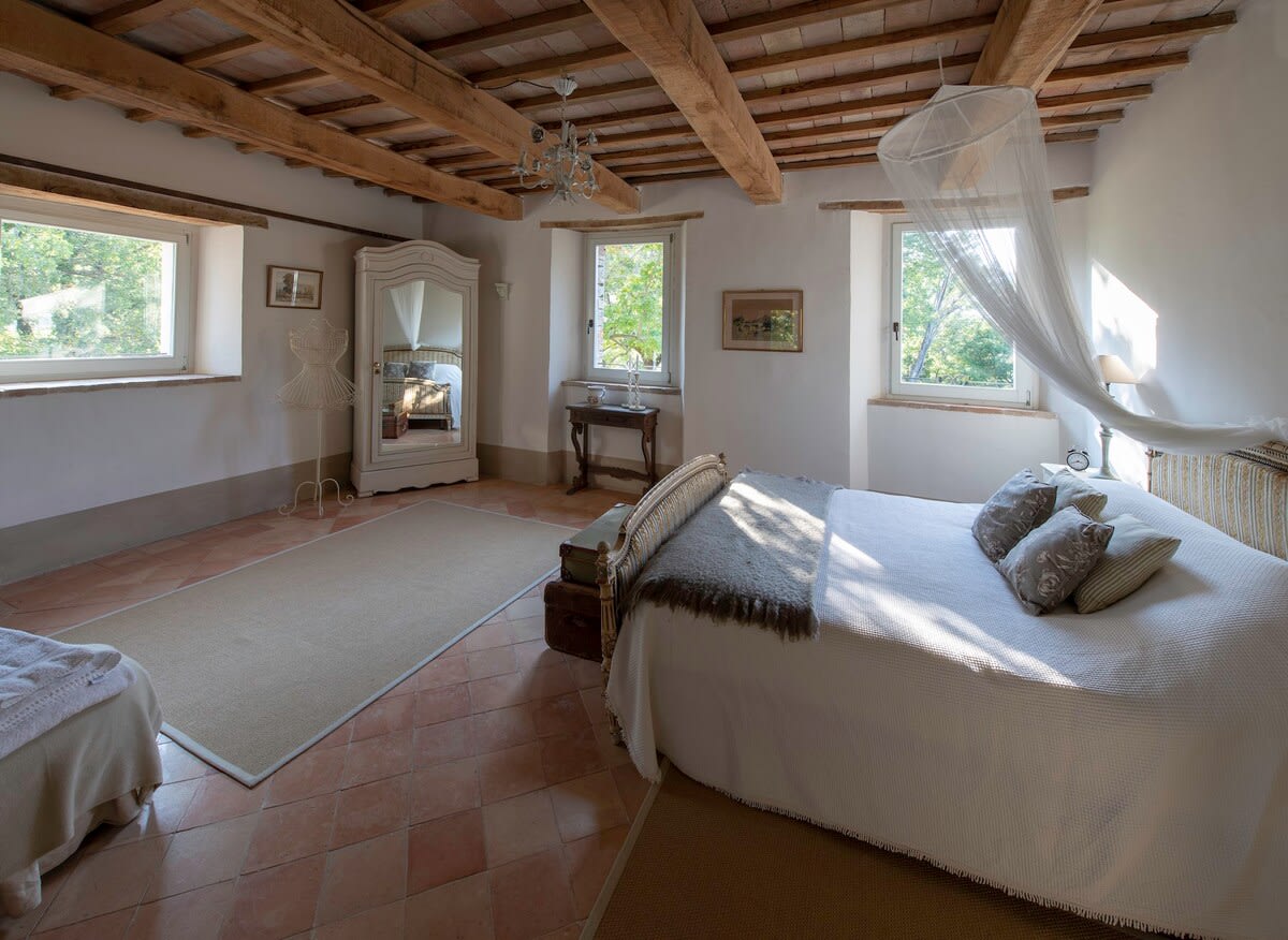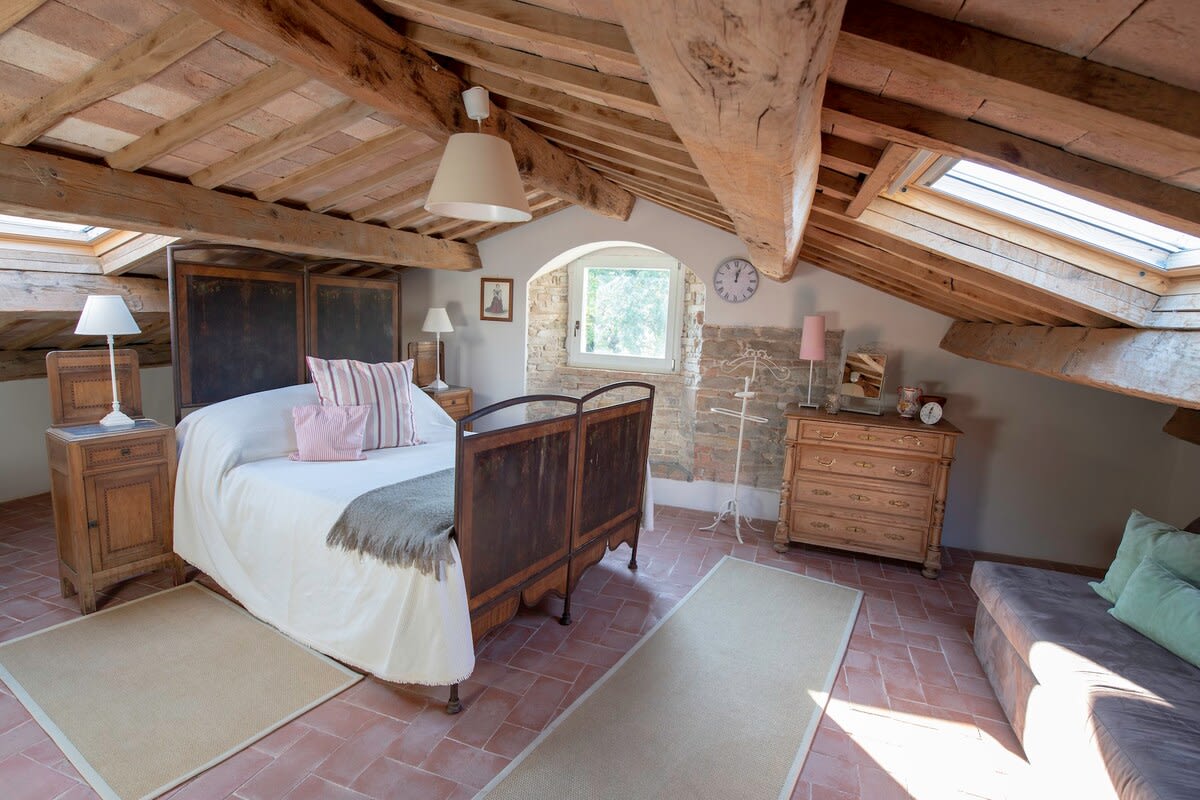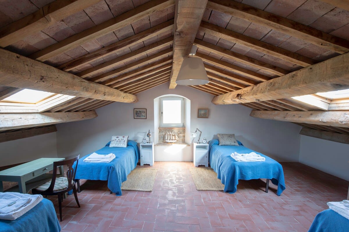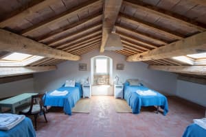 Up a second flight of stairs at this luxury Marche villa rental, guests reach the attic floor of the villa. Despite being in the eaves, the attic floor enjoys full standing height and comprises two large double bedrooms (one with three single beds and one with a queen bed and sofa bed). These two bedrooms share a bathroom with WC, bidet, bath and shower attachment. Please note there is some compromised head space in this bathroom.