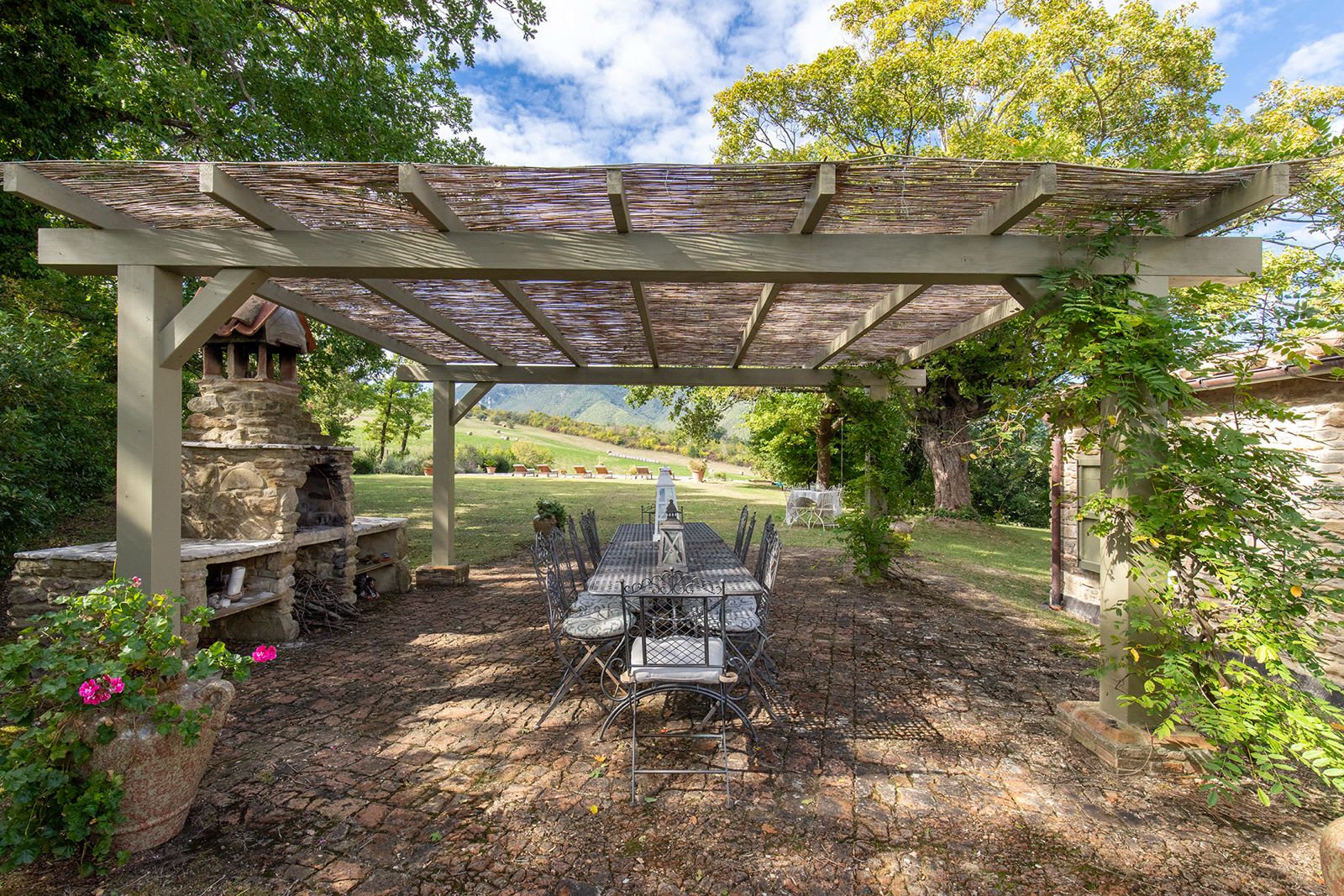 A BBQ area and table are located under the nearby trees, ideal for al fresco cooking and dining. In fact, there is an abundance of outdoor seating options. There are two sets of rattan furniture (two side tables and 8 easy chairs) and two adjoining wrought iron tables with chairs seating 14. In addition, a round table with 5 chairs is situated outside the kitchen on a gravel terrace backing onto the chapel apse. This is a perfect spot for breakfast or a mid morning coffee.