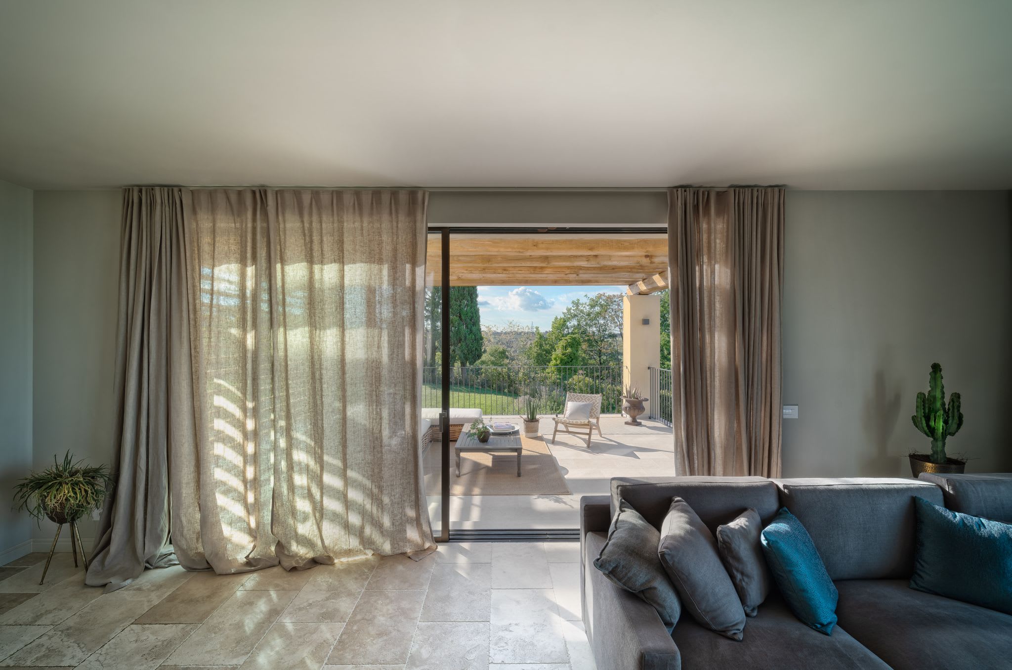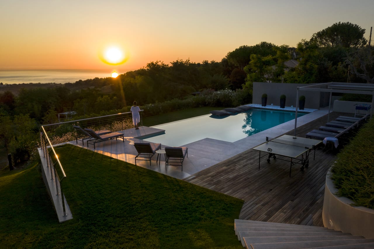 Sliding glass doors link the exterior and interior living spaces creating one massive living space. Outside, there is an infinity swimming pool (12m x 6m) that enjoys views over vineyards and olive groves towards the sea, along with numerous outdoor seating areas. A sleek, contemporary sundeck adjacent to the pool is equipped with 12 sun loungers along with a shower. The owners have also ensured that the areas around the pool and gardens have excellent WIFI so that you can stay connected wherever you are.
