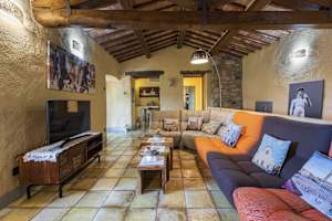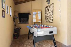 The main house accommodates up to 6 guests. Rooms here are arranged over two floors. On the ground floor, there is a spacious open plan living and dining area. A dining table seats 12, perfect for long meals in the Winter months. A fireplace adds charm and character to the space. There is also a fully equipped professional kitchen. Both the dining and kitchen areas have doors leading directly to the garden. Finally there is a WC on this floor and a laundry room. Upstairs there is a second living room. This is a smaller room with comfortable sofas and armchairs arranged around a TV. And there is a study corner. A small balcony leads from here and overlooks the garden. Please note that this space is also accessible via an external staircase. There are also 2 double rooms in the main villa (one with ensuite shower room) as well as a bedroom furnished with 2 single beds (which can be joined on request) and another bathroom with shower.