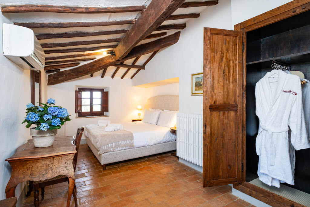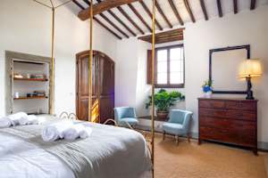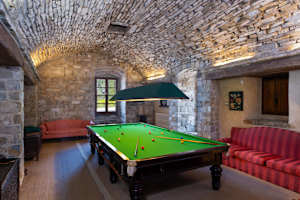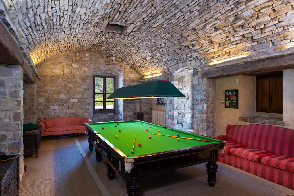 The accommodation in Villa Corta is spread over three floors. Guests enter into a large, antique stone arched entrance hall. On the ground floor, you will also find a fully equipped kitchen and a spacious dining room with wooden table and imposing fireplace. The living room on this floor is furnished with comfortable sofas, a games table, TV and fireplace. A large billiards room provides plenty of entertainment in the evenings. There is also a dartboard here too. Finally, there is a bathroom and laundry room on this floor.