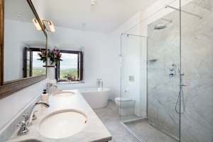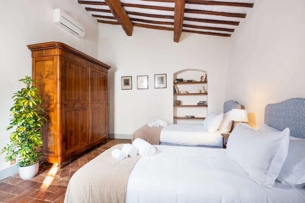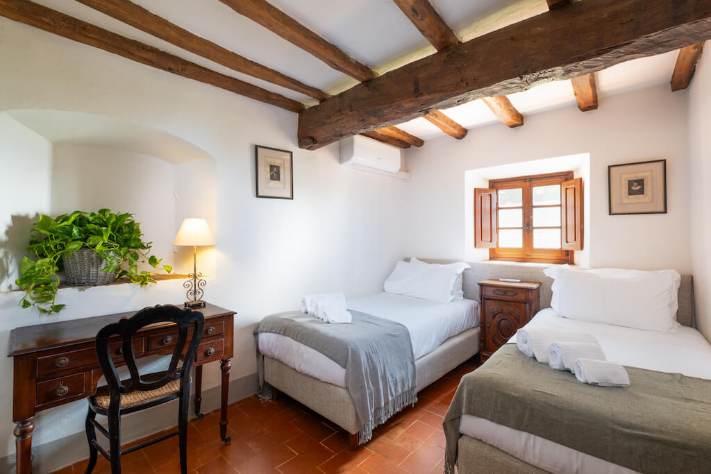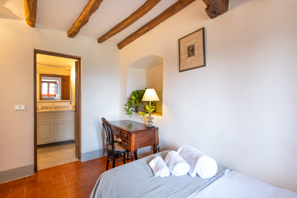 All six bedrooms are located on the first floor of Villa Corta. Here there is a master bedroom with kingsize bed and ensuite bathroom. There are then two further double bedrooms (one of which can be laid out with two single beds if you prefer), each with an ensuite bathroom. Further along the corridor there are two further bedrooms which can both be arranged either with two single beds or a large kingsize. These rooms share a bathroom. And finally, there is the final bedroom. This is located on a mezzanine level and again can be arranged with a kingsize bed or two single beds, as guests prefer. This room has an ensuite bathroom. There is a second living area on this floor with a huge fireplace and bookcase.