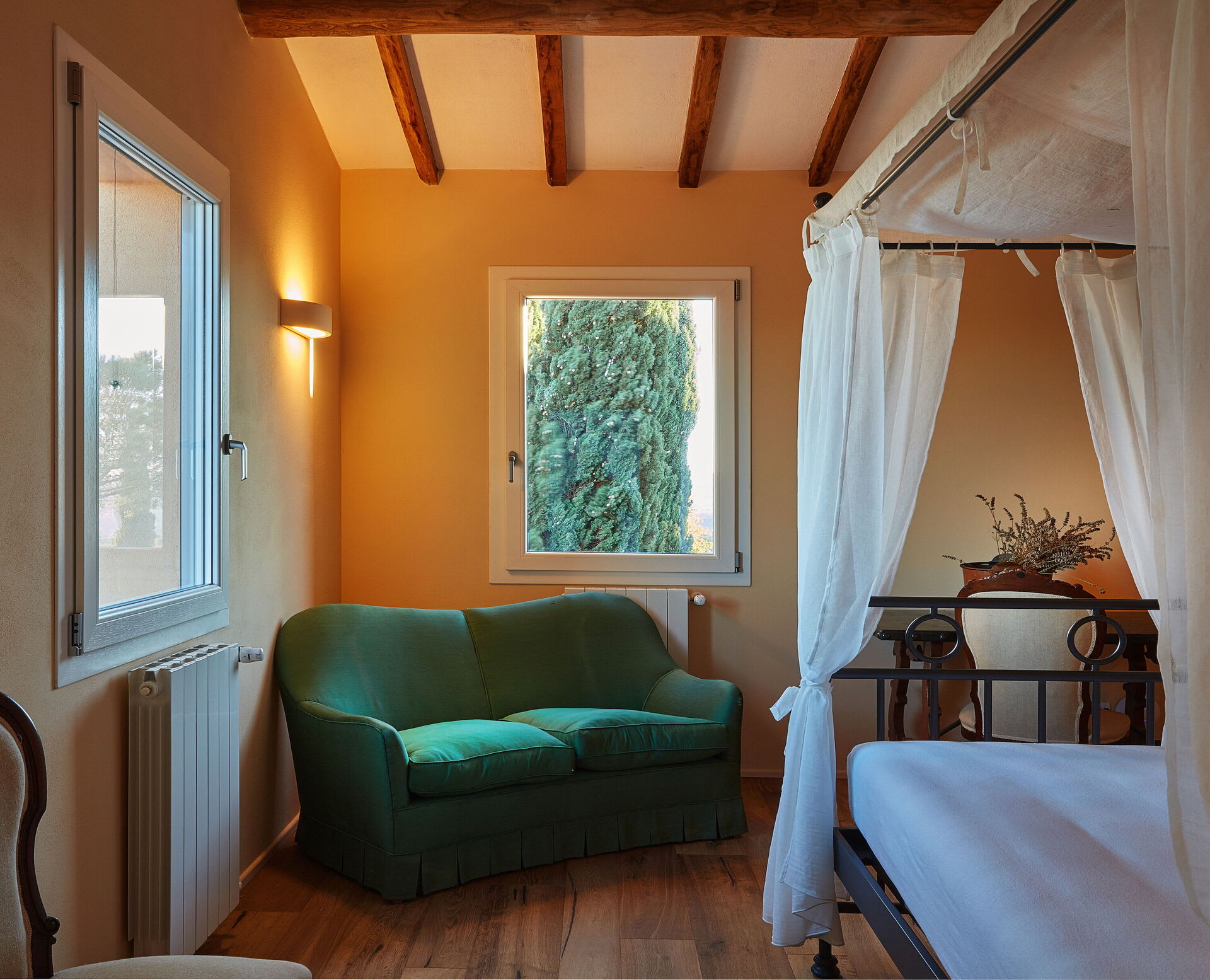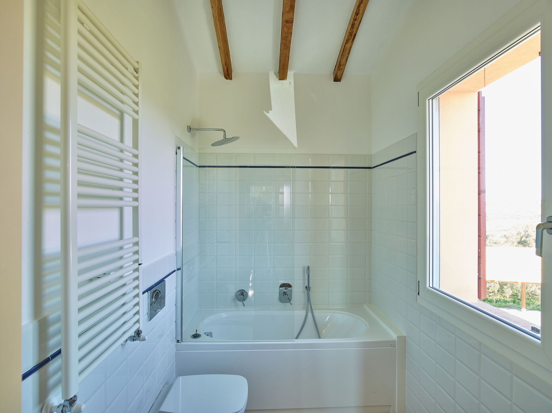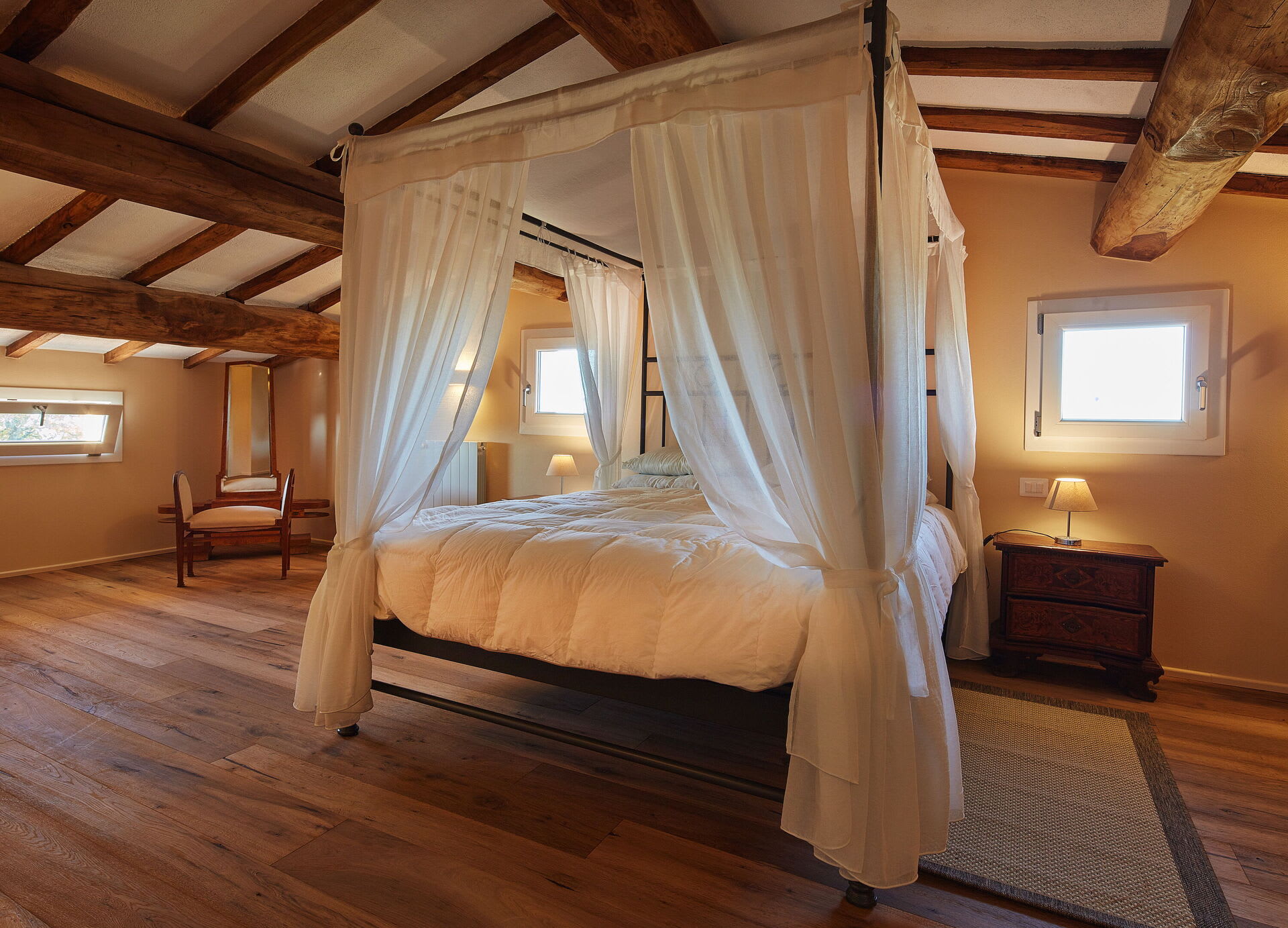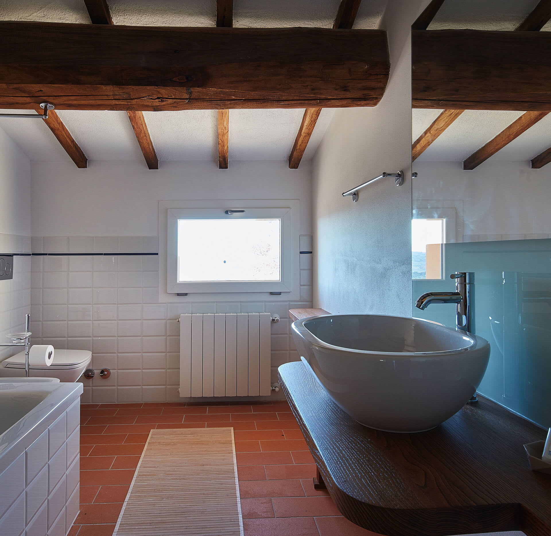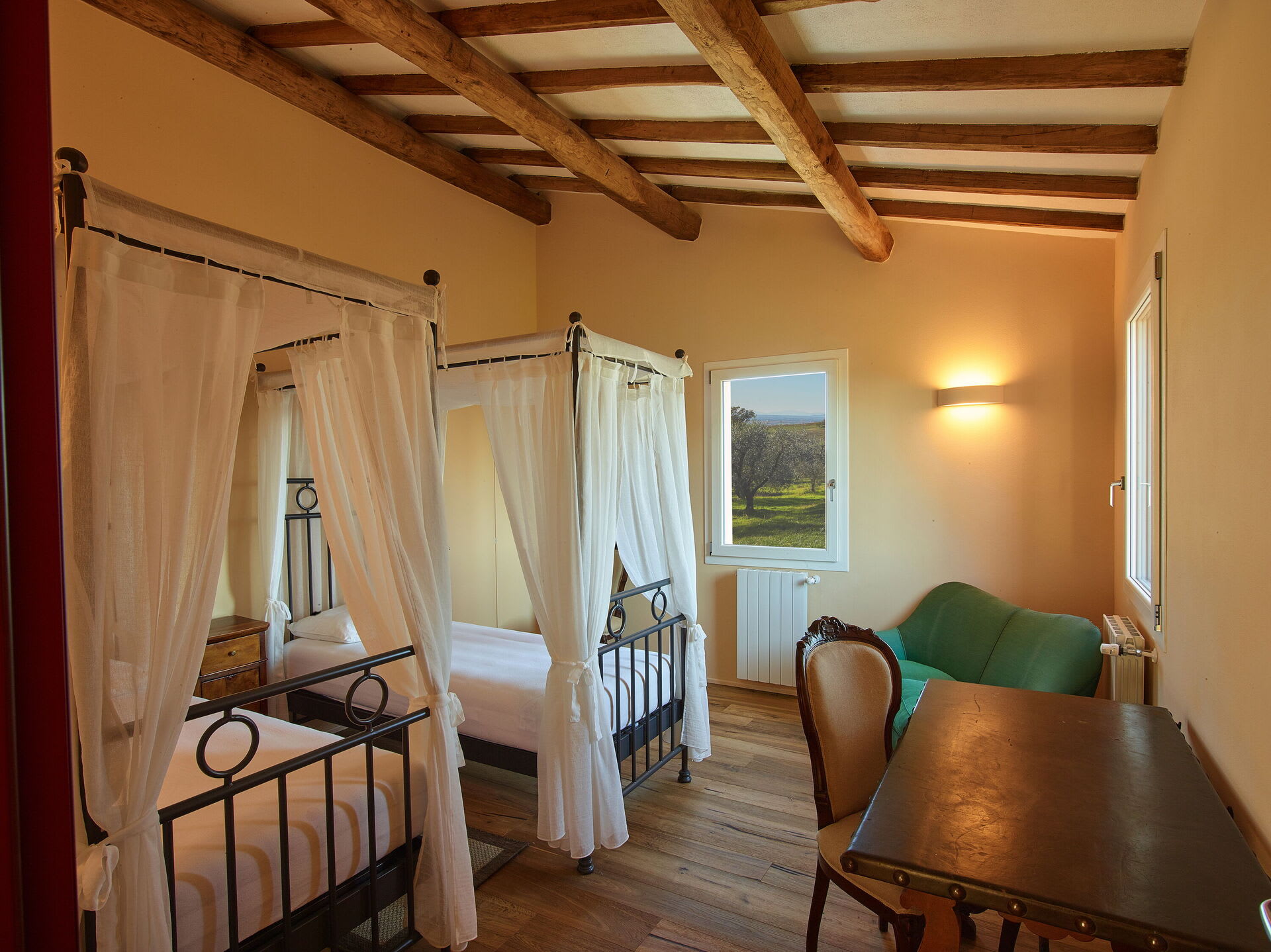 The villa blends modern comfort with rustic Tuscan charm. Rooms are spacious, elegant, bright and welcoming. French doors allow for a natural flow between the interior and exterior, bringing the light and the beauty of the surrounding countryside indoors, whilst the layout ensures that everyone can find their own quiet corner, while still enjoying the generous shared spaces of the living room, kitchen and dining area.