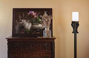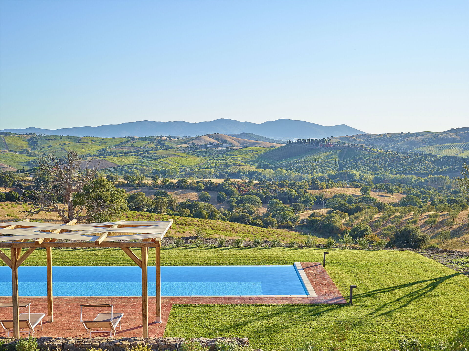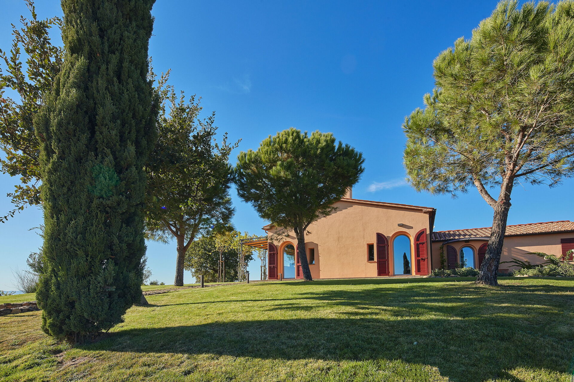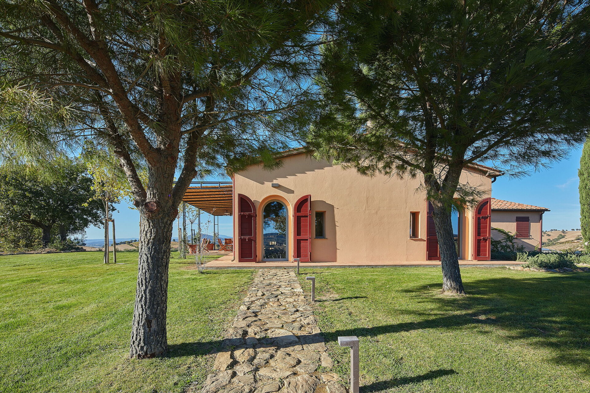 The villa is set on over ten hectares of private land, nestled in Tuscany's Maremma countryside. Perched on a hill, the property offers sweeping views of the surrounding hills, dotted with olive groves, fields and meadows. On clear days, you can even see the sea on the horizon. Closer to the house, a manicured garden laid with lawns is the perfect spot to relax outdoors, soak up the sun, or enjoy peaceful moments immersed in the tranquility of the countryside. The olive trees surrounding the villa create an authentically Tuscan atmosphere and ensure complete privacy.