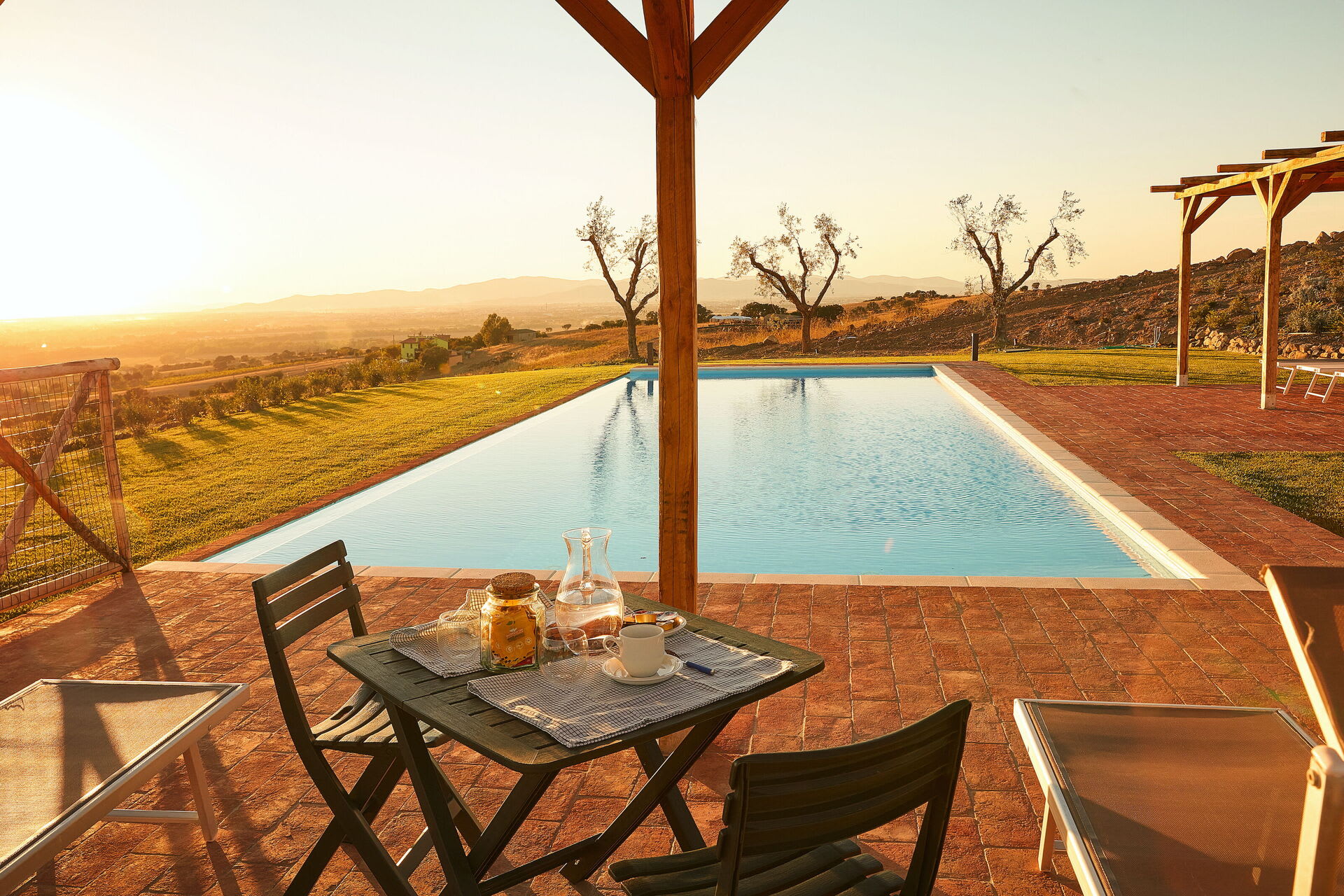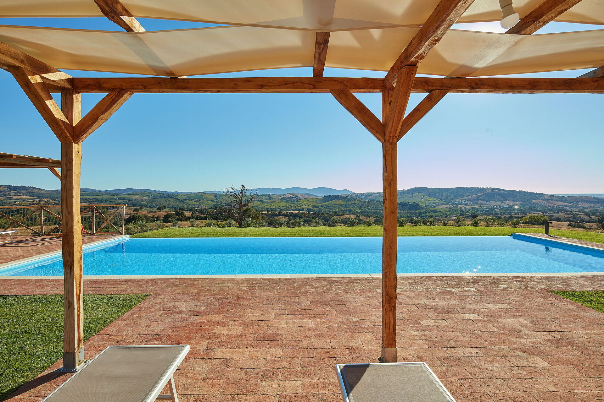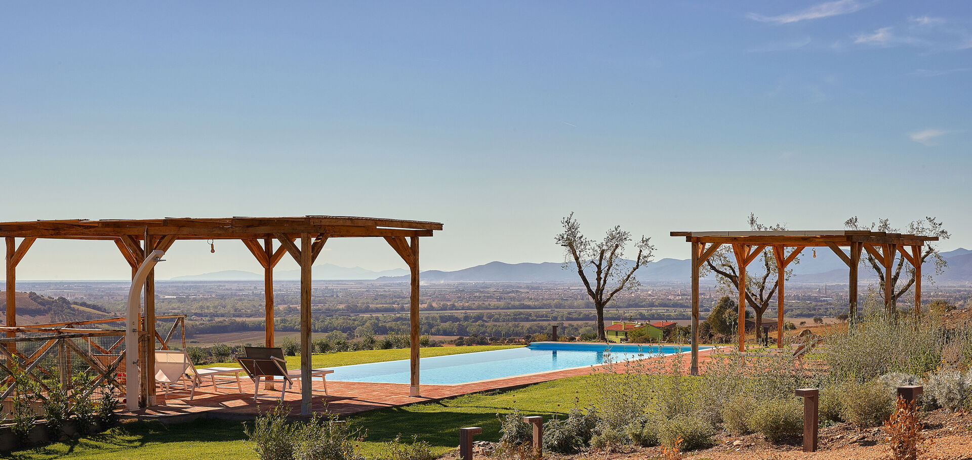 The private swimming pool (14 x 5 metres) is perfectly placed to make the most of the views. Around the pool, there are ample spaces for relaxation and outdoor living, perfect for reading, sunbathing, or simply enjoying the peace and calm.