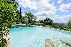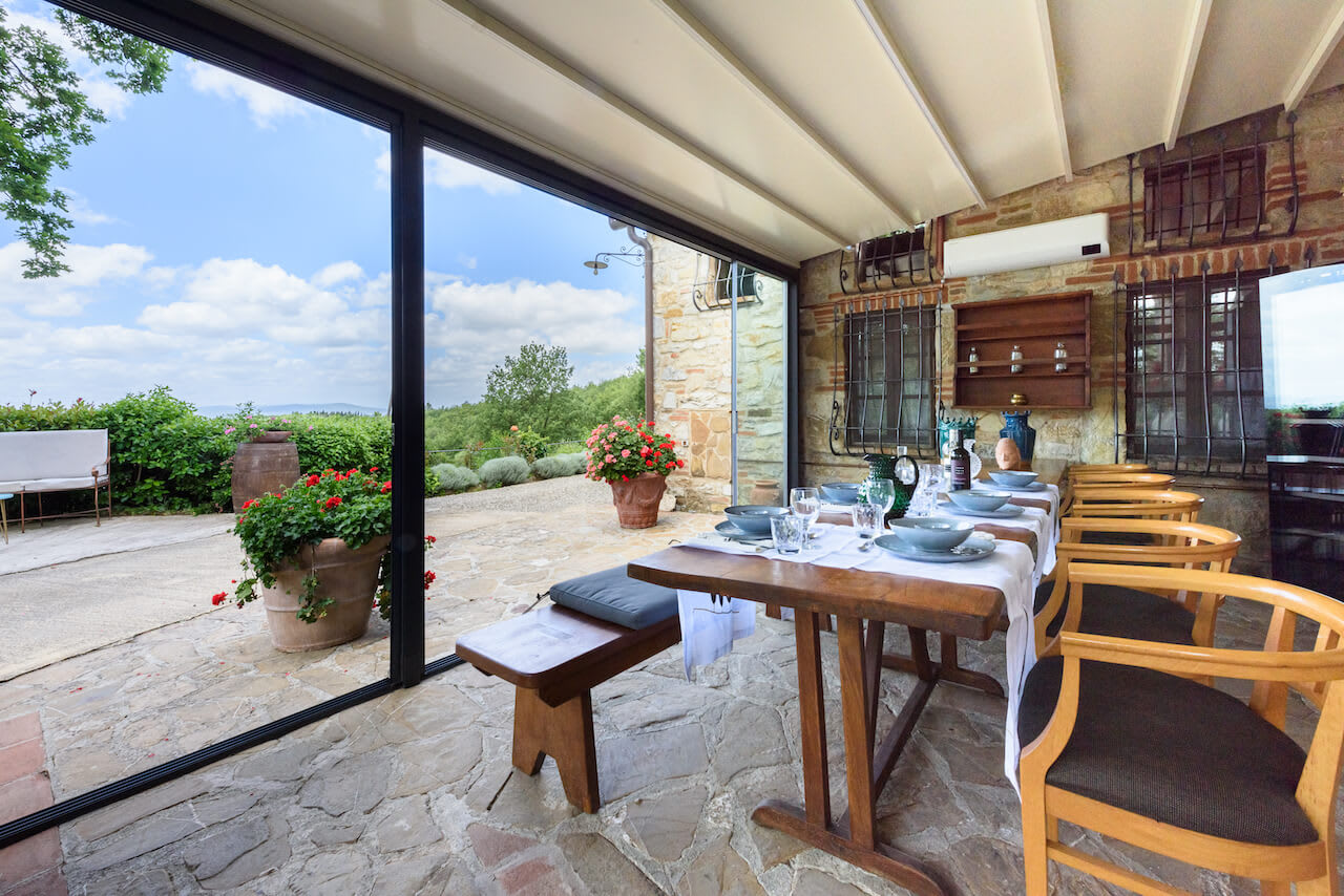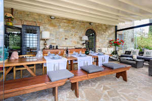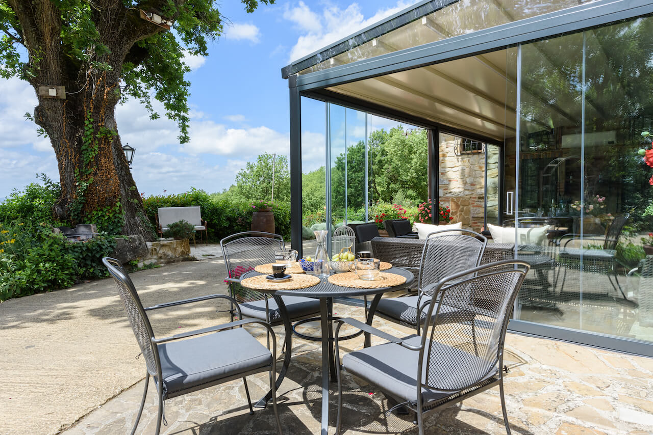 Outside, Villa Trega is set within a fully fenced garden. On the upper level of the garden sits an infinity swimming pool measuring 13 x 7 meters and with a depth of between 1 and 2.4 metres. It enjoys fantastic views over the surrounding countryside. It is surrounded by sun loungers and there is also an outdoor shower for guests to cool off in. The pool is open from April to October each year. Other amenities outside include a BBQ and a wood-fired pizza oven, perfect for al fresco dining. A glass enclosed verandah is furnished with a dining table seating up to 16 guests, as well as armchairs and sofas. It's an ideal spot for an aperitivo or for a place to enjoy your evening meal.