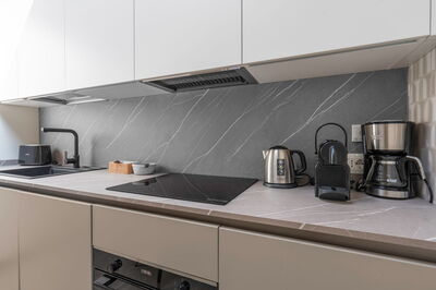The interior living space measures 55 square metres and the accommodation is arranged on one level. It comprises an open plan kitchen and dining room. The kitchen has sleek modern units and has both an induction hob and oven. Plenty of cookware is provided if you want to prepare meals rather than dining out. There is a circular table with four chairs in this area. The adjacent living room is furnished with a comfortable sofa bed arranged opposite a flat screen TV sits mounted on one wall. There are two bedrooms. One has a double bed whilst the second is small with just a single bed. Finally, there is a bathroom with shower in the property.