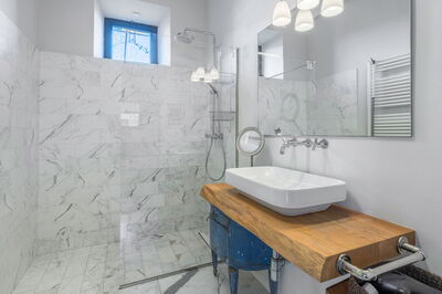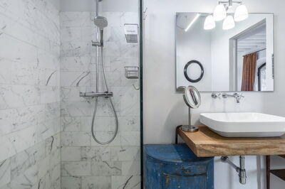 The accommodation in Apartment Linda consists of a large open plan living, dining and kitchenette area. This is a wonderfully inviting space which is elegantly furnished. The kitchenette is small but is equipped with induction hob, refrigerator, microwave, kettle and American coffee maker, whilst there is a wooden table for meals together. A large grey sofa and comfortable armchair creates a cosy atmosphere in the living area whilst colourful artworks and decorative pieces add character and charm. Guests have a large double bedroom to enjoy too. This is beautifully furnished, whilst stylish black and white prints adorn the walls. A modern bathroom with generous sized shower finishes the interior accommodation.