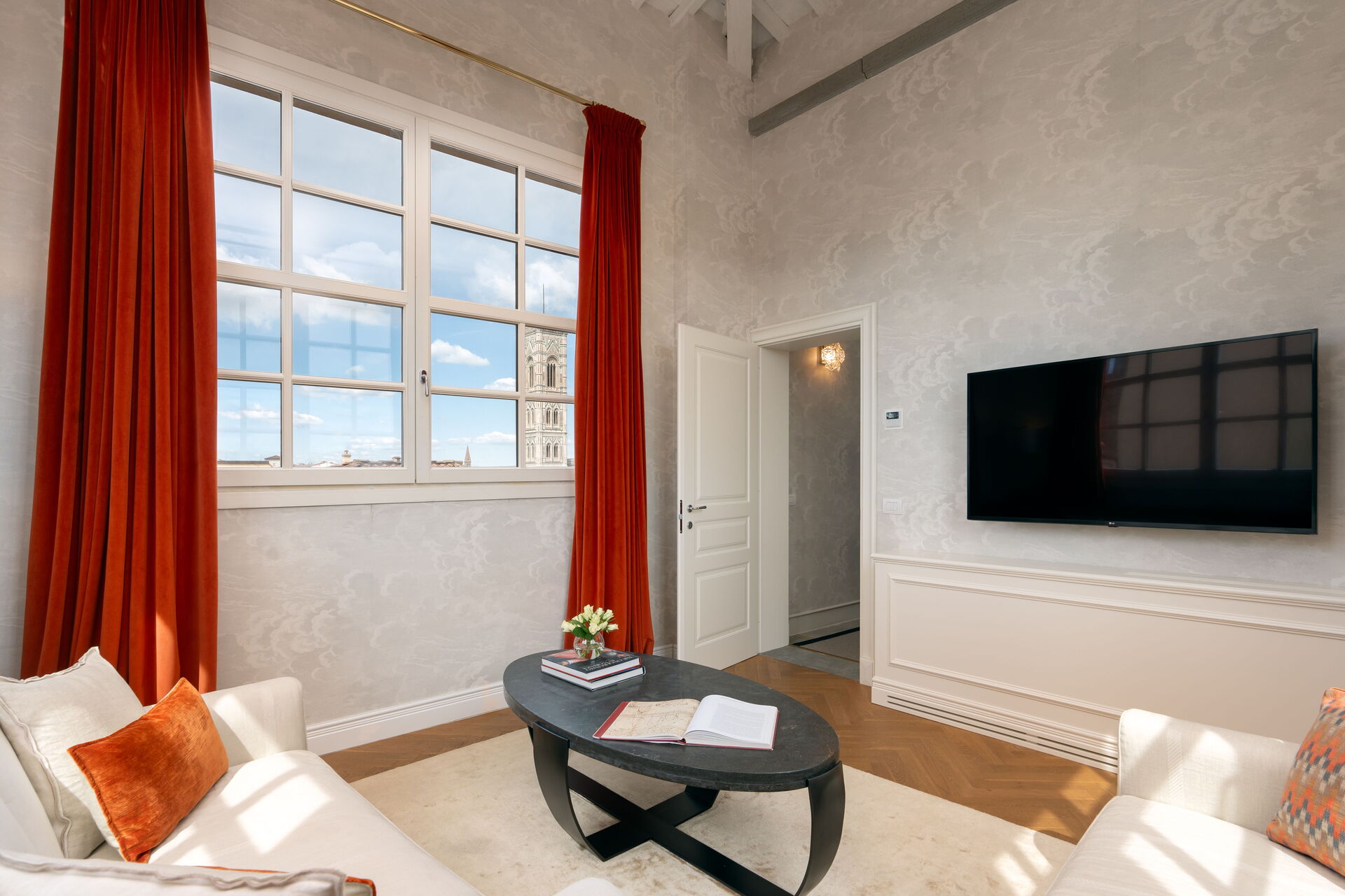 Inside, accommodation is arranged over the four floors of the tower. On the top floor are the two bedrooms. Both are immaculately presented and furnished with queen size beds and 50 inch SMART TV. Please note that the ceiling height in these rooms is limited in places and much lower than elsewhere in the apartment. There is also a bathroom with shower on this floor. On each of the two levels below guests will find cosy living rooms. The first is a stunning room with multiple windows making the most of the views over the Florence rooftops and across to the Duomo. The second living area is smaller but also works well as a workspace since there is a desk as well as a sofa here. This can also be turned into a third bedroom if you are a group of five. In addition, there is a second bathroom on this floor. Finally, on the lower level, guests will find a stylish, well equipped kitchen and dining area. This is a cosy space but ideal for preparing meals and dining together.