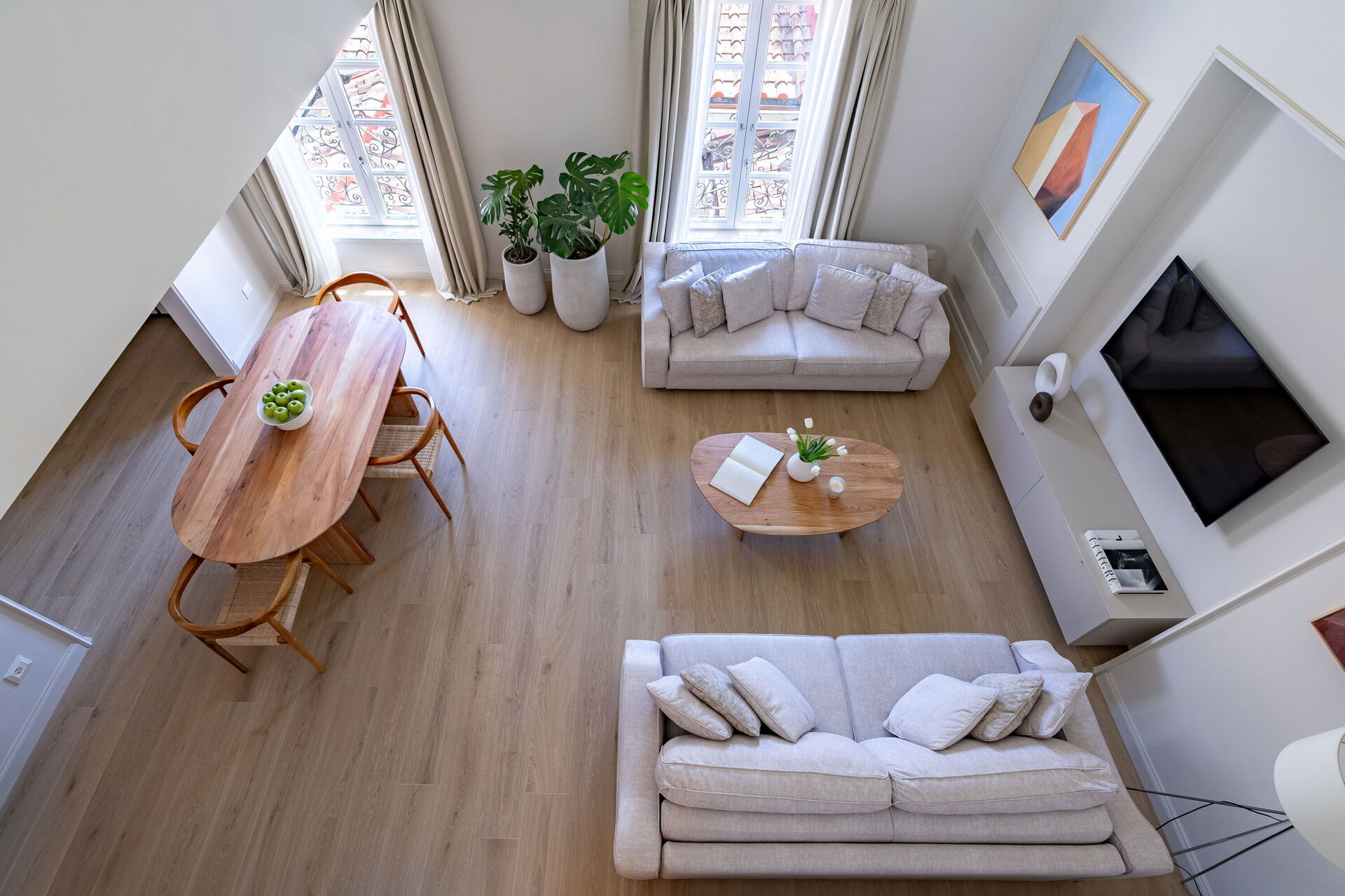 The interior living space measures 73 square metres. The heart of the property is the open plan living, dining and kitchen area. To one side of this room, two comfortable sofas are arranged facing each other across a central coffee table. One of these can be used as a sofa bed if required. A large TV sits on the wall. A large wooden oval dining table seating four sits in the middle of the room. Windows open from this room onto the street below. And then to the other side of this space is the well equipped kitchen. The double bedroom is upstairs. Please note that this is in a loft area and so ceiling heights are lower here. Finally, there is a bathroom with shower.