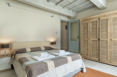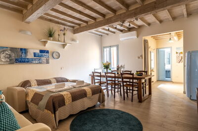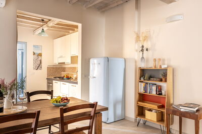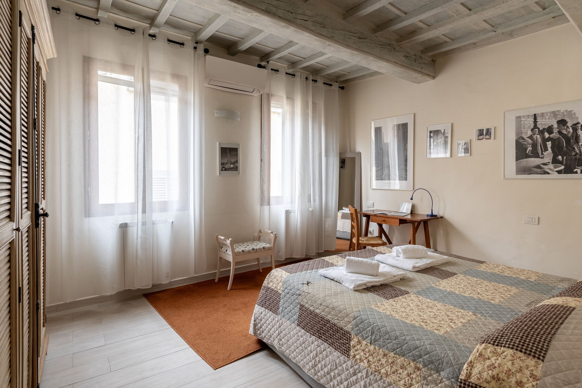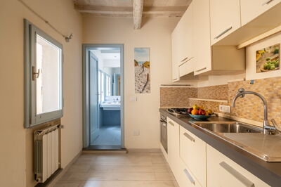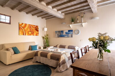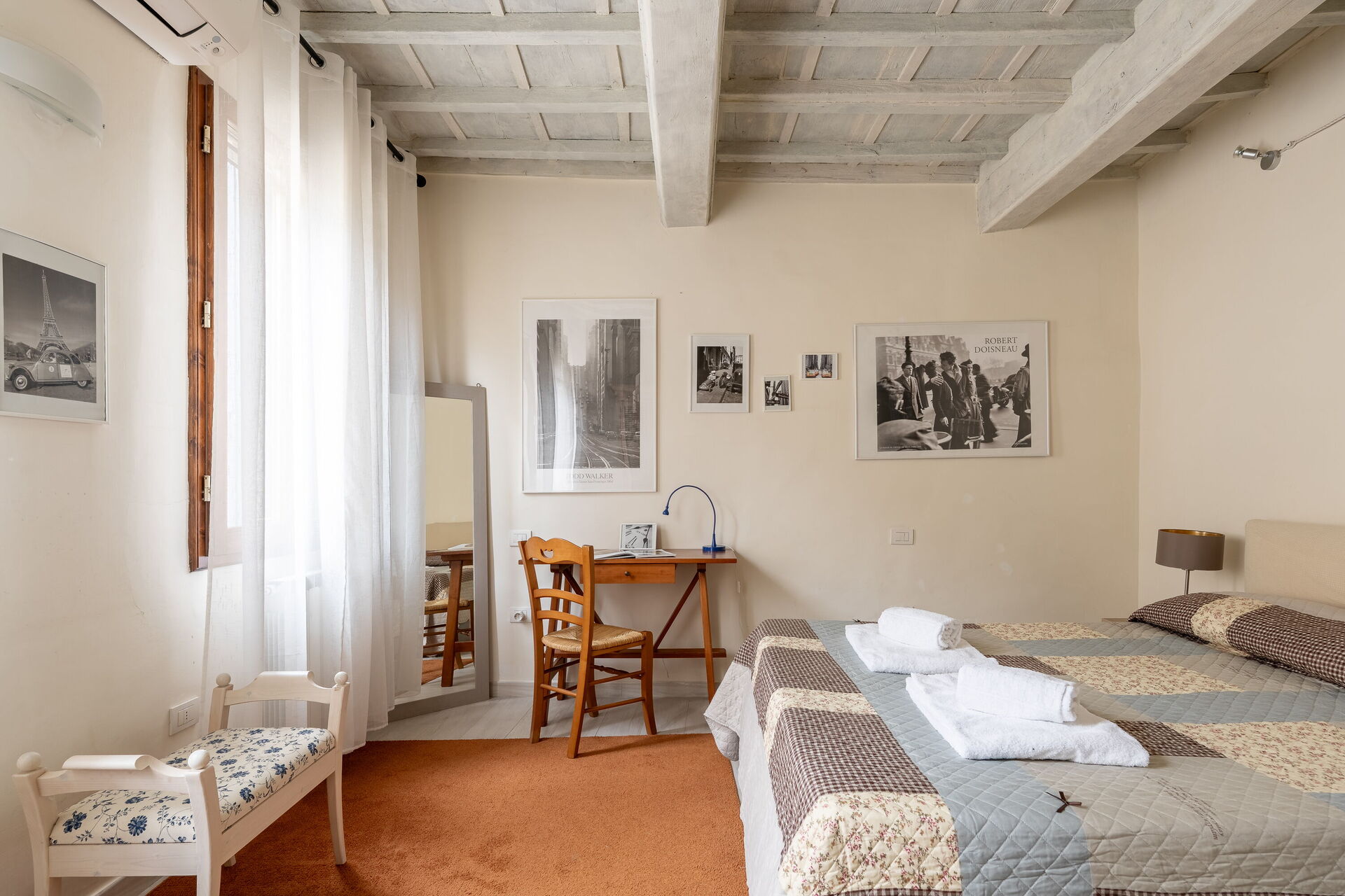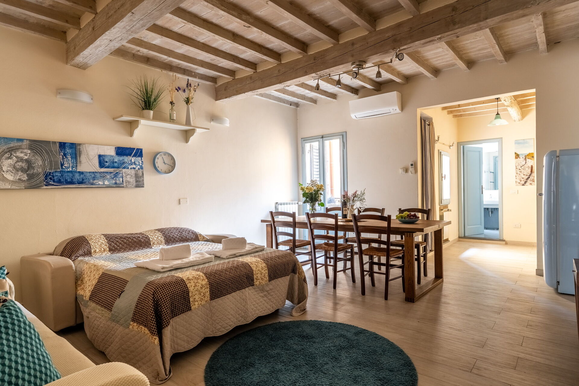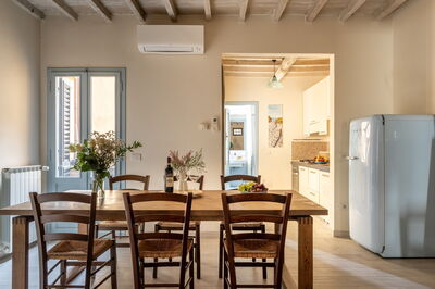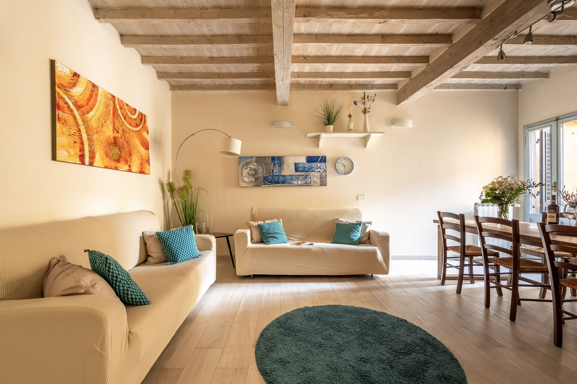 The apartment offers bright, well-distributed rooms, ideal for both short and long stays. The furnishings combine traditional Tuscan charm with modern day comfort, ensuring a warm and relaxing atmosphere. Cream walls sit elegantly alongside wooden beamed ceilings.