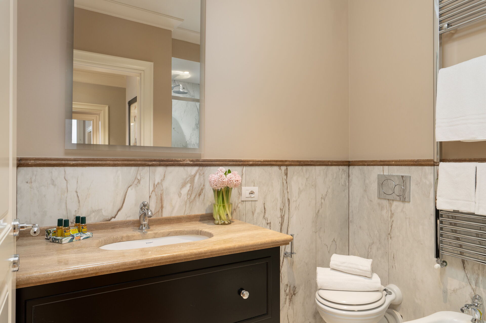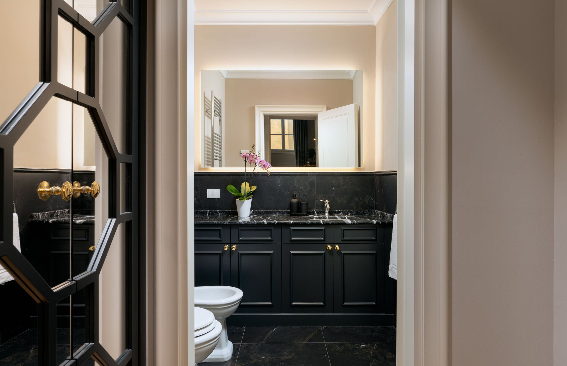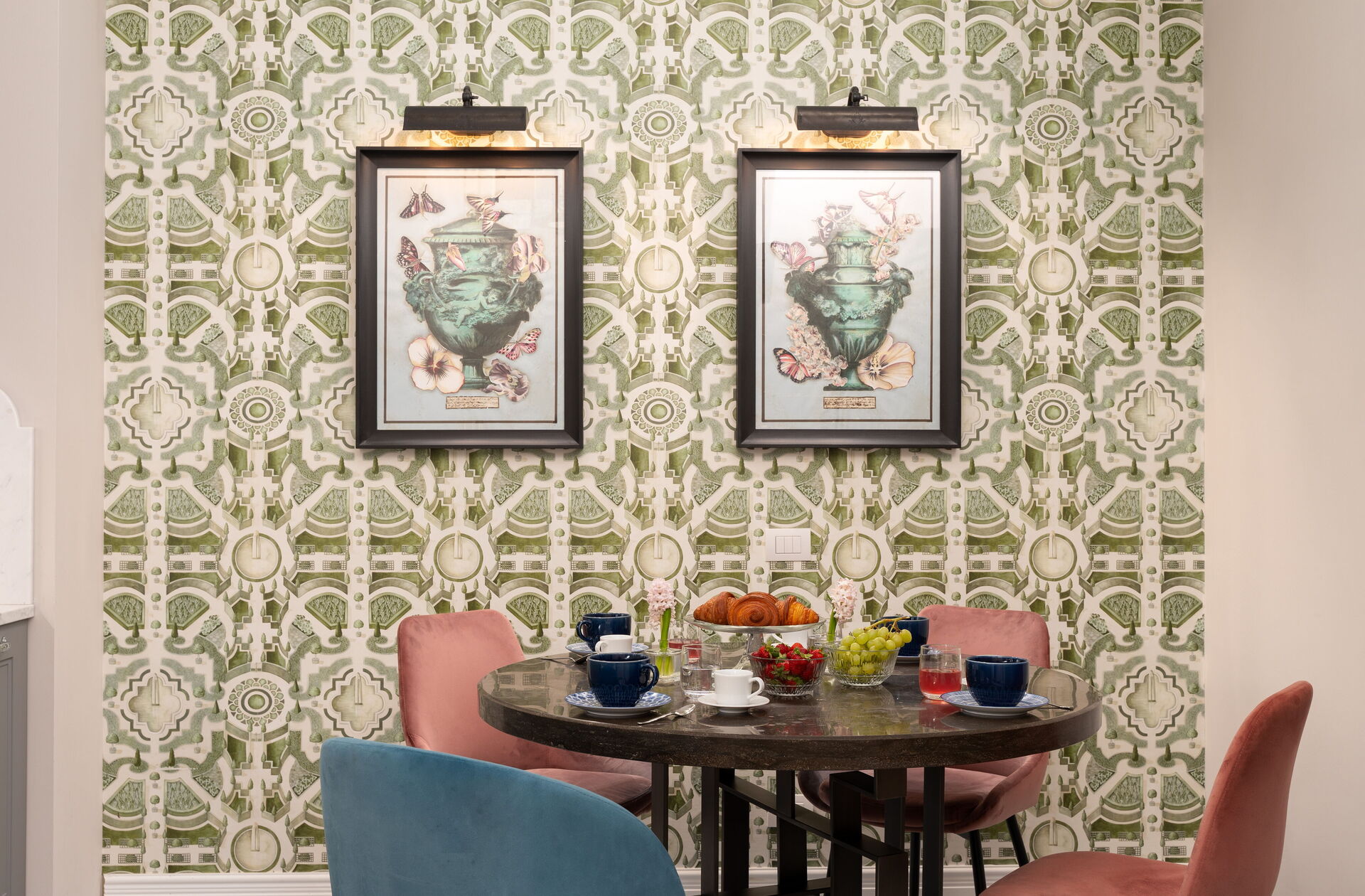 A stunning living room, embellished with original 16th century frescoes, offers a unique and elegant atmosphere in which to relax. Here you will find a magnificent dining table for 10 people, comfortable seating and a 60-inch SMART TV for evenings of pure entertainment. The property also has a lobby for business calls or meetings.