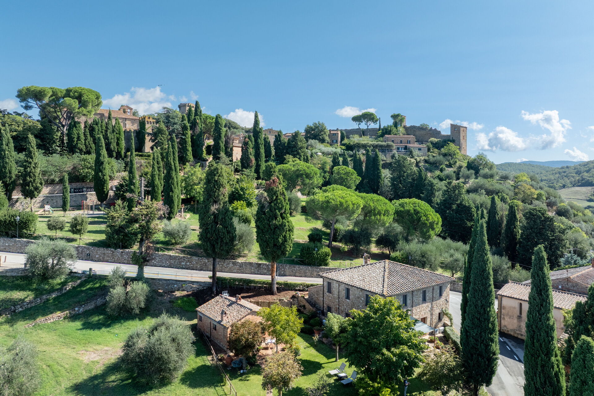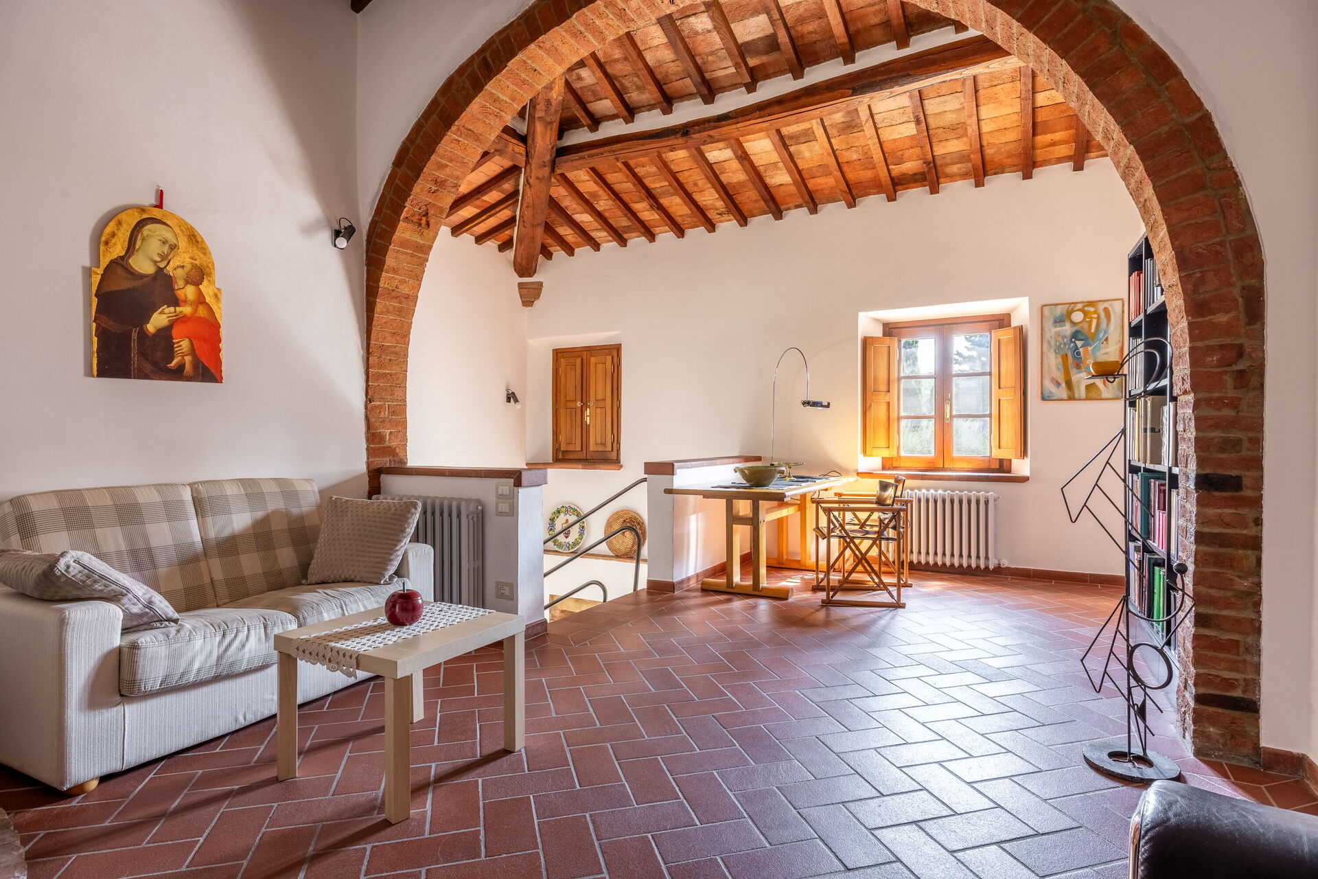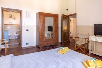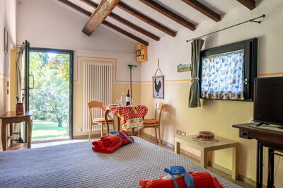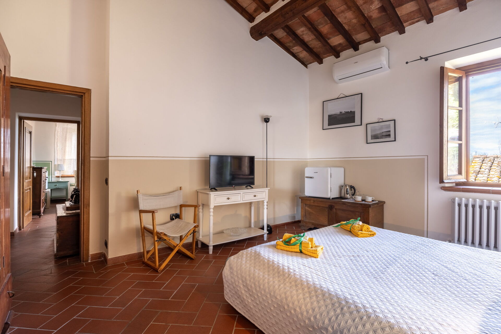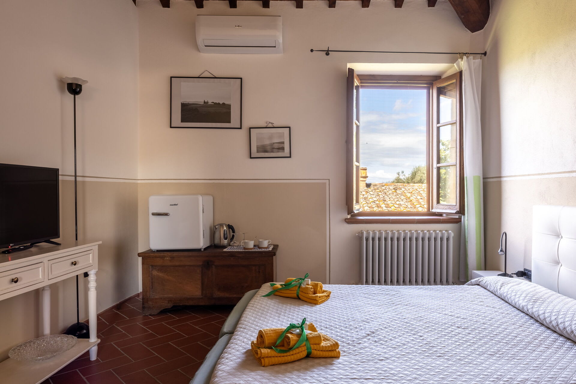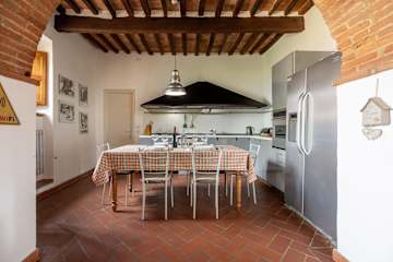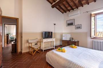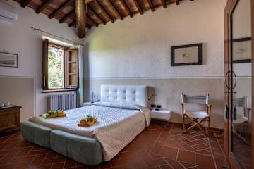 The main villa combines the best of Tuscan traditions with modern 21st century comforts. On the ground level of the villa, there is a kitchen and living area as well as a small study area for those needing to catch up on emails. The bedrooms are all arranged over the first floor of the property. Here, there are three double bedrooms, each with ensuite bathroom. All rooms are fully air conditioned and each bedroom has its own minibar too.