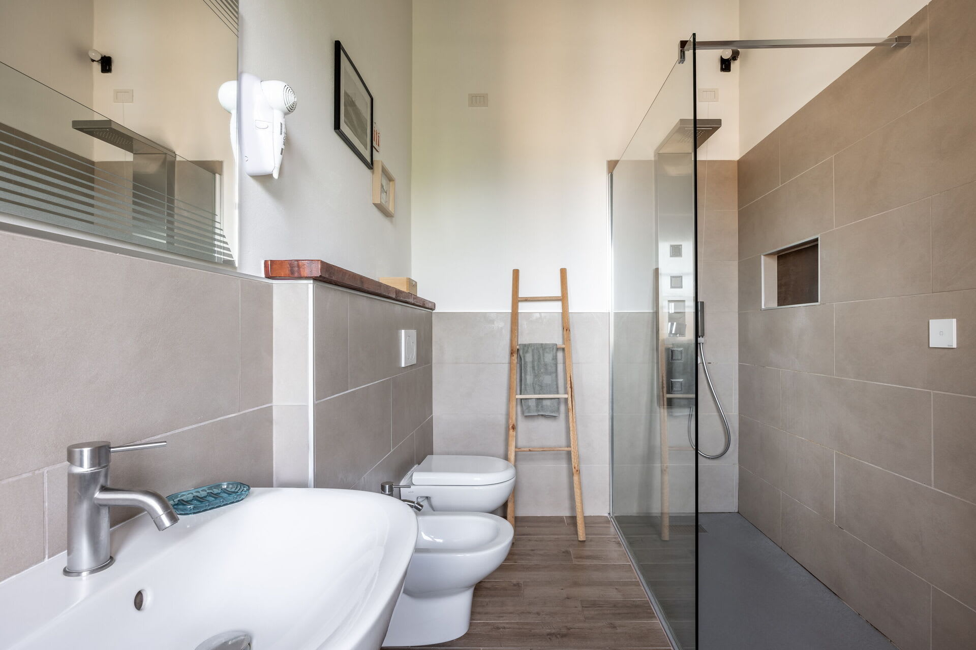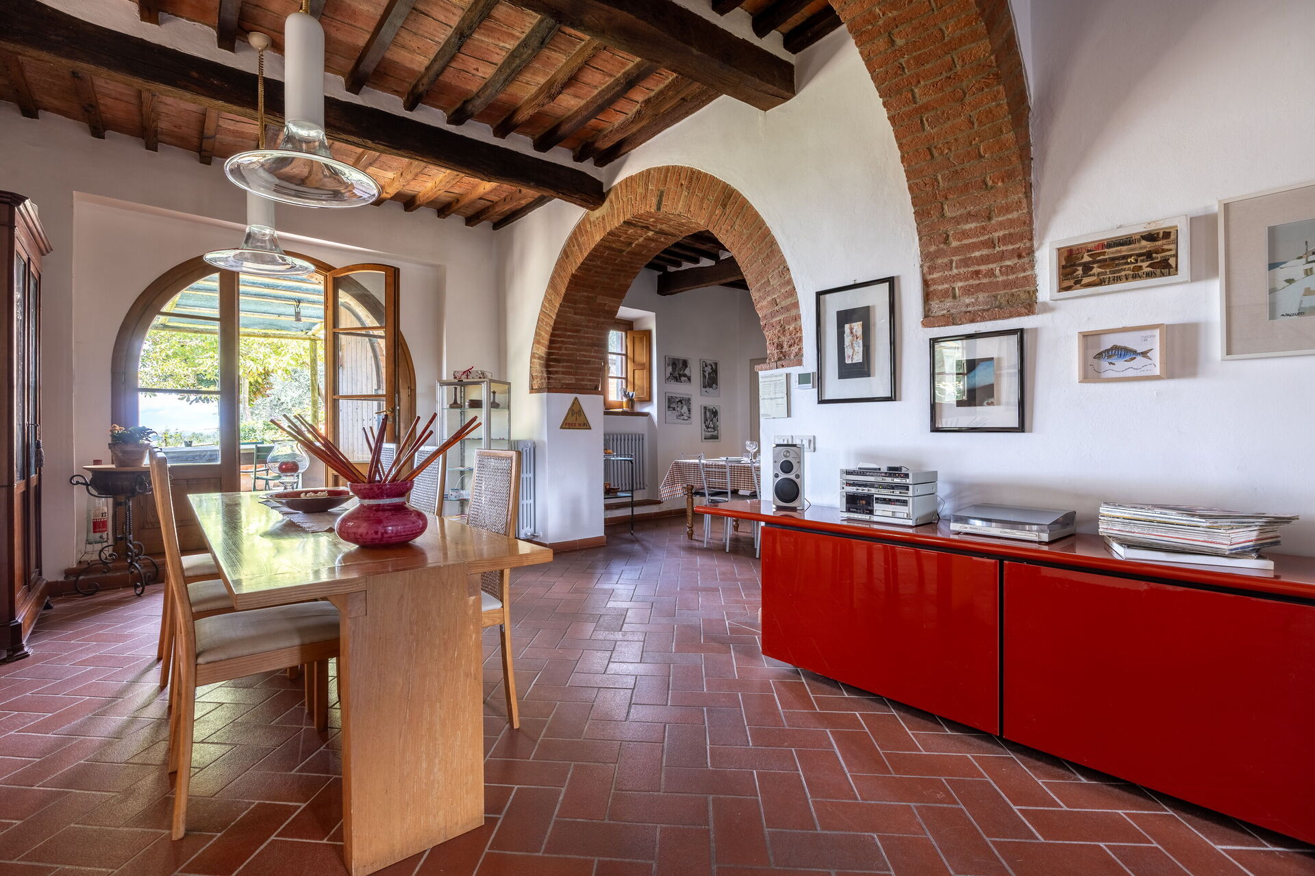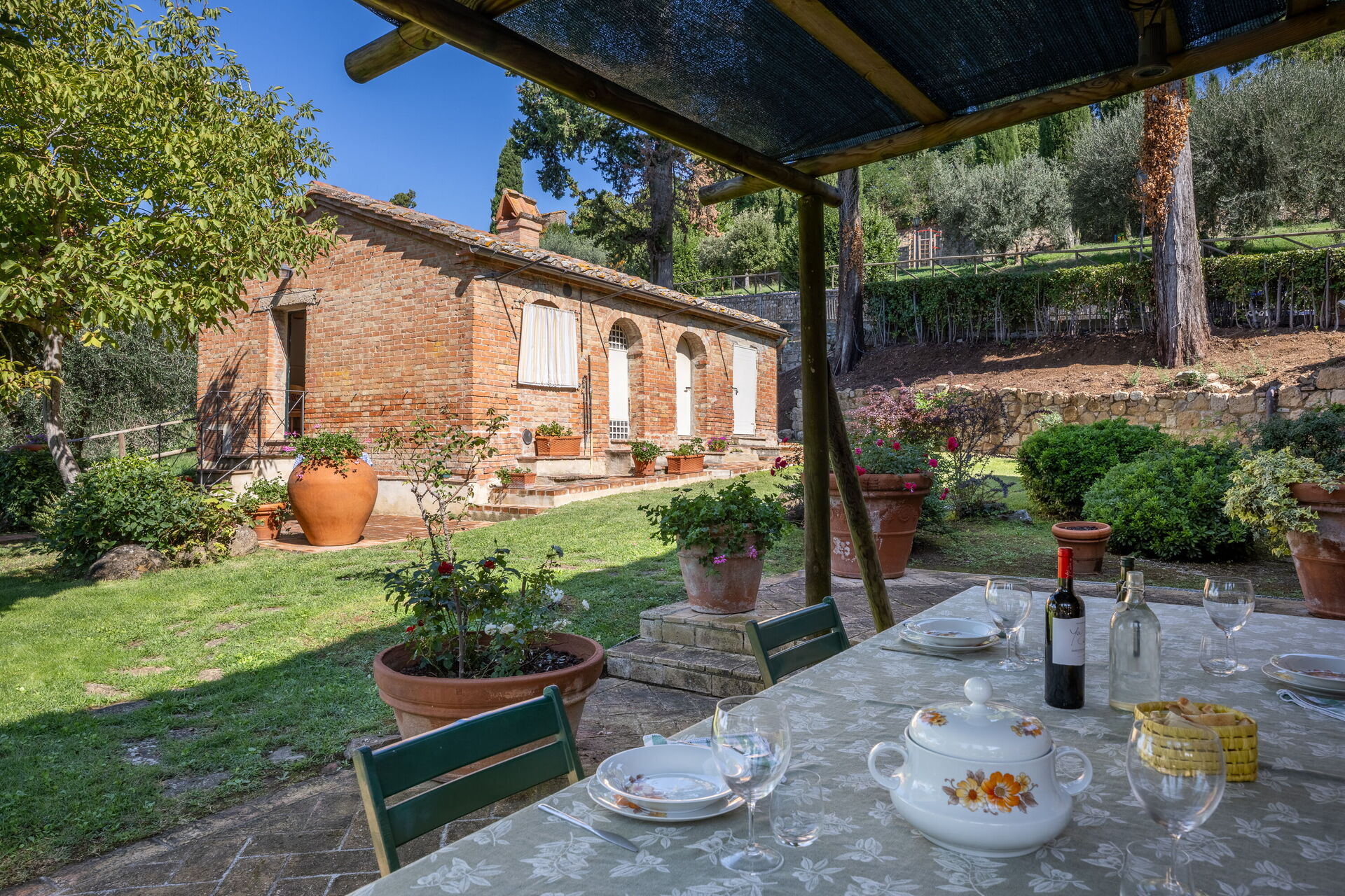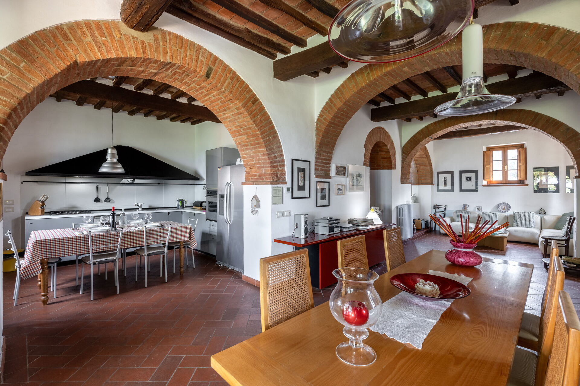 The main villa combines the best of Tuscan traditions with modern 21st century comforts. On the ground level of the villa, there is a kitchen and living area as well as a small study area for those needing to catch up on emails. The bedrooms are all arranged over the first floor of the property. Here, there are three double bedrooms, each with ensuite bathroom. All rooms are fully air conditioned and each bedroom has its own minibar too.