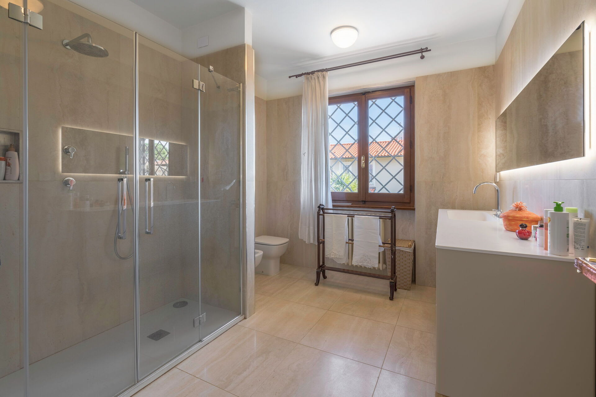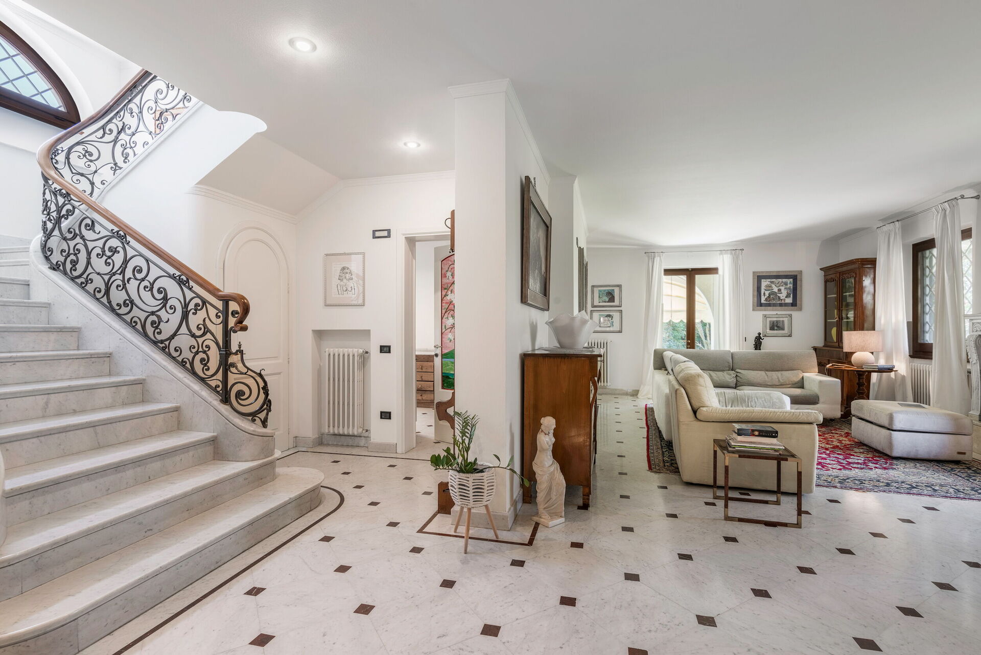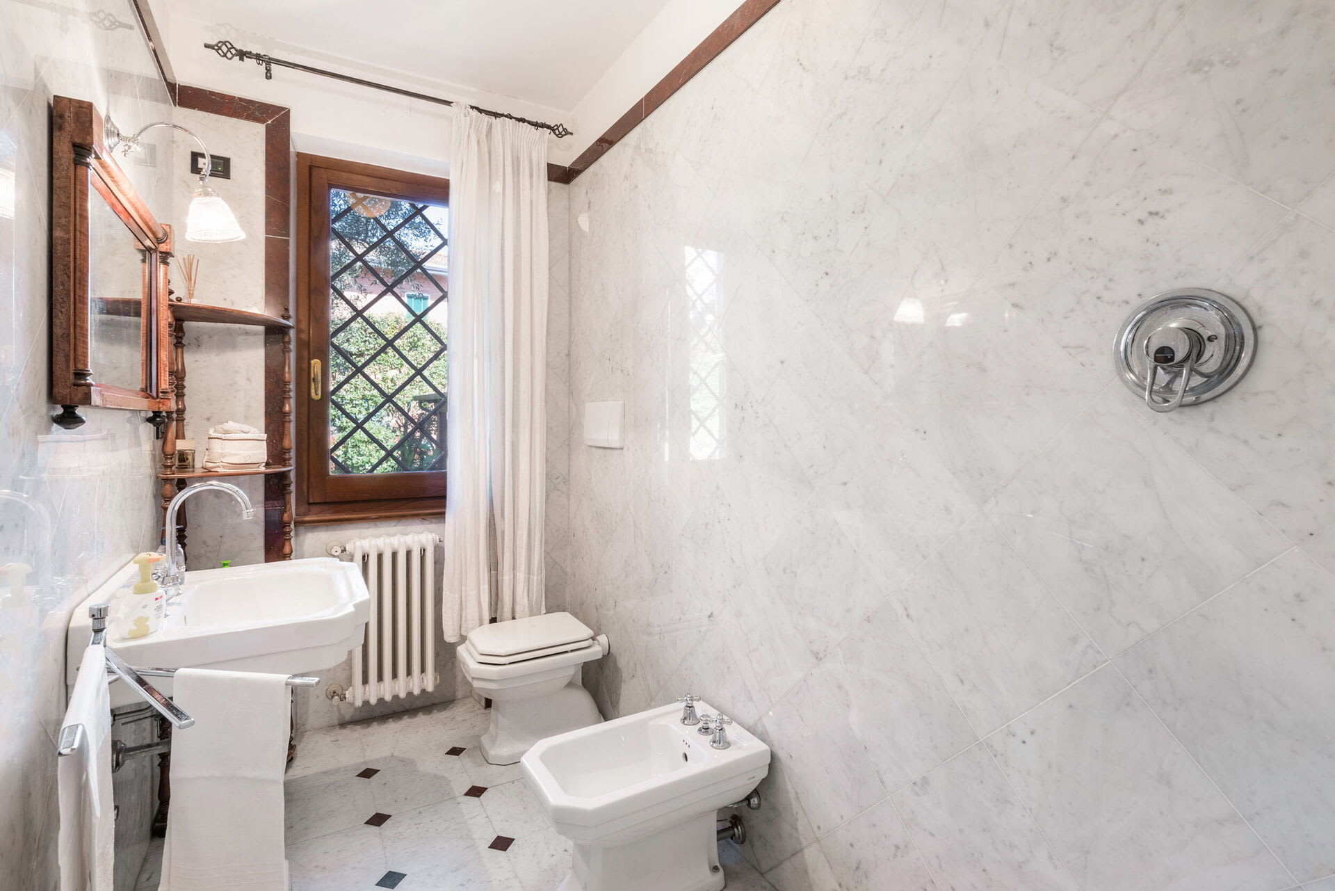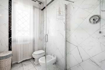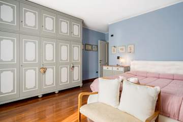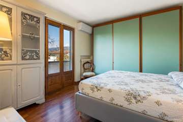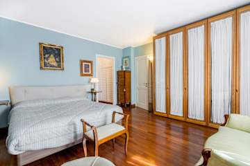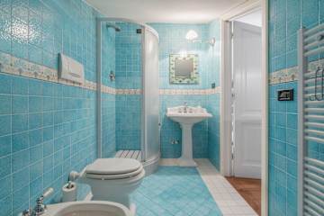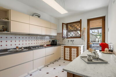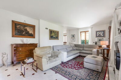 The interior living space is spread over three floors and measures approximately 350 square metres. Furnishings throughout are classic and elegant. As you enter Villa Marmi, you will find two well-furnished living rooms. The first has a comfortable sofa and study area furnished with a desk. The other features a fireplace and is furnished with sofas and armchairs. This room also enjoys direct access to the garden. Also on the ground floor you will find a spacious kitchen, well equipped with coffee machine, toaster, dishwasher and oven. Next to the kitchen you will find a charming dining room with oval table and elegant glass cabinet. There is also a double bedroom and a bathroom with shower on this floor.