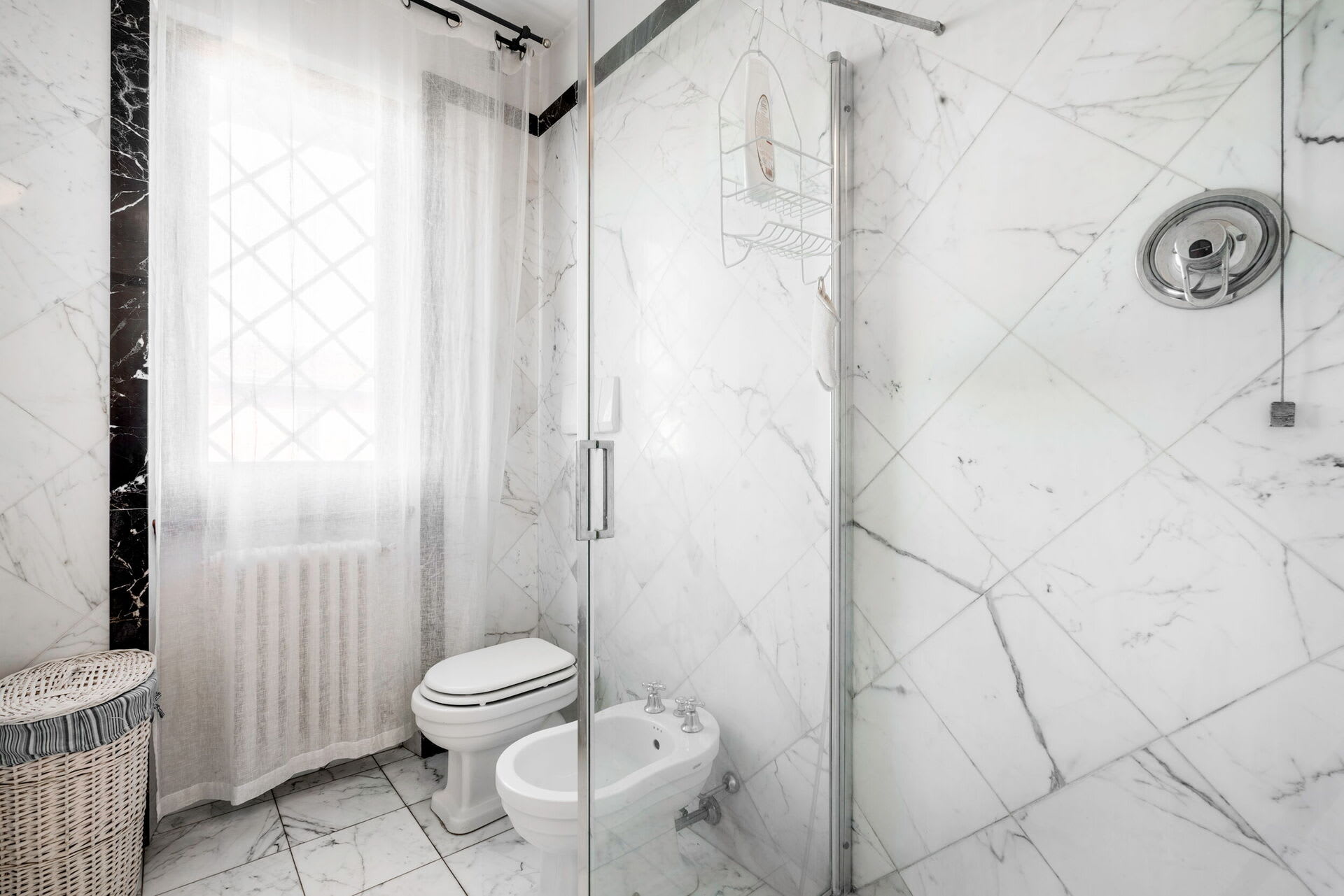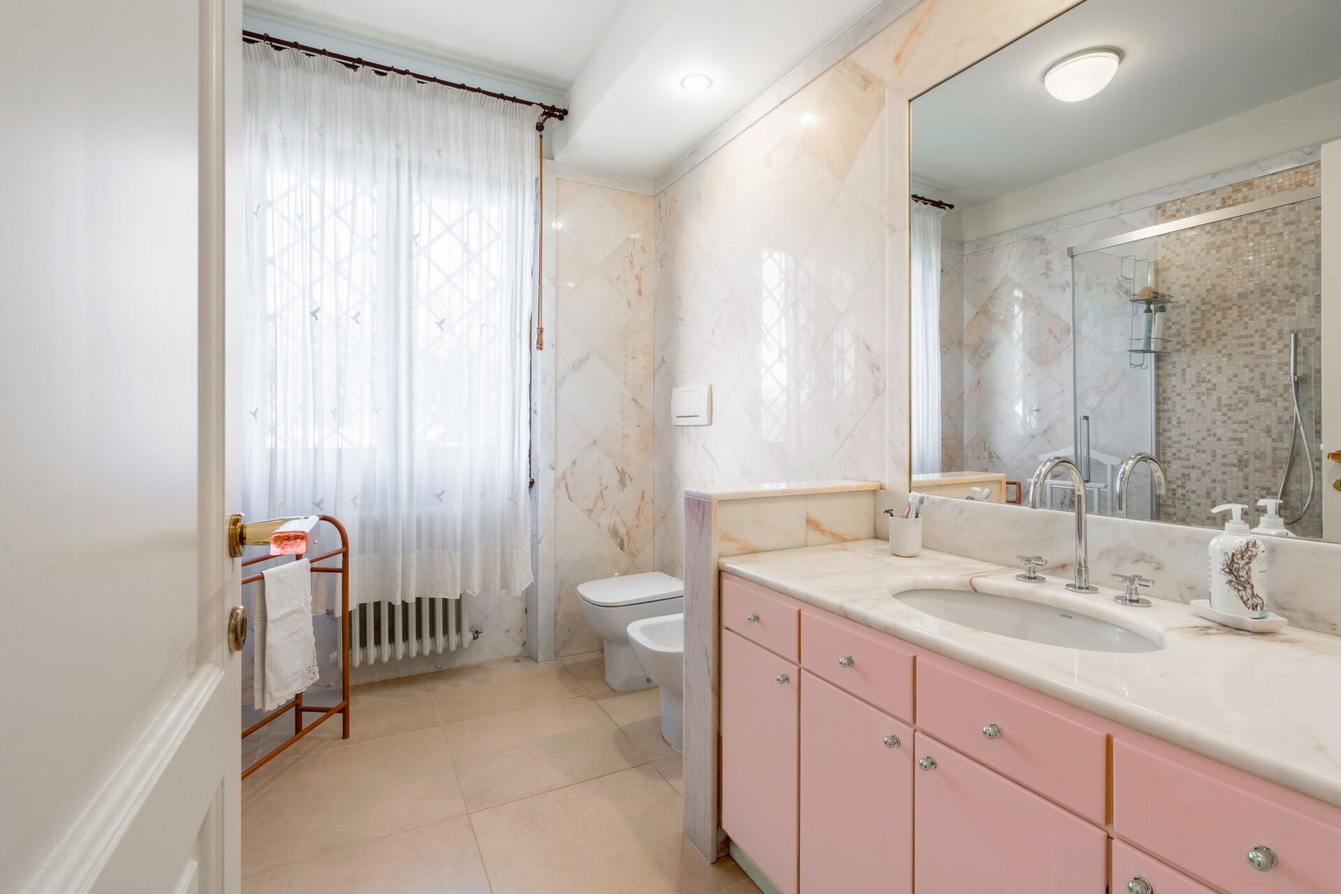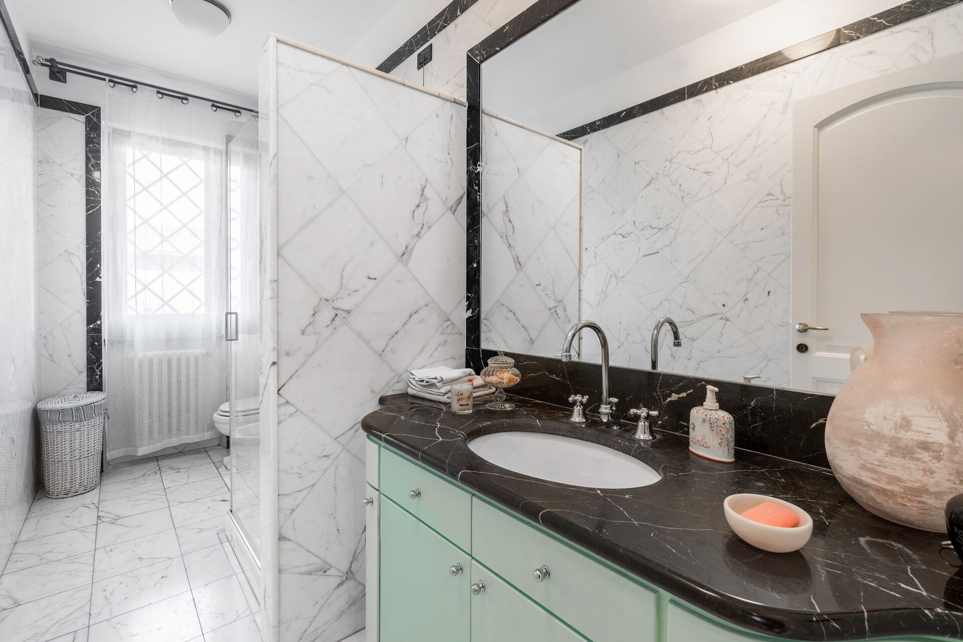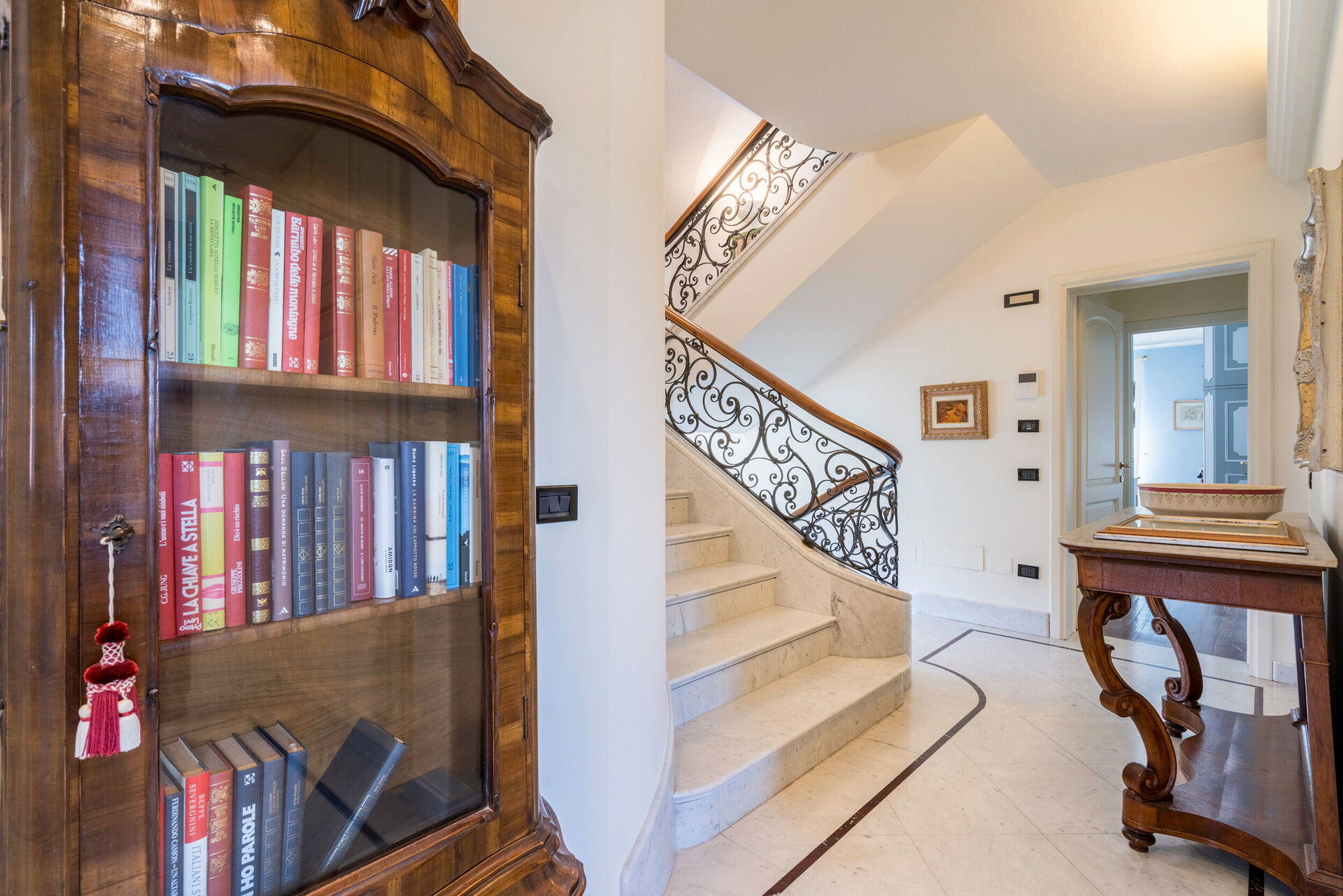 The interior living space is spread over three floors and measures approximately 350 square metres. Furnishings throughout are classic and elegant. As you enter Villa Marmi, you will find two well-furnished living rooms. The first has a comfortable sofa and study area furnished with a desk. The other features a fireplace and is furnished with sofas and armchairs. This room also enjoys direct access to the garden. Also on the ground floor you will find a spacious kitchen, well equipped with coffee machine, toaster, dishwasher and oven. Next to the kitchen you will find a charming dining room with oval table and elegant glass cabinet. There is also a double bedroom and a bathroom with shower on this floor.