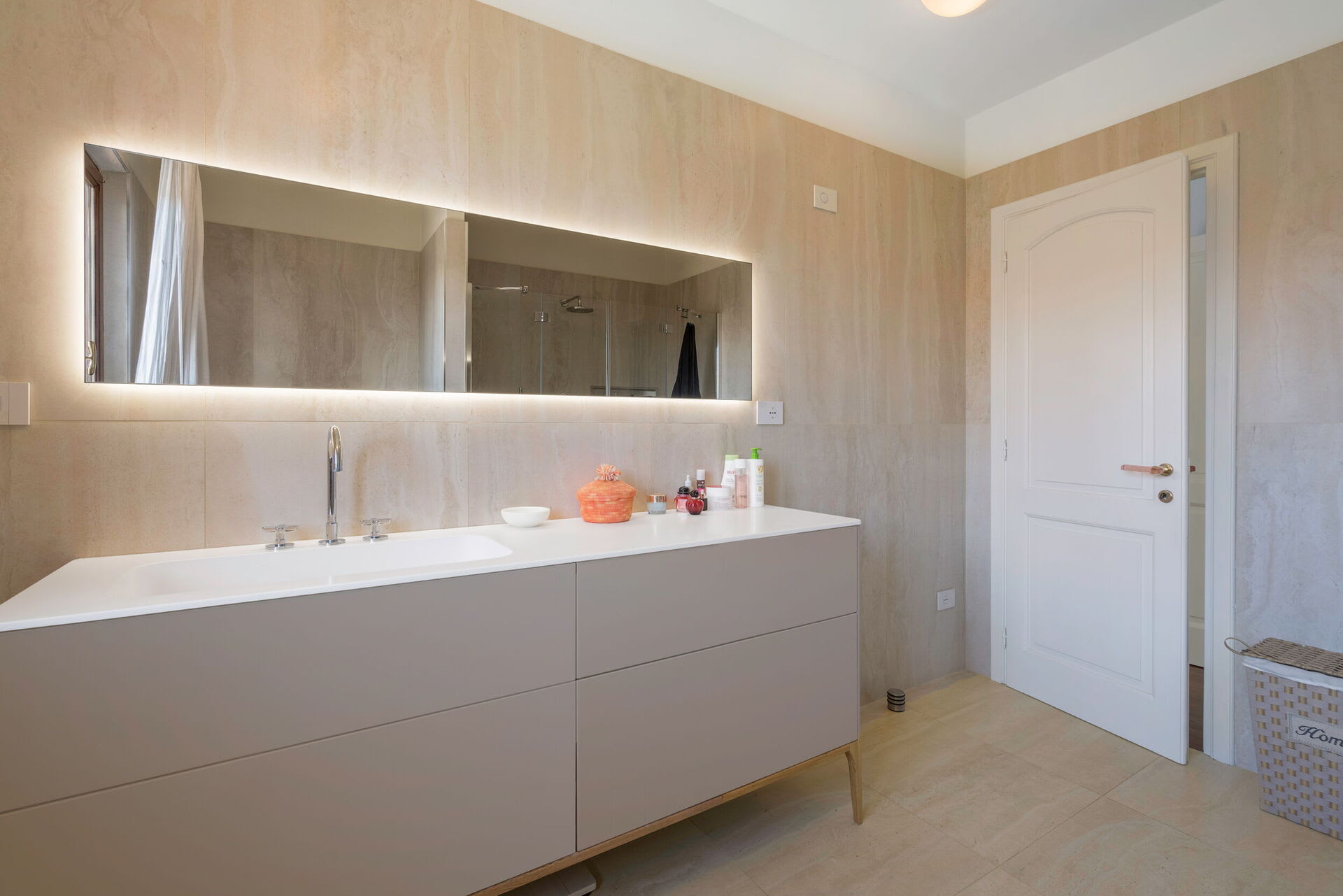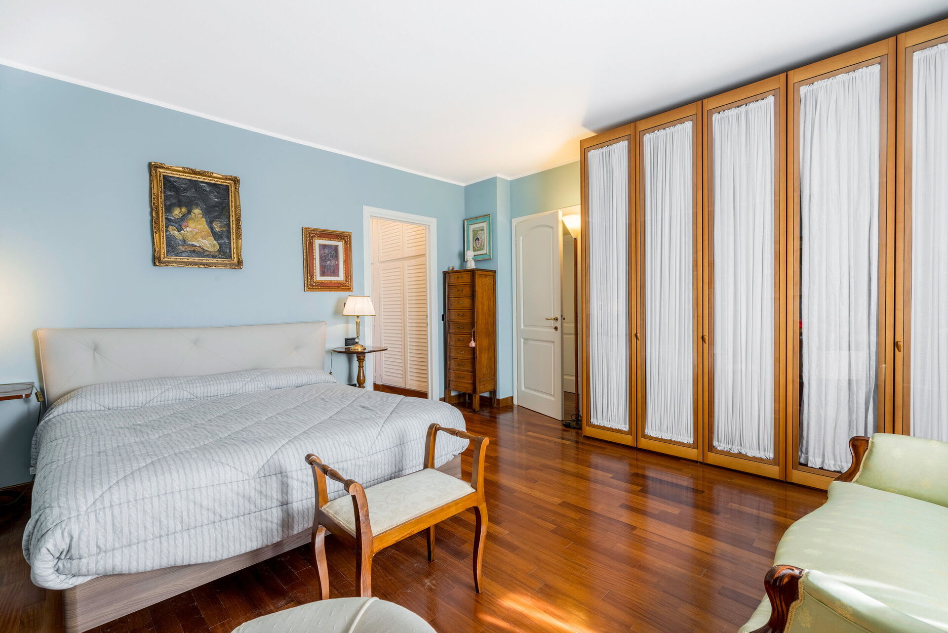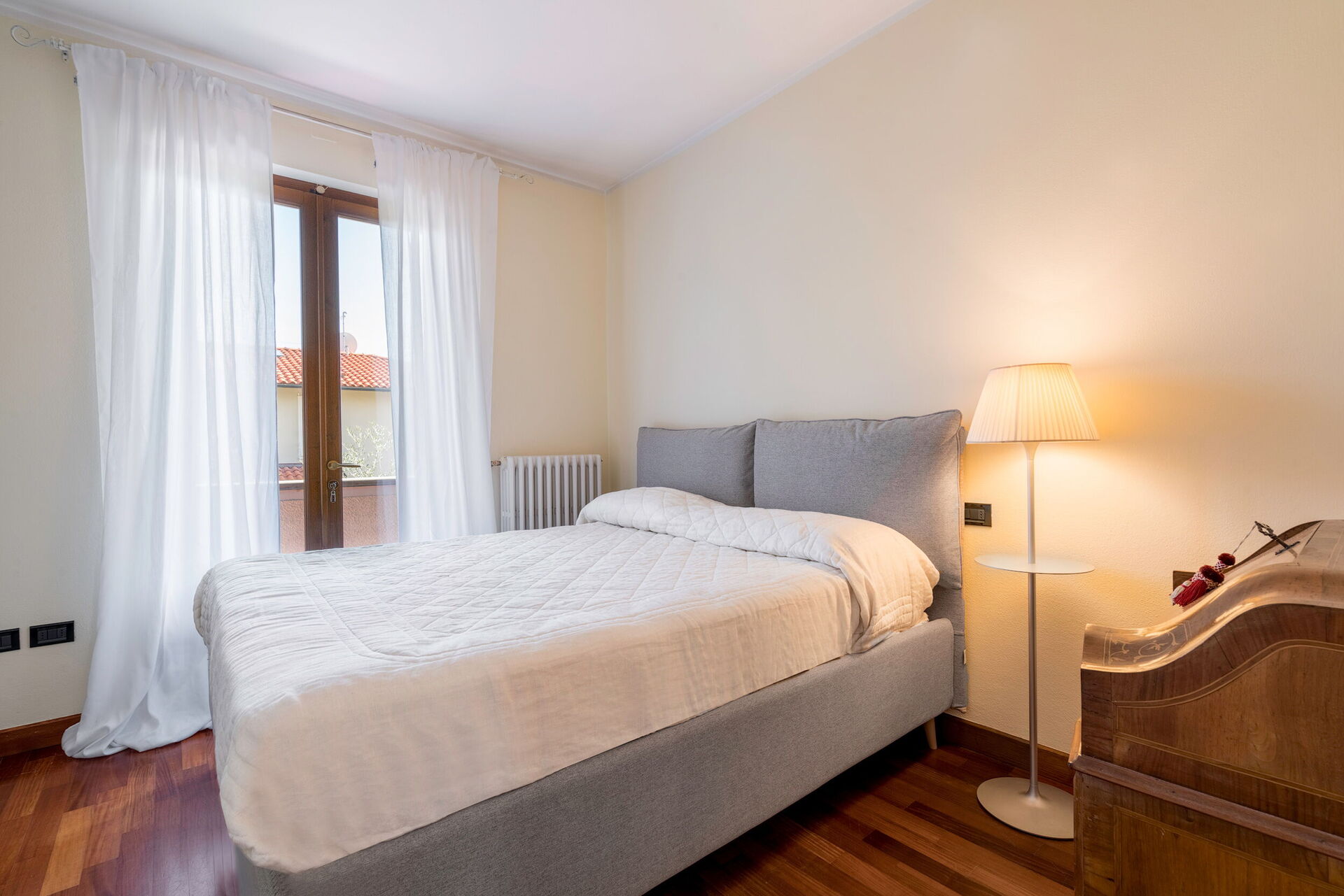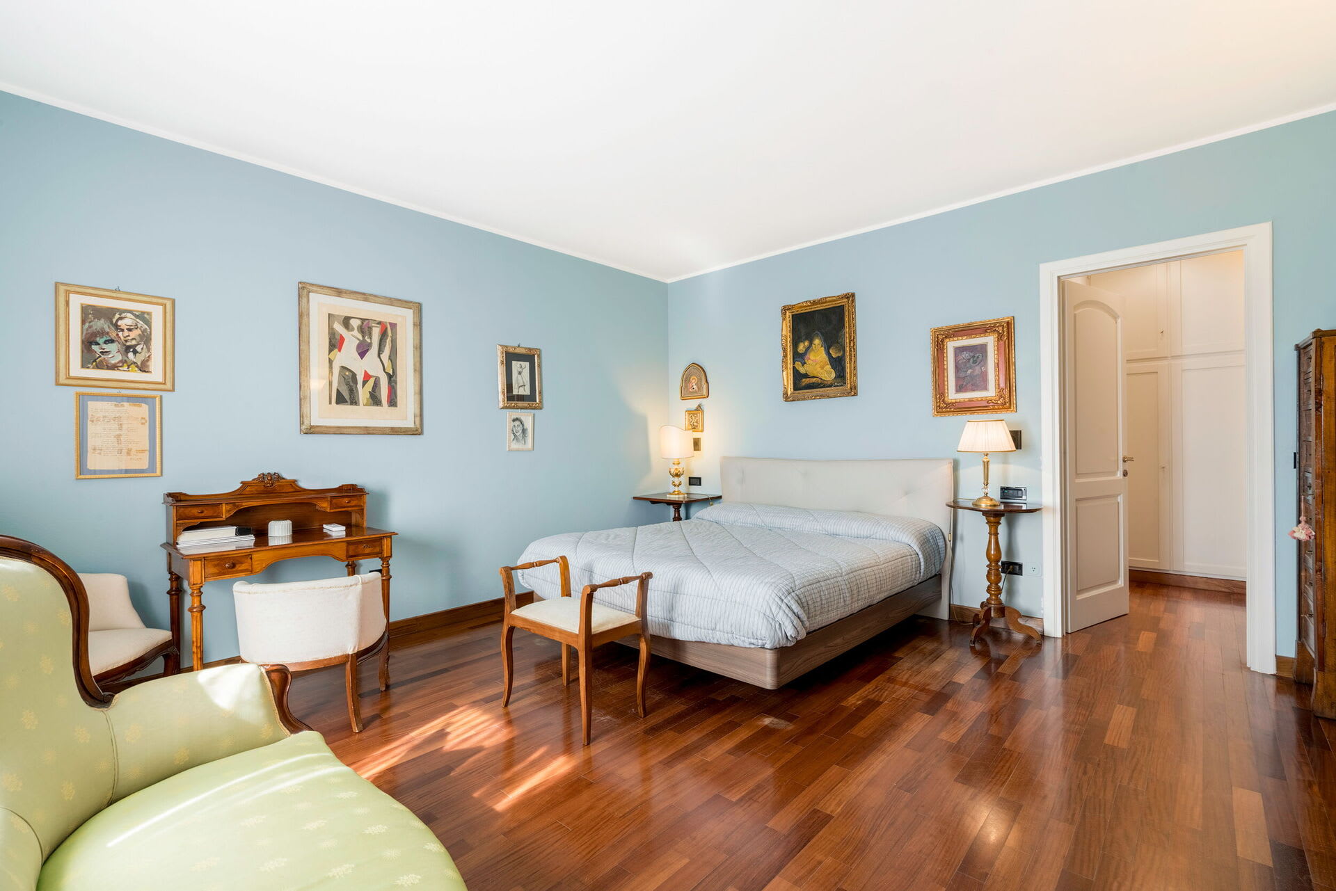 The interior living space is spread over three floors and measures approximately 350 square metres. Furnishings throughout are classic and elegant. As you enter Villa Marmi, you will find two well-furnished living rooms. The first has a comfortable sofa and study area furnished with a desk. The other features a fireplace and is furnished with sofas and armchairs. This room also enjoys direct access to the garden. Also on the ground floor you will find a spacious kitchen, well equipped with coffee machine, toaster, dishwasher and oven. Next to the kitchen you will find a charming dining room with oval table and elegant glass cabinet. There is also a double bedroom and a bathroom with shower on this floor.