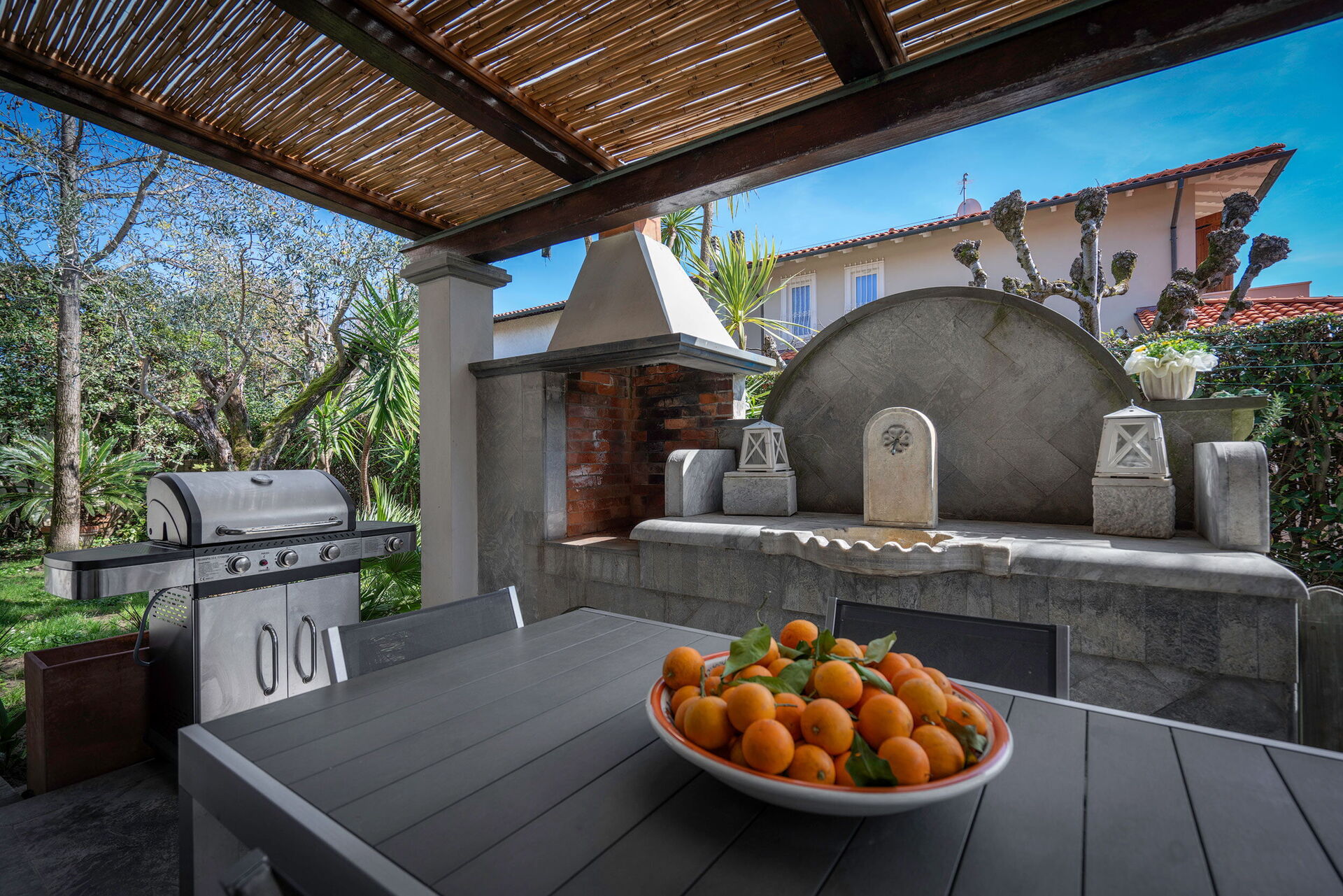 Outside, guests can enjoy the private garden at Villa Marmi. Lawns are edged with mature shrubs and trees, whilst there are a number of covered terraces offering the perfect spot to dine al fresco or just sit and relax. There is a modern BBQ as well as a more traditional in-built BBQ.