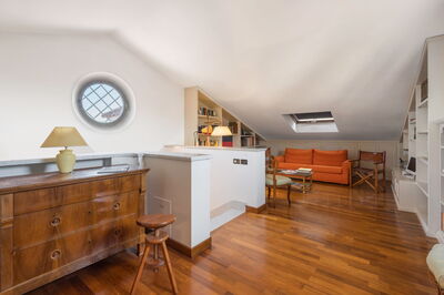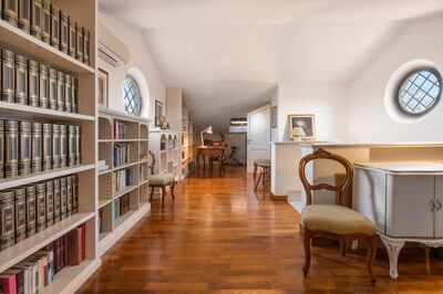 On the top attic floor there is a bedroom with 2 single beds and a bathroom with shower. This is also a nice space where guests can retreat with a good book. There are certainly plenty of books for you to choose from on the floor to ceiling shelves here.
