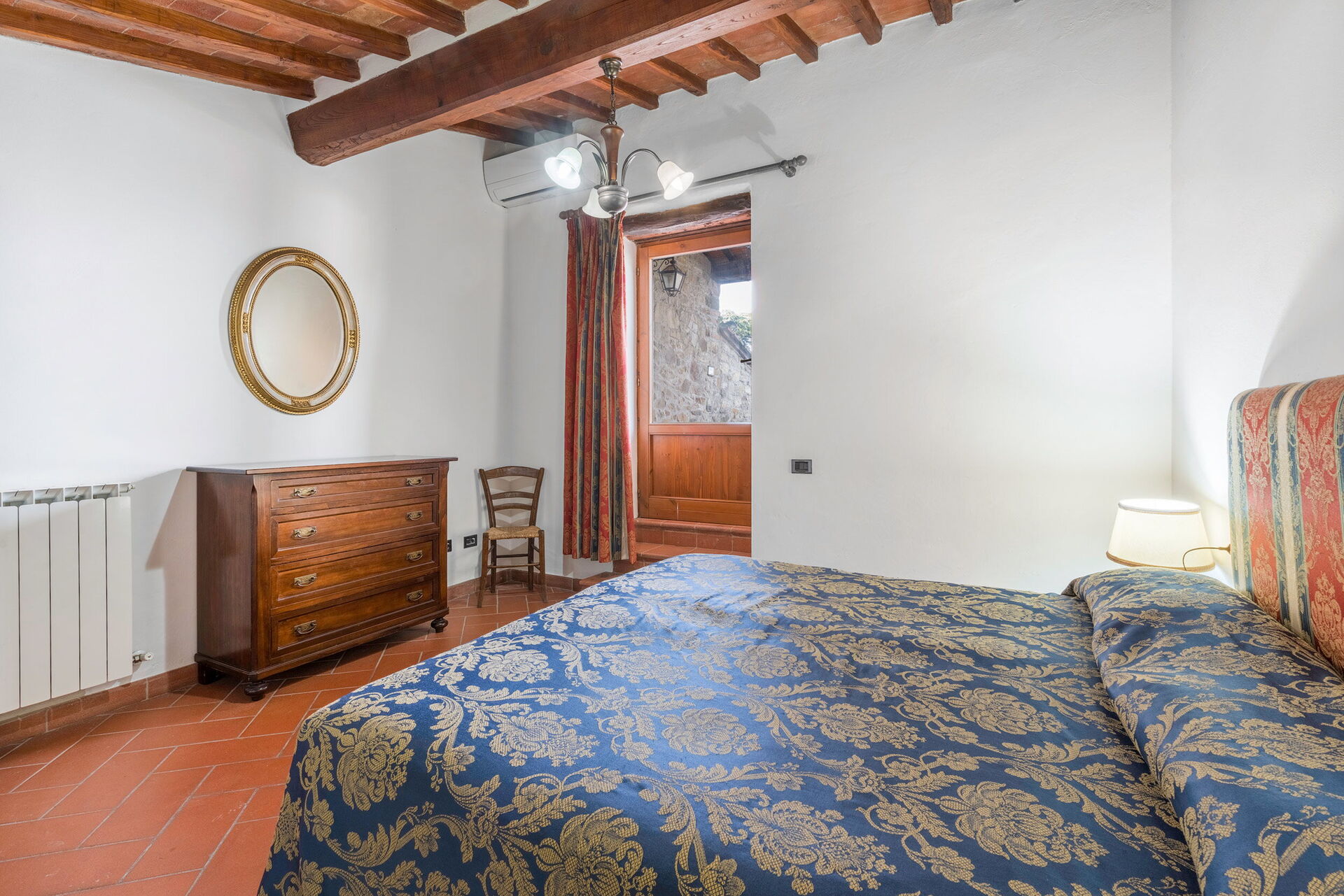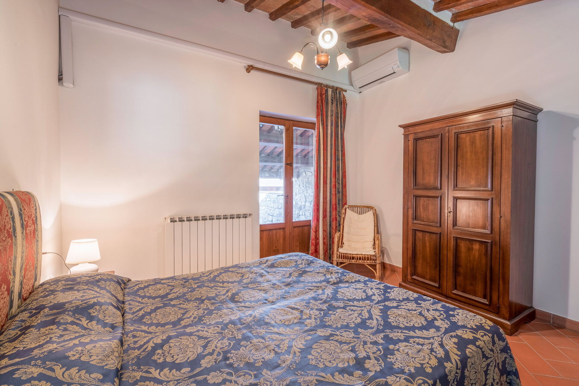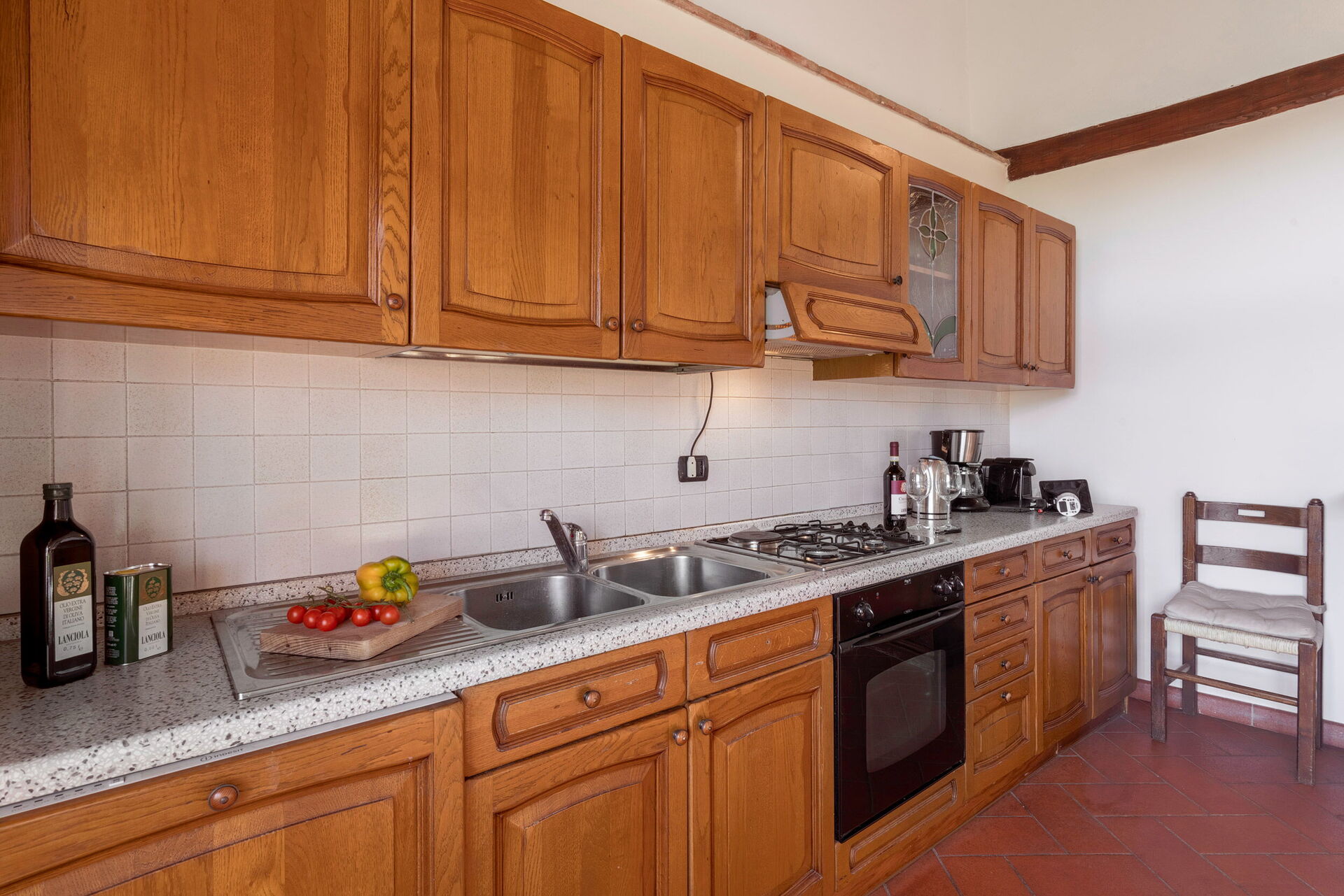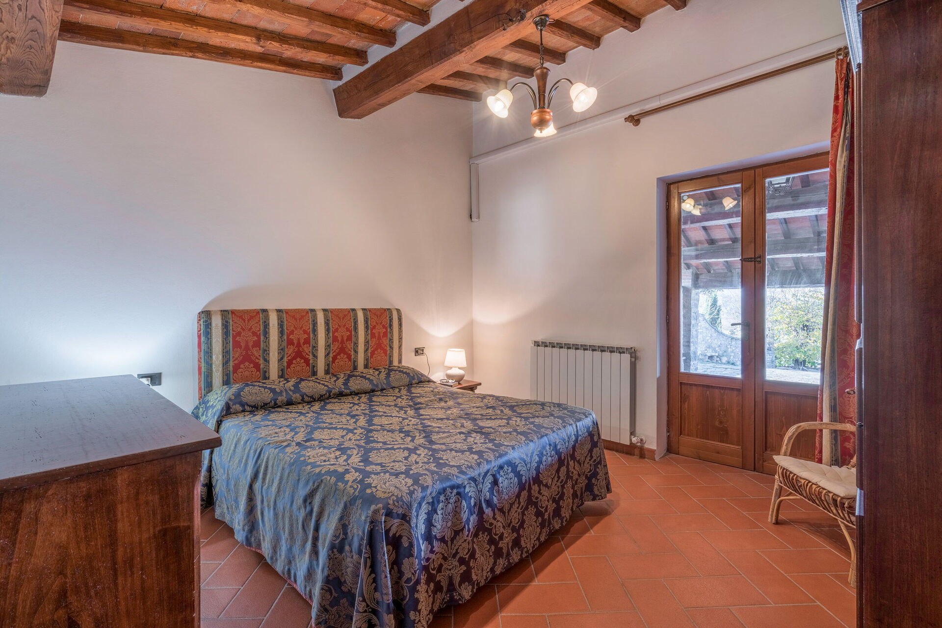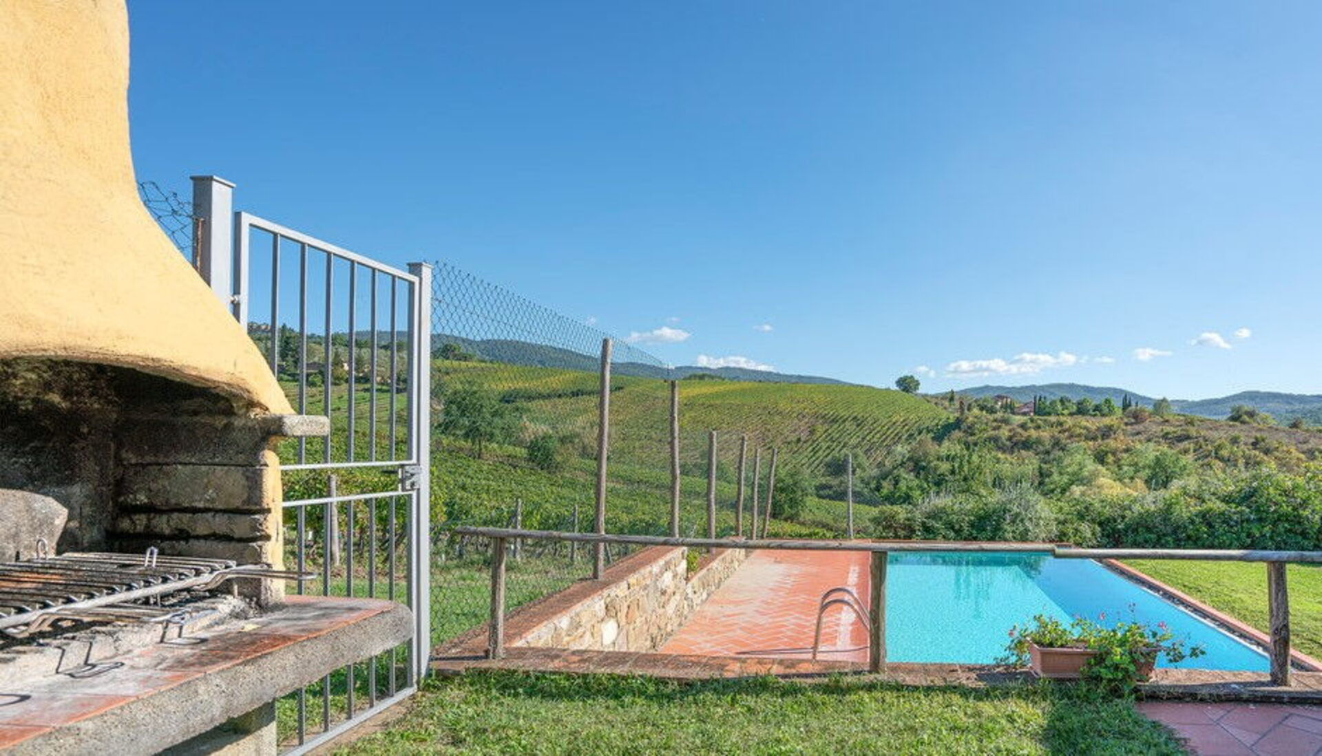 Outside, there is a private swimming pool measuring 6 x 3 metres and with a depth of 1.5 metres. The pool is open from 15 April to 31 October each year. A covered terrace adjoining the villa is furnished with a table and chairs for al fresco dining as well as a couple of comfortable armchairs. A built up BBQ sits just above this space. Six loungers are arranged both on the terrace by the pool and on the adjacent lawn. Both the pool and terrace enjoy wonderful views over the rolling hills and vineyards that characterise this region.