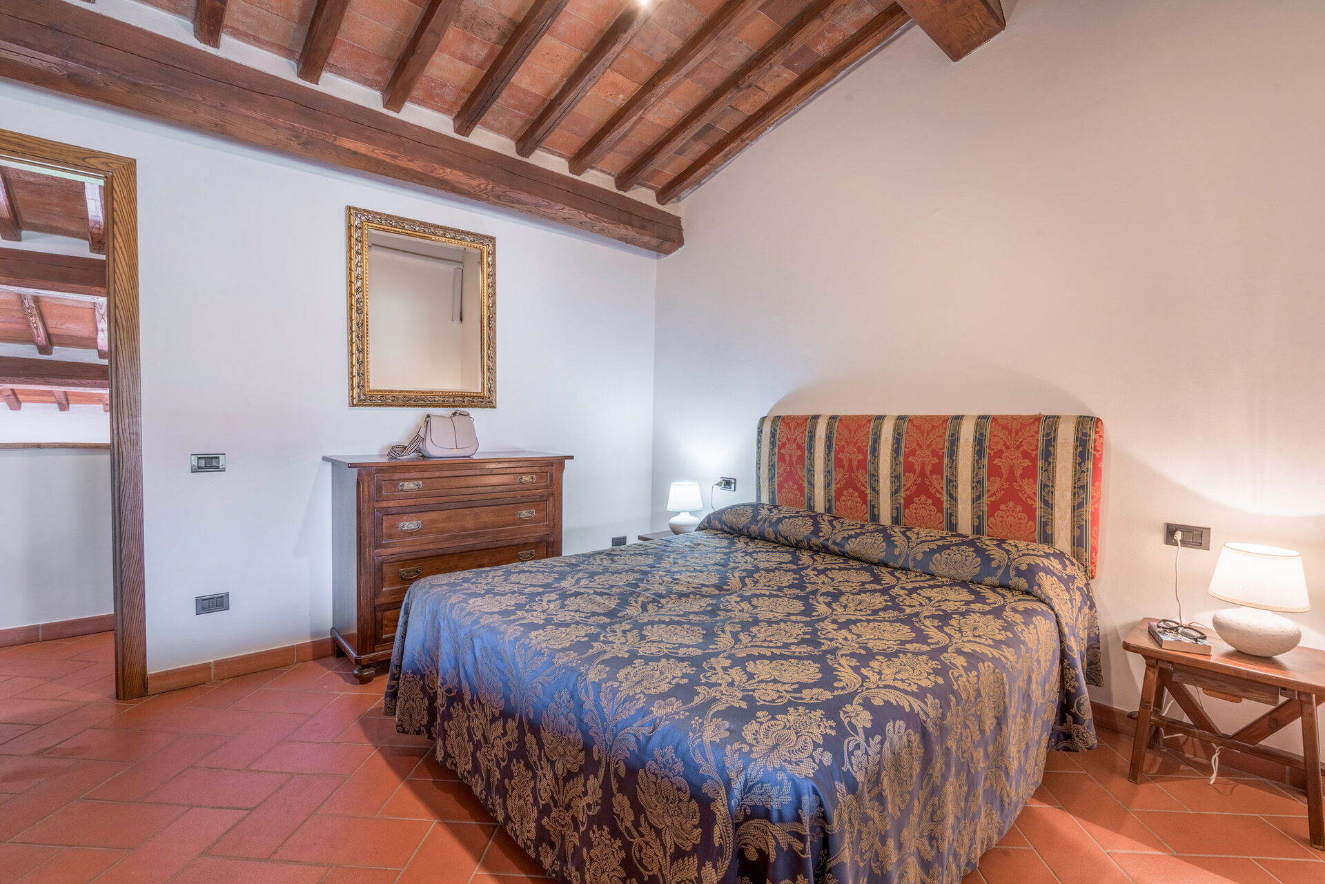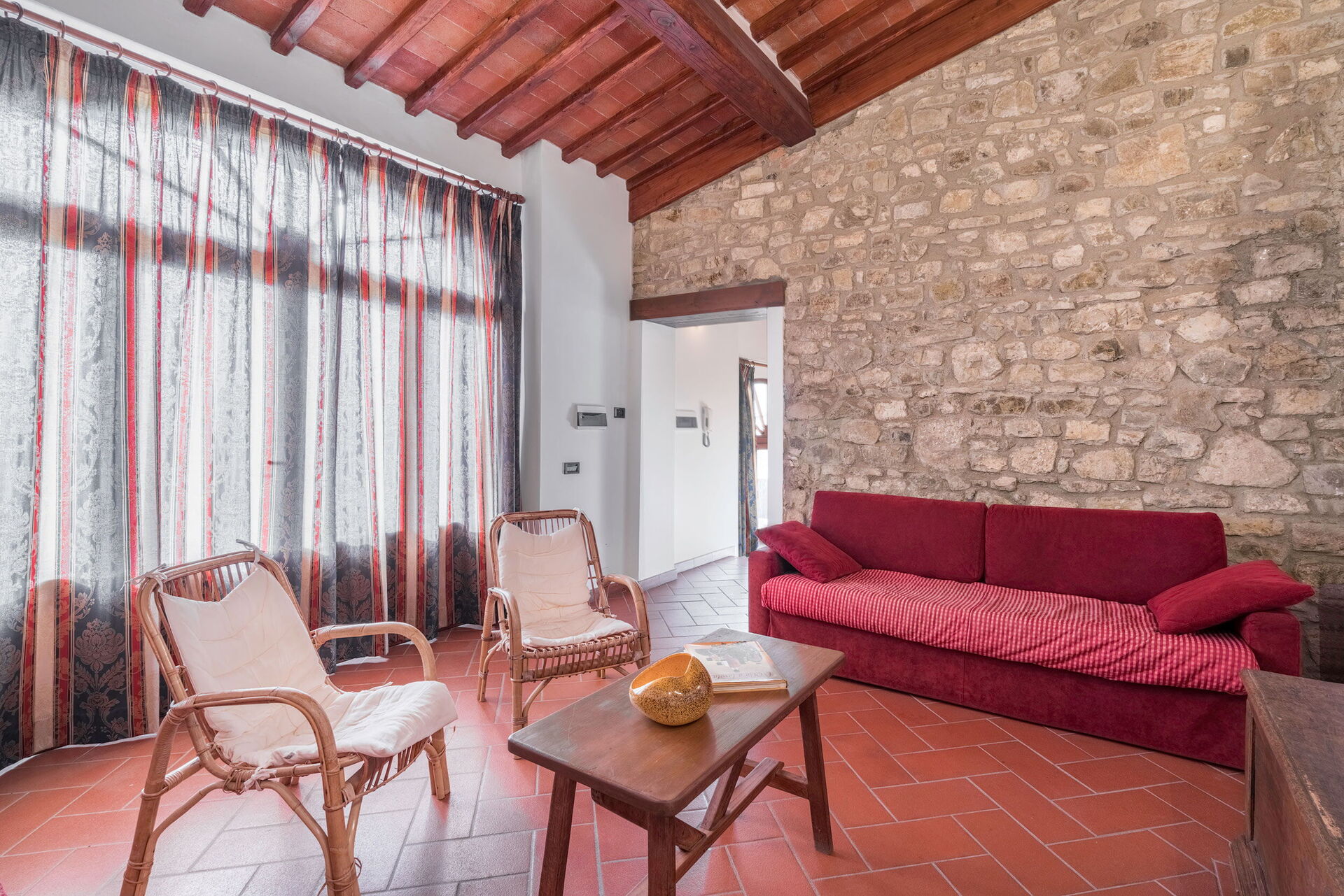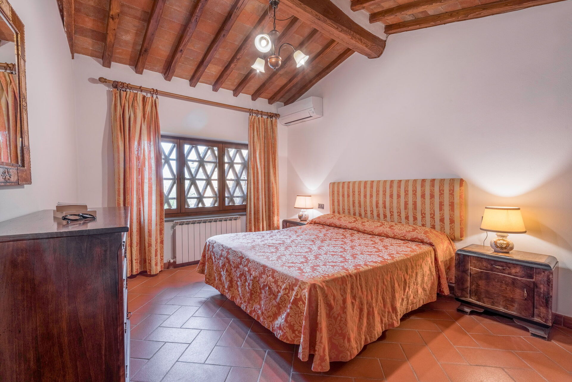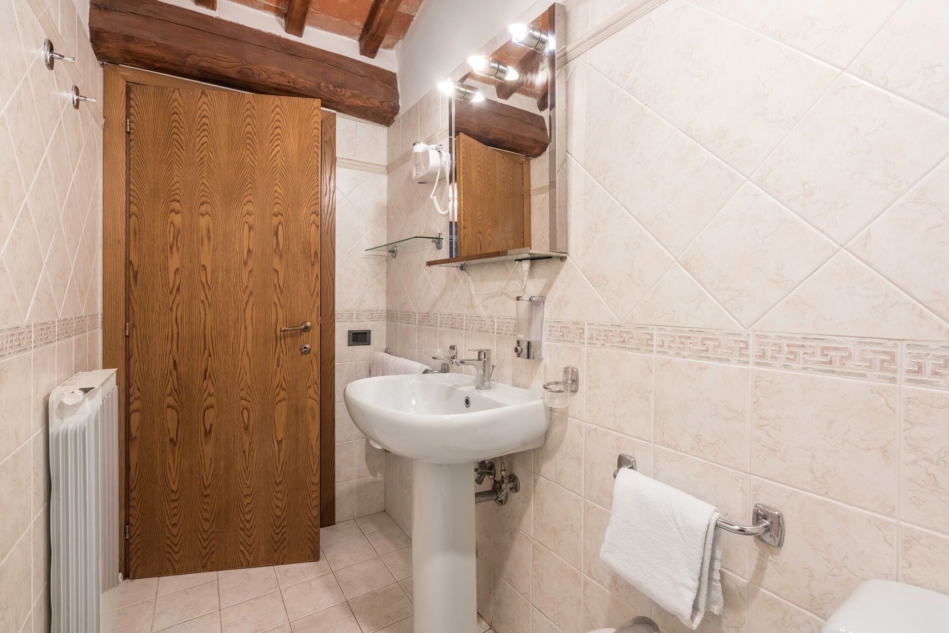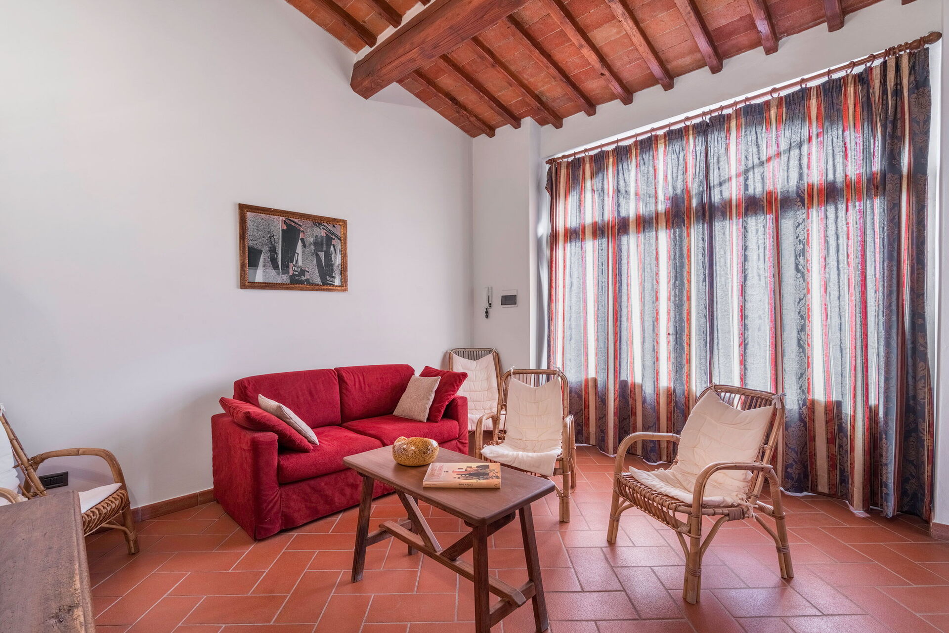 Outside, there is a private swimming pool measuring 6 x 3 metres and with a depth of 1.5 metres. The pool is open from 15 April to 31 October each year. A covered terrace adjoining the villa is furnished with a table and chairs for al fresco dining as well as a couple of comfortable armchairs. A built up BBQ sits just above this space. Six loungers are arranged both on the terrace by the pool and on the adjacent lawn. Both the pool and terrace enjoy wonderful views over the rolling hills and vineyards that characterise this region.