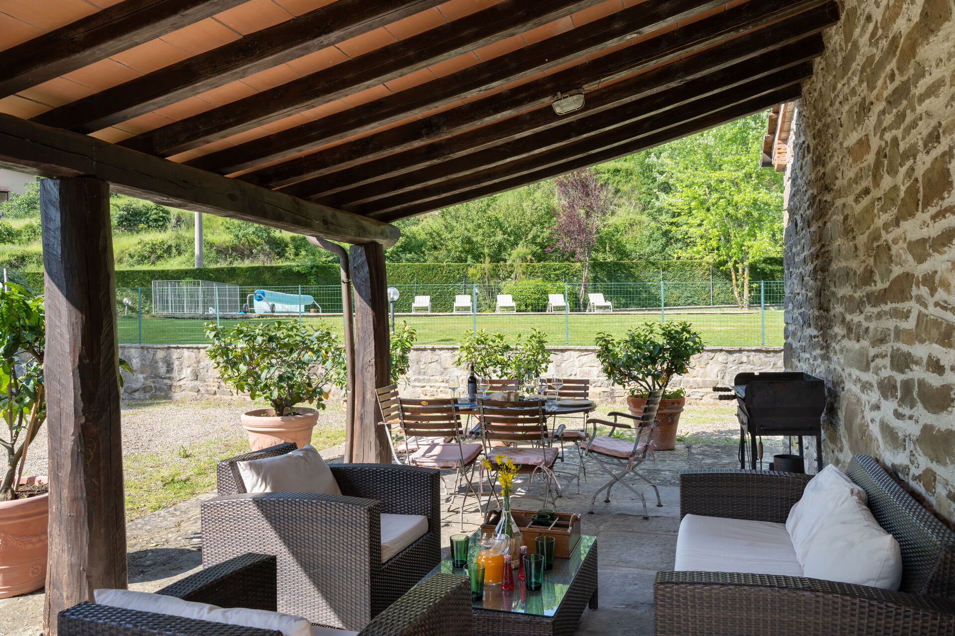 Outside a covered terrace sits adjacent to the villa. This is furnished with outdoor dining table and chairs as well as more relaxed outdoor sofas and chairs. A private swimming pool (8 x 10 metres) sits surrounded by lawns. This is open from the end of April to mid October each year, weather permitting. Plenty of sun loungers are provided. A jacuzzi is positioned under shade near to the pool and there is an outdoor shower for you to use too. A tennis court is 400 metres away. Guests share this with guests staying in two other nearby properties.