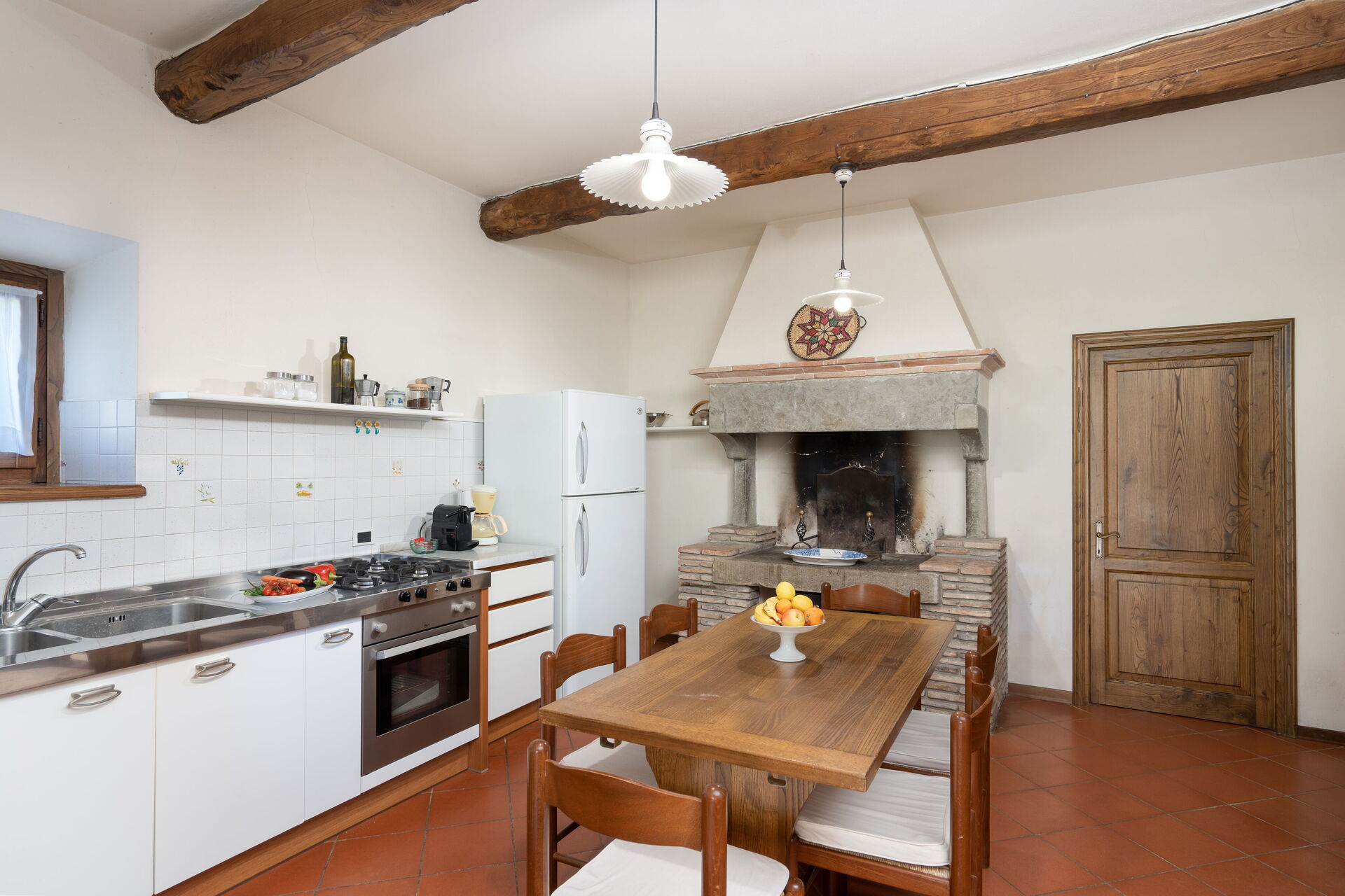 The interior living space measures approximately 145 square metres. Guests enter in a good-sized open plan living and dining room. This is traditionally furnished with dining table and sofa arranged opposite an original fireplace. This is perfect for cooler months of the year and adds character all year round. A separate, well equipped kitchen has a fireplace. There is a second dining table in this room providing additional space for the preparation of meals. Also on the ground floor is a double bedroom and bathroom with shower.