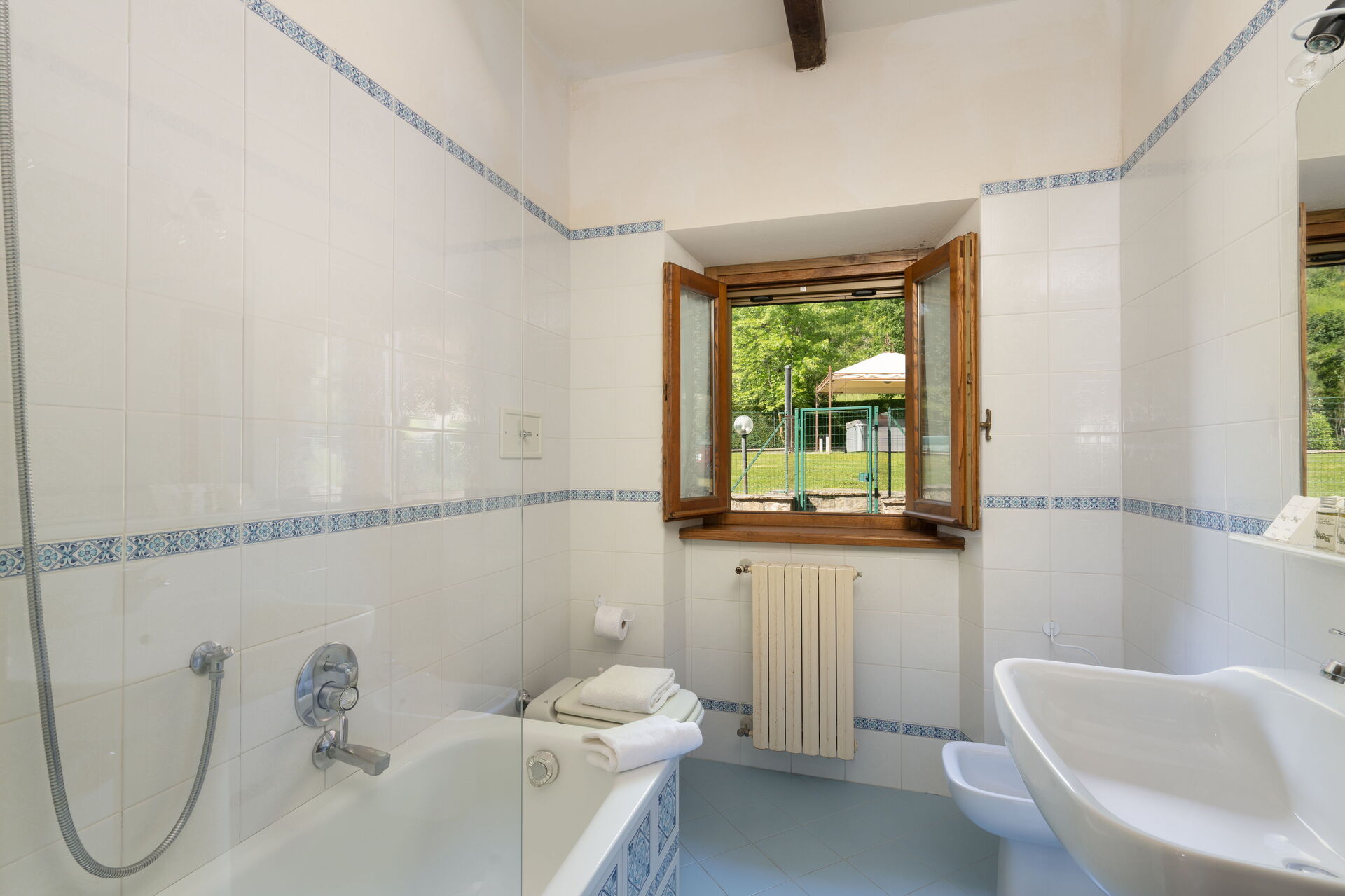 The remaining two bedrooms are on the first floor of Villa Mulino, reached via a staircase that leads from the living room. Here there is one other double bedroom (which also has a single bed in if required) as well as a third bedroom with two single beds. These bedrooms share a large bathroom with shower.