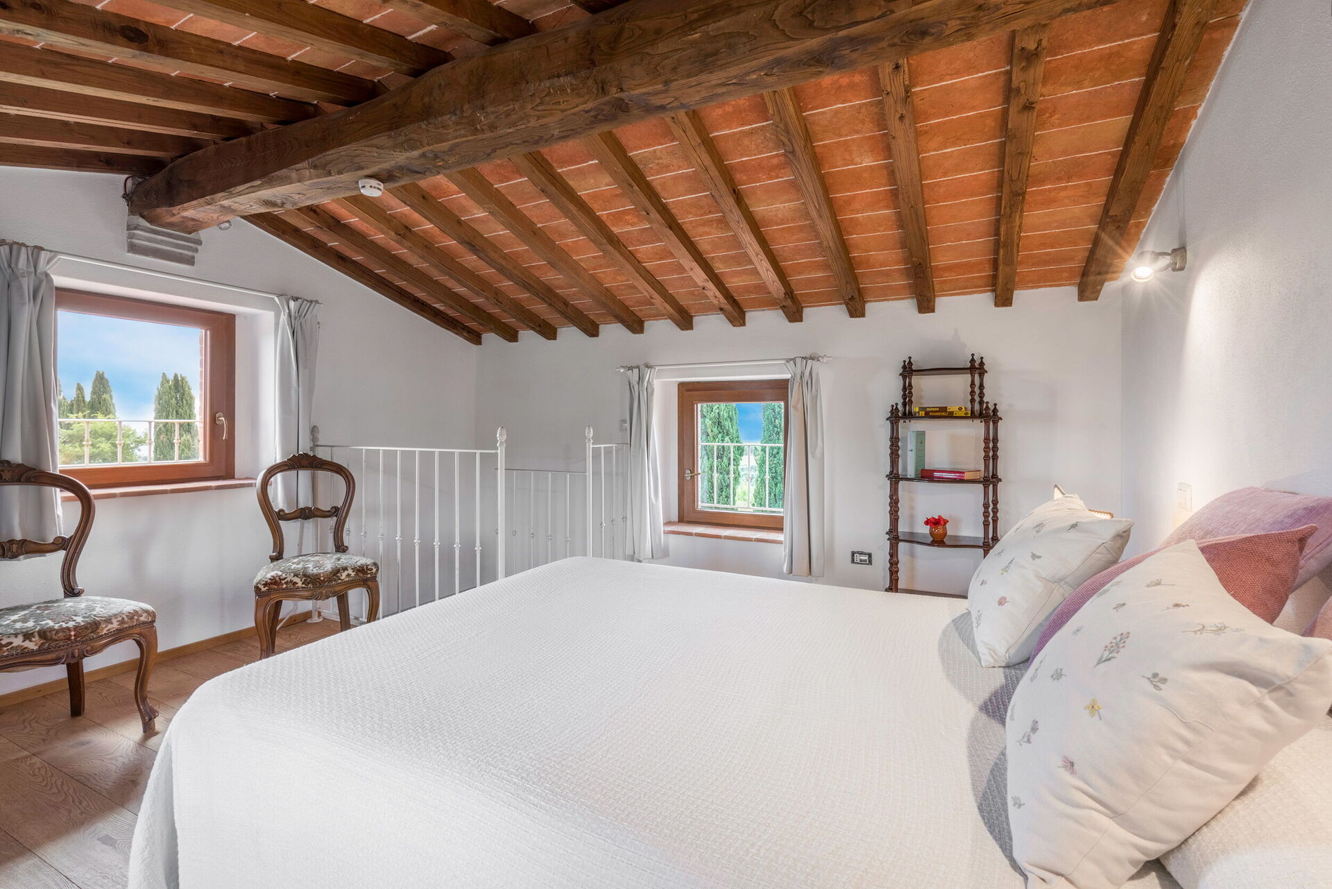 Inside, there is an open plan living and dining room. On one side of the room sits a large dining table. On the other two sofas are arranged around a coffee table, at right angles to a fireplace. To the other side of the space is a double sofa bed allowing the house to accommodate up to four guests in total. The decor has a mix of traditional and more furnishings. Delicate floral curtain fabrics add an elegant rural charm. There is also a shower room on this floor. This has beige tiles and white sanitary ware. To the right of the hallway is a small kitchenette. This has a gas hob and electric oven. There is also a small laundry room with washing machine. A spiral staircase takes guests to the first floor of the house where there is a bedroom. This is furnished with a double bed. It is a charming room with exposed ceilings and wonderful views from the duel aspect windows.