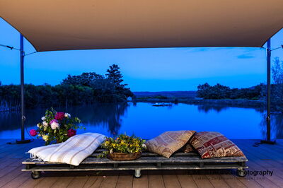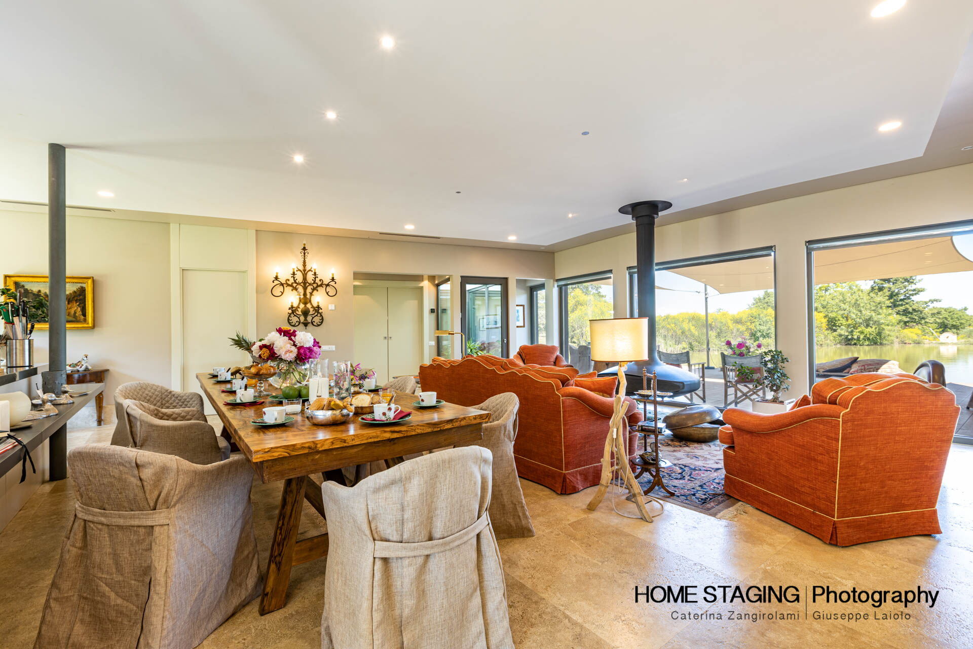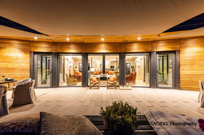 The accommodation is arranged over one floor and measures 260 square metres. As you enter the property, you come directly into an open plan living, dining and kitchen area. The living room has burnt orange sofas and chairs arranged around a striking suspended central fireplace. A large wooden dining table provides a wonderful entertainment space for indoor dining. And the kitchen is extremely well equipped for those who like to cook. Floor to ceiling glass windows and doors let the outside in and flood the room with light. They also ensure guests can enjoy the view over the natural pond which sits in front of the house.