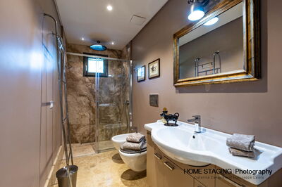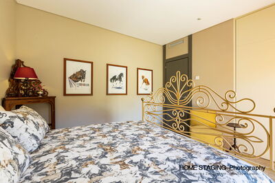 From this central part of the home, two symmetrical apartments extend on either side. Each has two double bedrooms and a bedroom furnished with two single beds (one of which can be arranged with a kingsize bed if guests prefer). These six bedrooms share five bathrooms. One of these with a shower has been adapted for those with disabilities. Two of the other bathrooms have showers whilst the other two have bath tubs. There is also a WC. All bedrooms enjoy direct access to the garden.