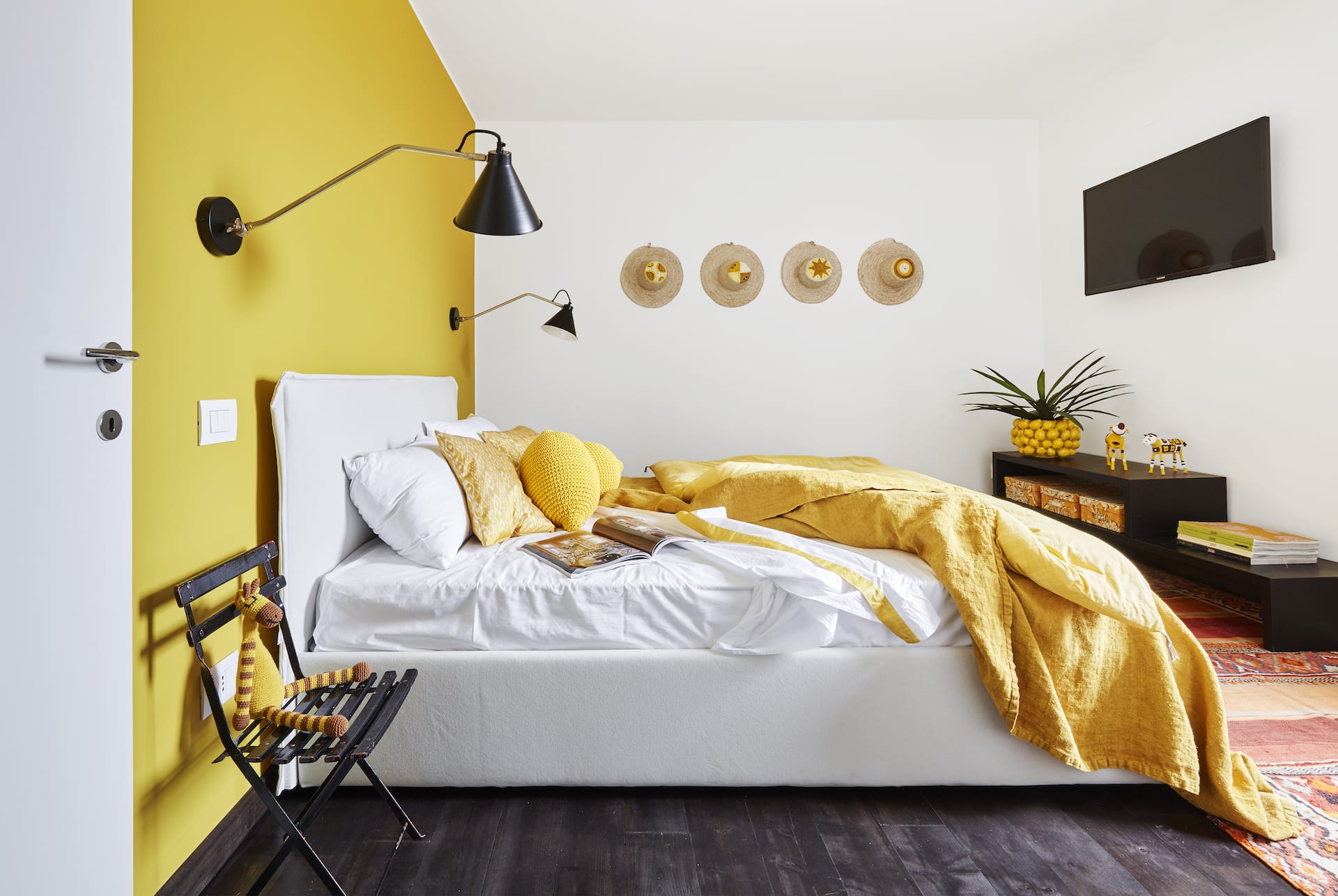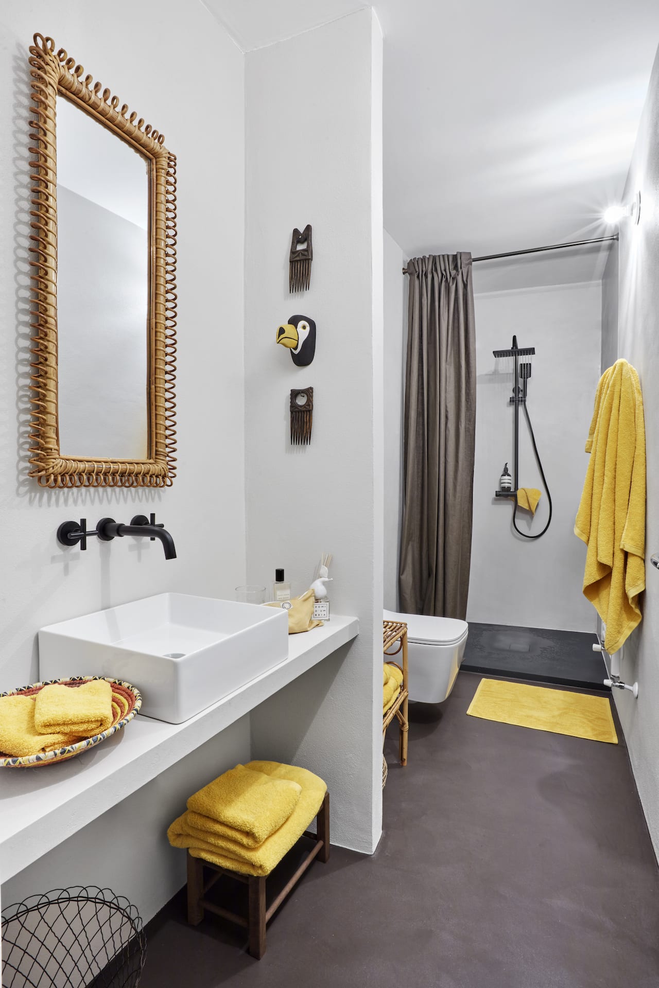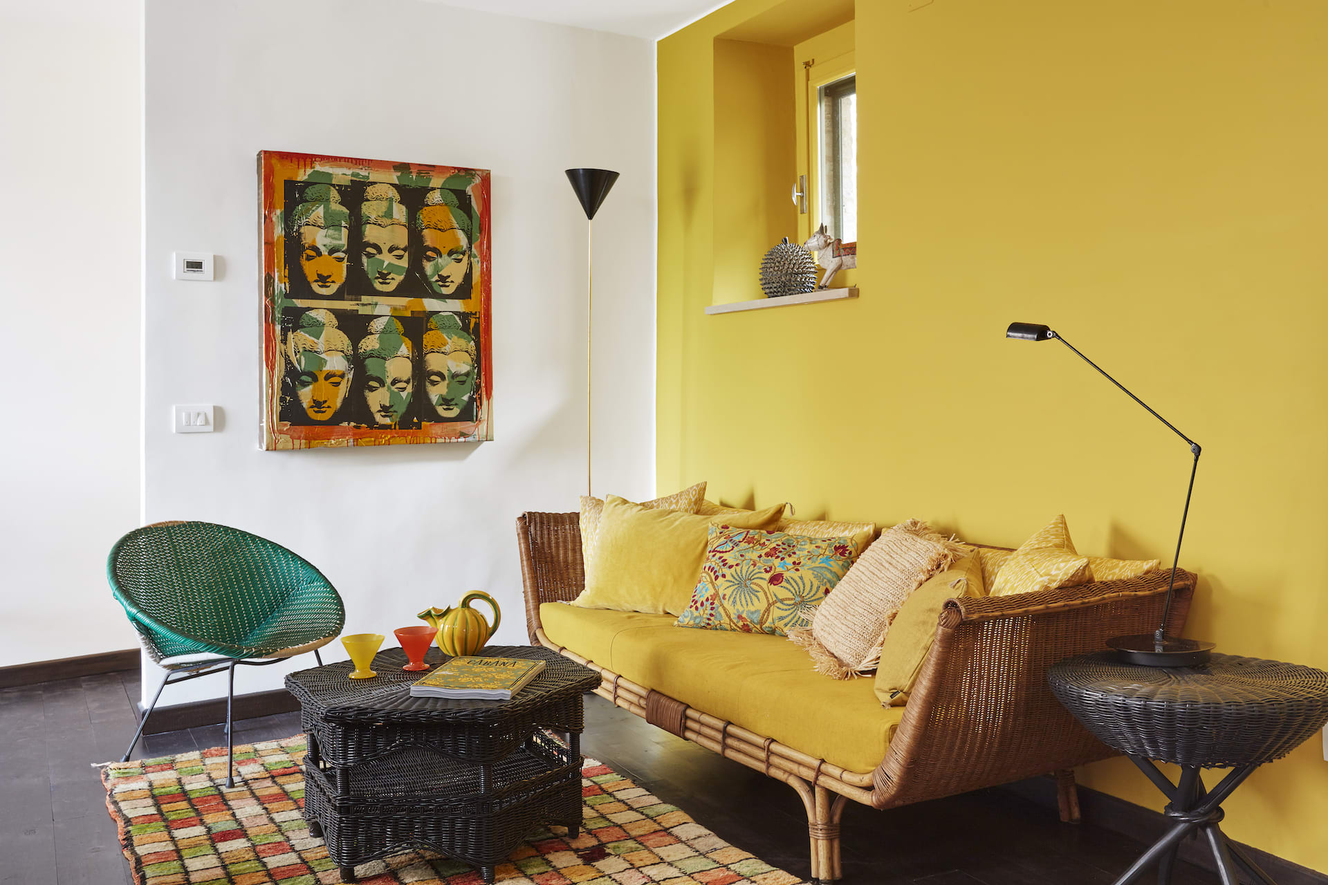 The living room has a stylish yellow wall at one end. A comfortable sofa is positioned here with bright yellow cushions along with an adjacent armchair and coffee table. On the opposite wall is a contrasting dark grey kitchen as well as a circular dining table seating four. The corner kitchen is fully equipped with an oven, electric hob, dishwasher, coffee machine, fridge with freezer, kettle, toaster and a small washing machine. It's a beautiful yet calming space in which to relax. The colourful artwork and furnishings were carefully selected by the owner on her extensive travels around the world whilst bright rugs contrast and add colour against the dark wooden flooring. A TV is mounted on the wall offering Sky TV channels.