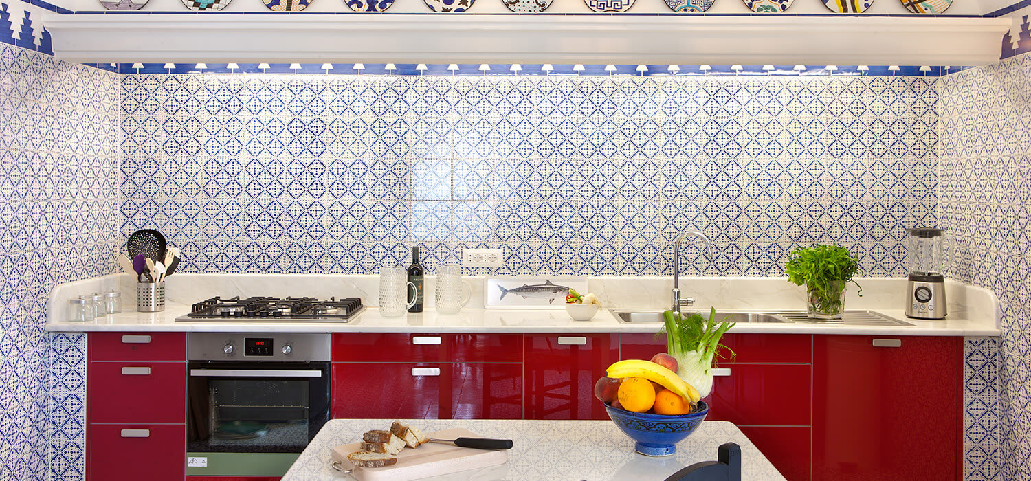 Inside, Villa Grande has five bedrooms. Three of these are furnished with king-size beds, one with two single beds, and one with a queen-size bed. Please note that this bedroom is located outside the main house, adjacent to both the solarium and the indoor pool. Each of the bedrooms have a private bathroom. Four of the bathrooms have showers whilst the fifth bathroom has both a shower and bath tub. In addition, the villa has a spacious kitchen. Here, red units contrast with the blue and white wall tiles. It's super colourful and stylish as well as being practical. The colour continues into the cozy living room and a dining area. The living area is equipped with TV, DVD player and music system. The decor is elegant and stylish throughout. A solarium and an indoor pool complete the interior. Overall the living space measures over 2500 square feet.