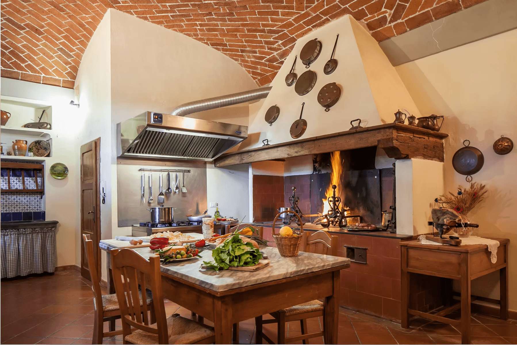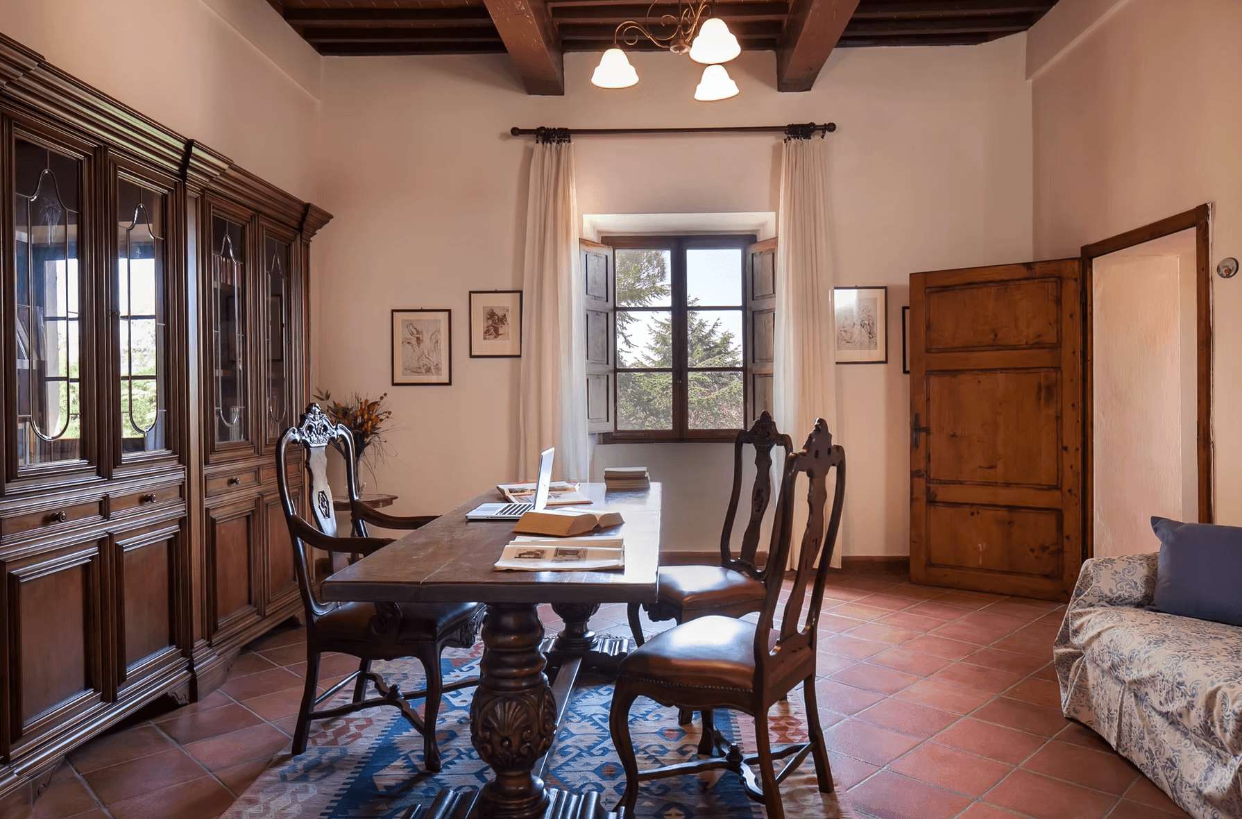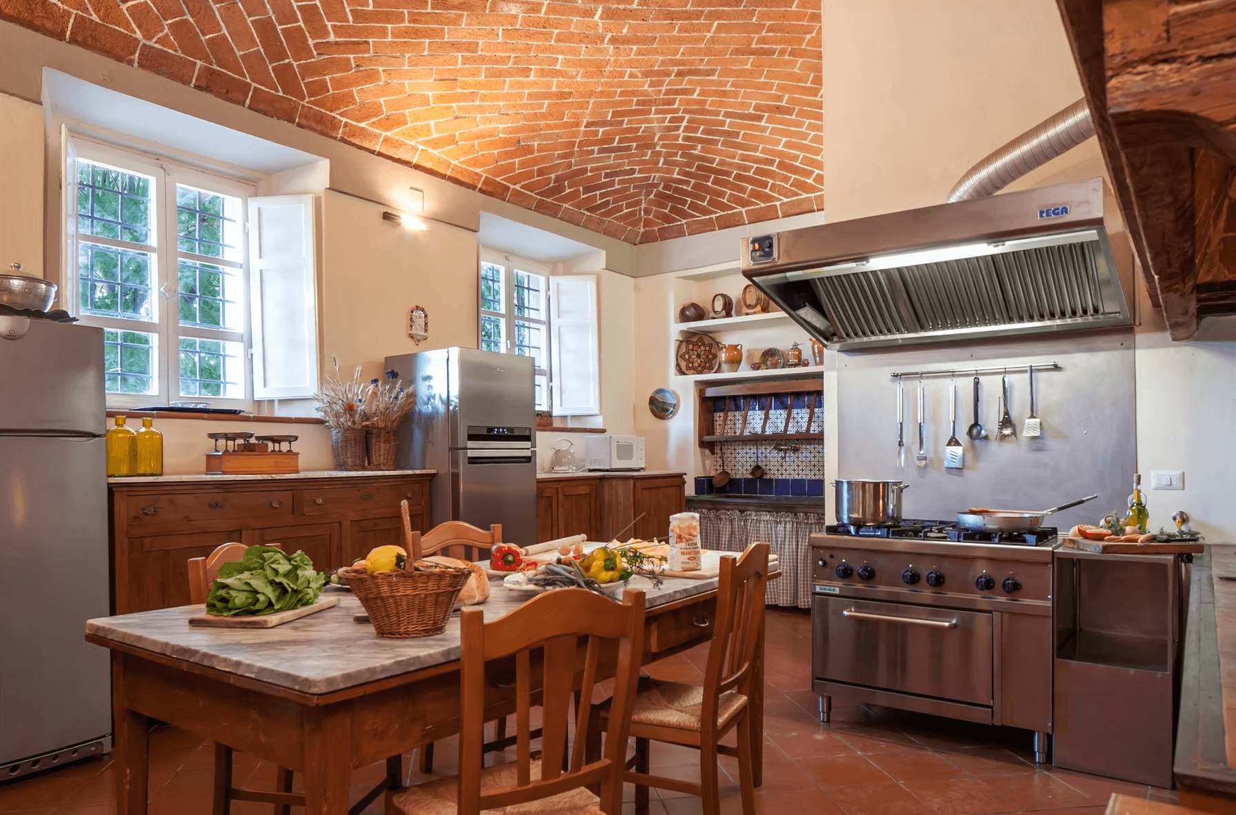 Behind metal gates, a long cypress-lined drive leads up to the house. Inside Villa Fiorella, the accommodation is arranged over three floors. With multiple living areas and sitting rooms on each floor, there are plenty of spaces in which to relax and enjoy one another's company, whilst the ground floor dining room is the perfect setting for large family dinners. The kitchen is full of character, traditional in style and well equipped. There is a modern, stainless steel gas hob and oven as well as a traditional fireplace which would once have been used for cooking and is still available to use today. A central table provides plenty of workspace. There is also a study area for those that need to get some work done during their stay.