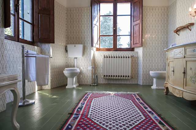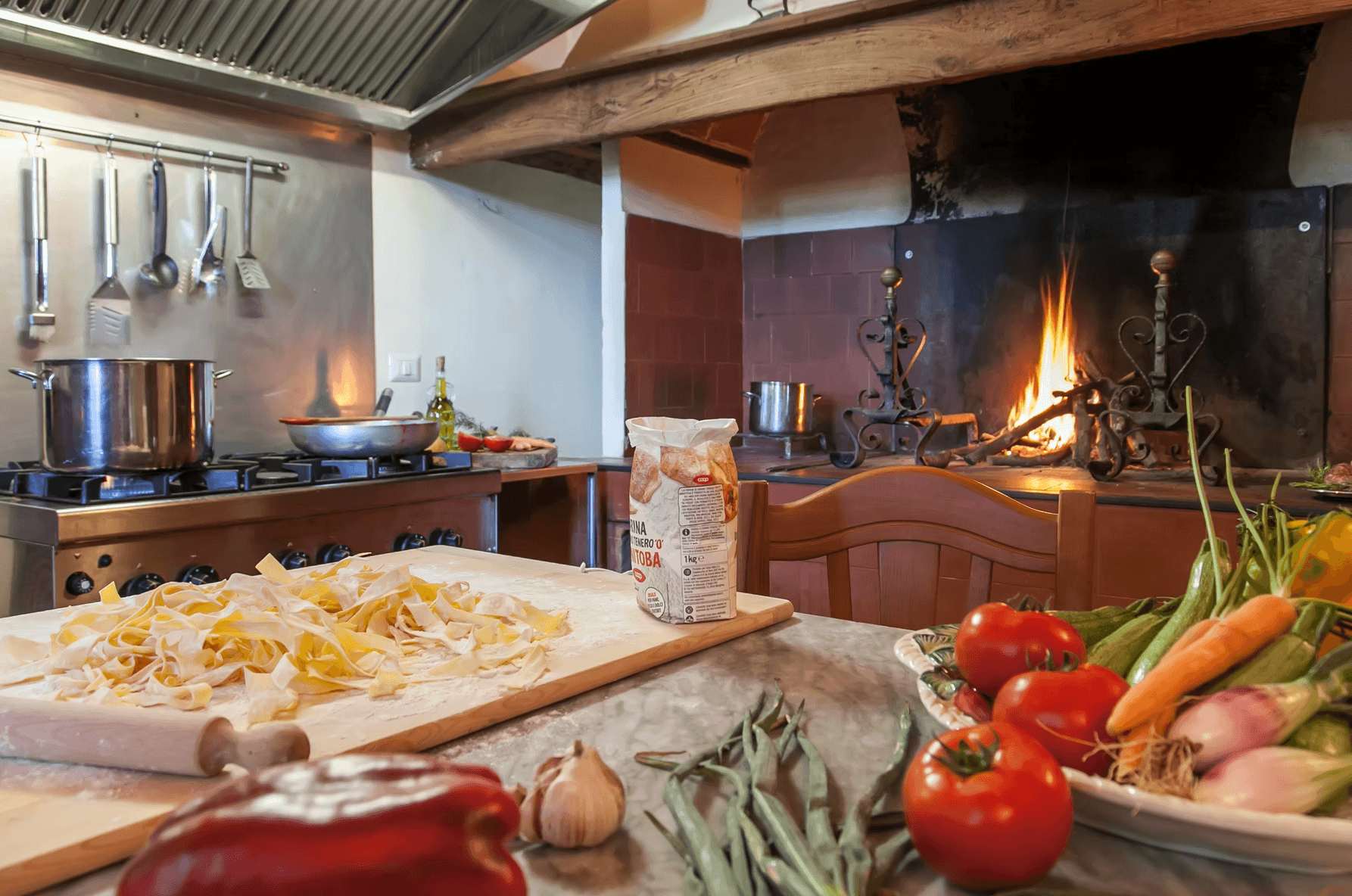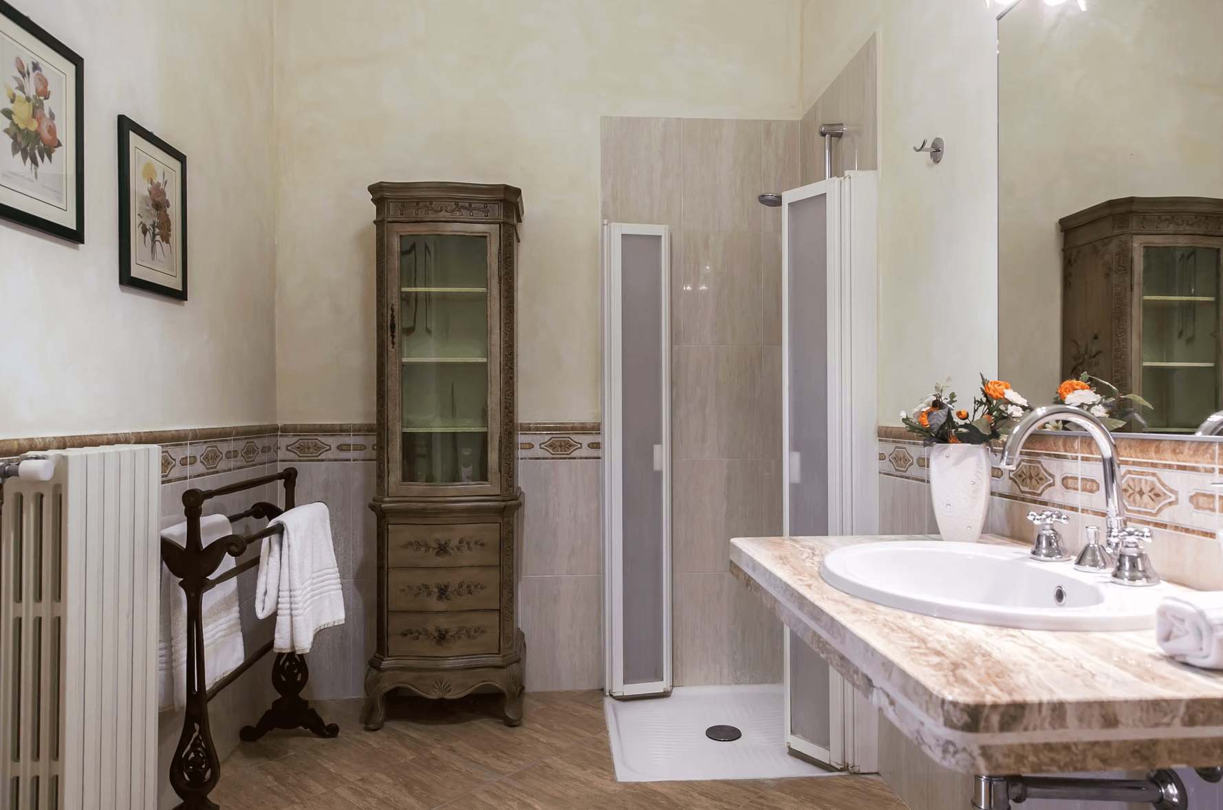 Behind metal gates, a long cypress-lined drive leads up to the house. Inside Villa Fiorella, the accommodation is arranged over three floors. With multiple living areas and sitting rooms on each floor, there are plenty of spaces in which to relax and enjoy one another's company, whilst the ground floor dining room is the perfect setting for large family dinners. The kitchen is full of character, traditional in style and well equipped. There is a modern, stainless steel gas hob and oven as well as a traditional fireplace which would once have been used for cooking and is still available to use today. A central table provides plenty of workspace. There is also a study area for those that need to get some work done during their stay.