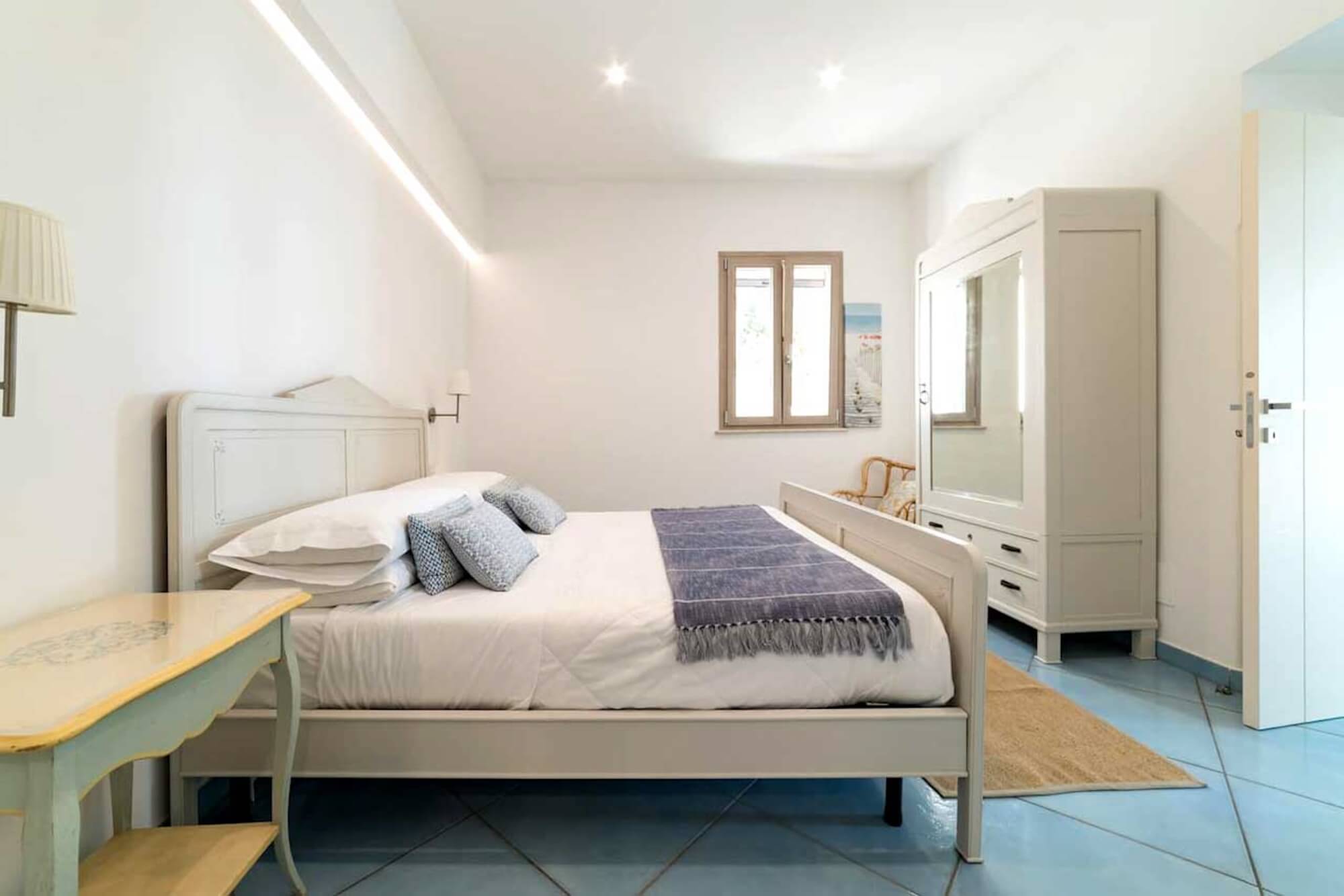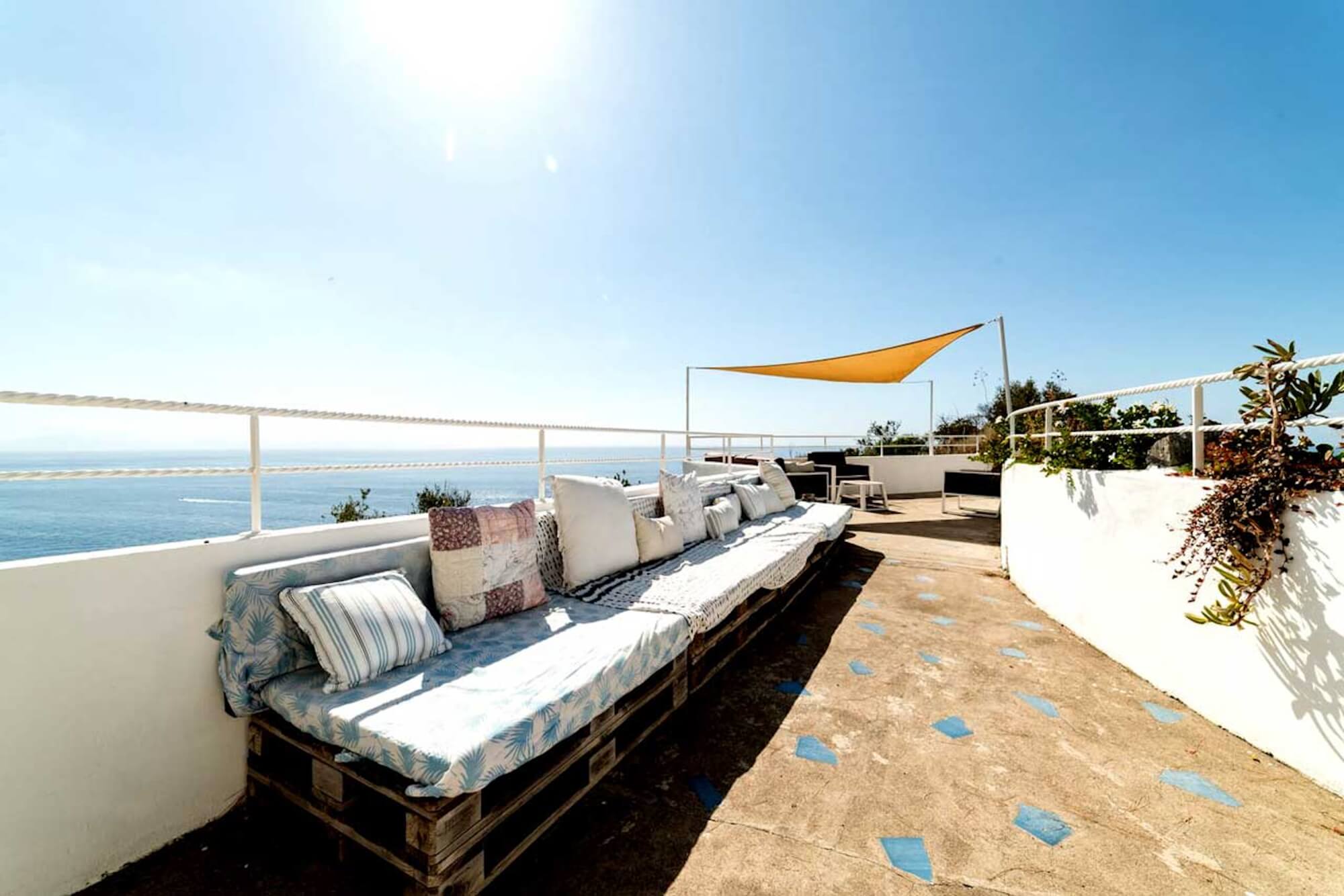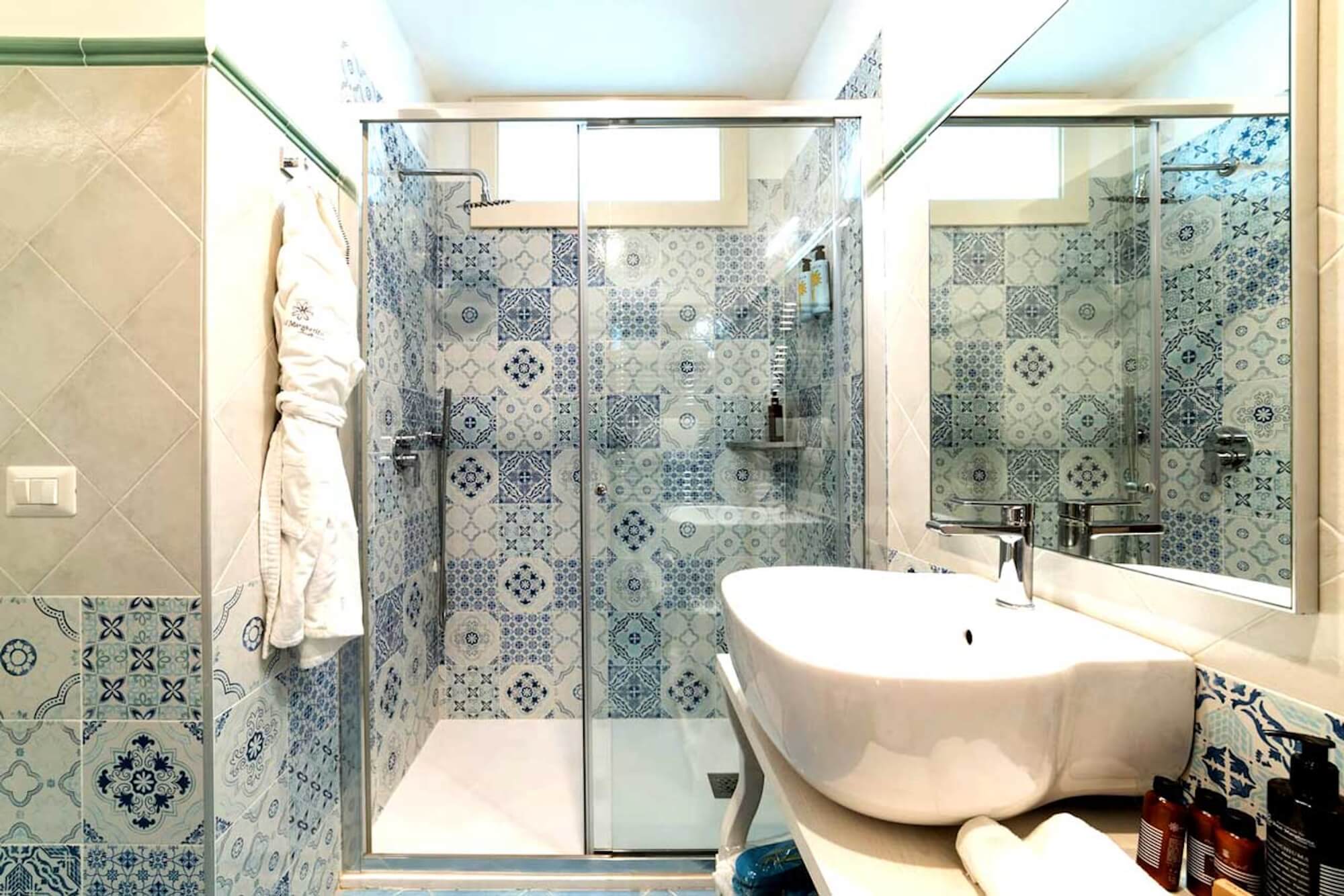 There are two bedroom bedrooms as well as two bedrooms with French beds that can each sleep one guest. The first two bedrooms are both accessed from the living room. The beds in these rooms measure 160 cm. Doors from the first bedroom lead to a terrace. Both rooms enjoy sea views. Each bedroom has an ensuite bathroom with shower and are decorated with white and blue majolica tiles. The third bedroom has a smaller French bed measuring 120 cm wide. Again, it boasts sea views. The bathroom for this bedroom also has a shower. The fourth bedroom is accessed from outside. Please note that this room has a sloped ceiling. At its lowest point, it measures just 1 metre. This is also furnished with a French bed (120 cm wide). Doors lead from this room to another terrace. And again, there is an ensuite shower room.