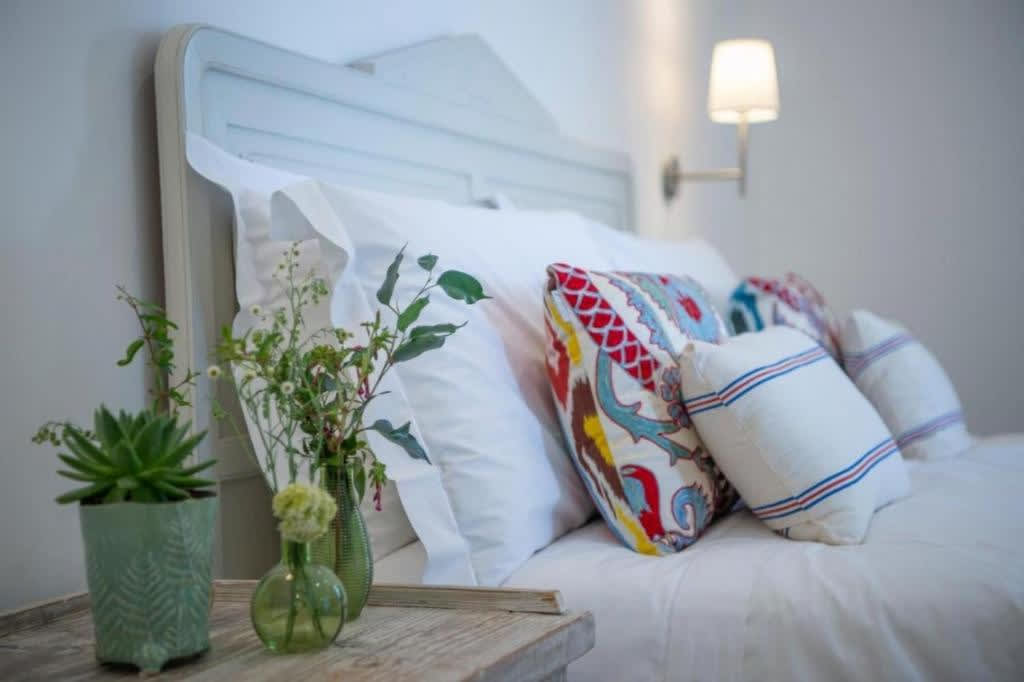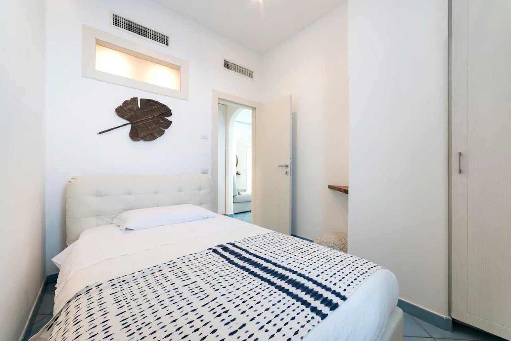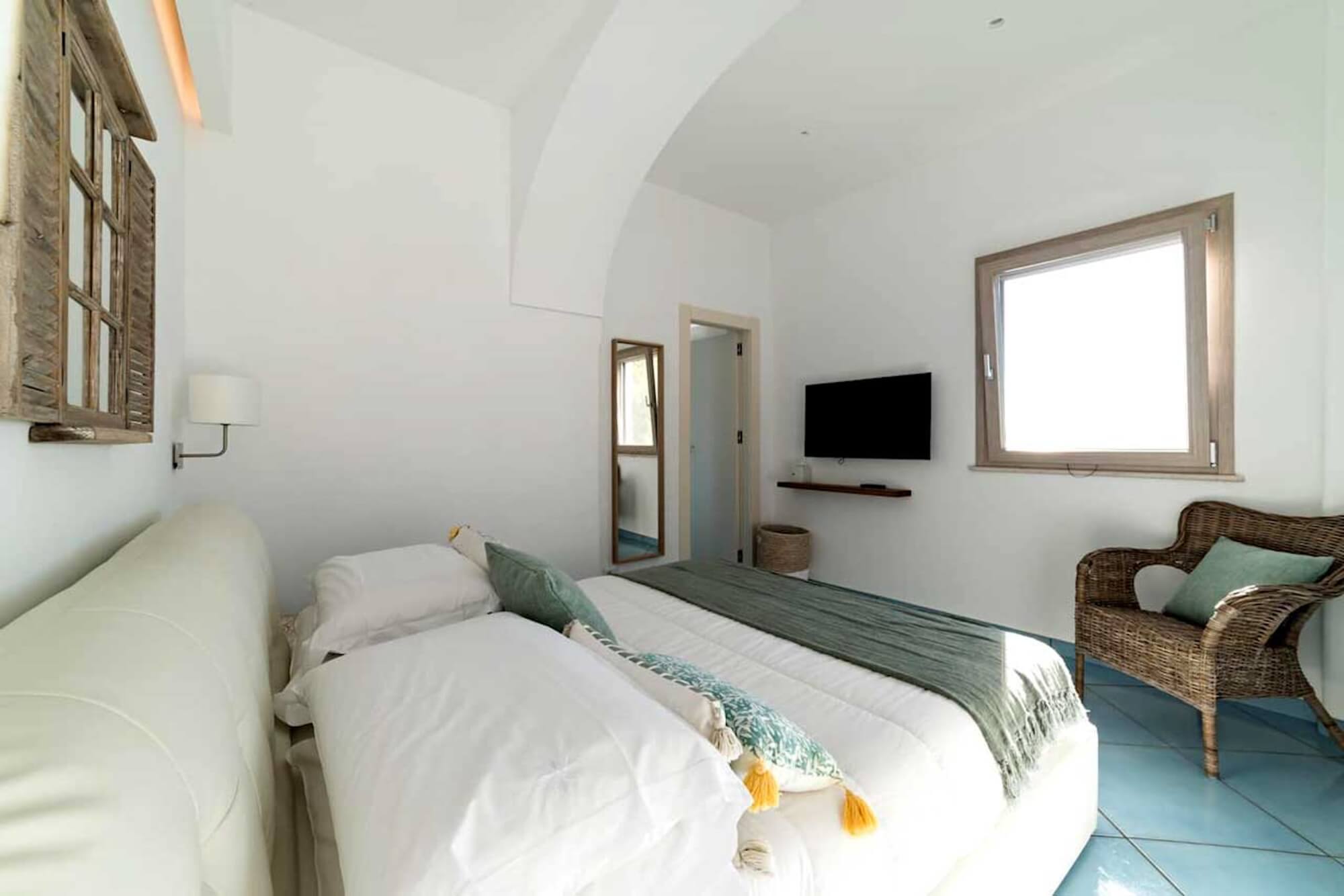There are two bedroom bedrooms as well as two bedrooms with French beds that can each sleep one guest. The first two bedrooms are both accessed from the living room. The beds in these rooms measure 160 cm. Doors from the first bedroom lead to a terrace. Both rooms enjoy sea views. Each bedroom has an ensuite bathroom with shower and are decorated with white and blue majolica tiles. The third bedroom has a smaller French bed measuring 120 cm wide. Again, it boasts sea views. The bathroom for this bedroom also has a shower. The fourth bedroom is accessed from outside. Please note that this room has a sloped ceiling. At its lowest point, it measures just 1 metre. This is also furnished with a French bed (120 cm wide). Doors lead from this room to another terrace. And again, there is an ensuite shower room.