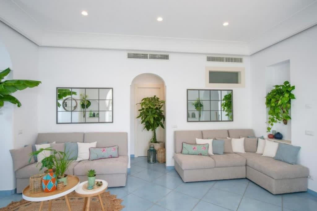 Inside, the accommodation measures 140 square metres. There is a well equipped kitchen and a large living area. The living area has pale blue floor tiles and is furnished with comfortable sofas and armchairs. There is a dining table seating five. There is also a TV for lazy nights in! French doors lead from here to one of the many terraces. Windows let in plenty of light and ensure guests can enjoy the sea views. An archway leads from the living area to the kitchen. This is well equipped with an induction hob, electric oven, fridge with freezer, dishwasher, microwave and coffee maker.