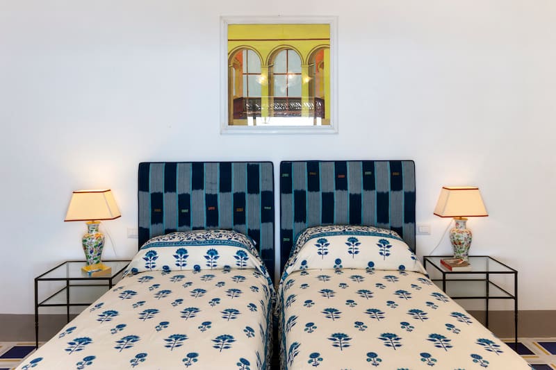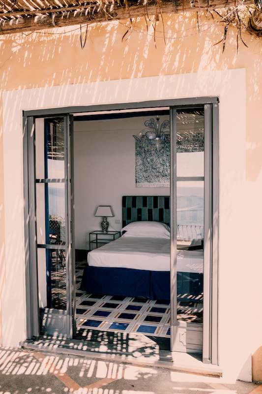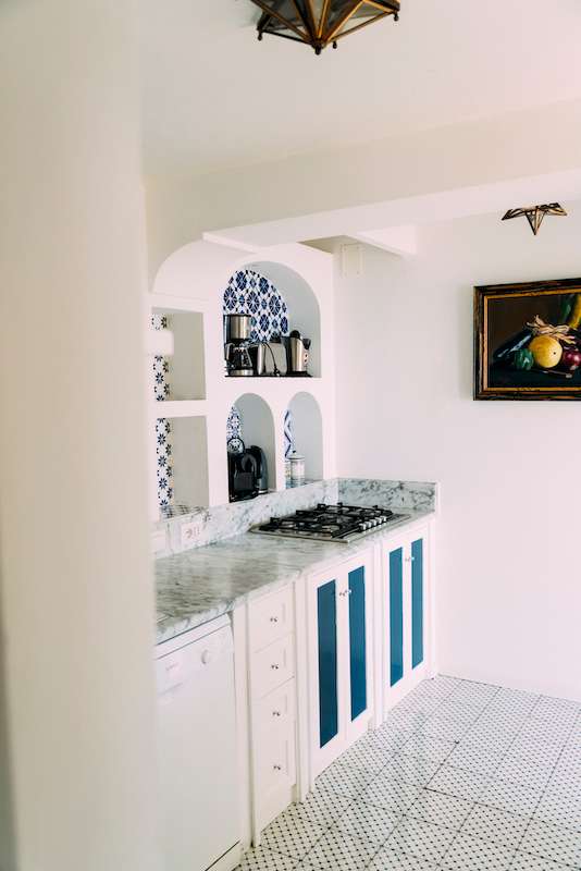 Villa Chi can comfortably sleep up to 4 guests. Inside, there are 2 bedrooms and 2 ensuite bathrooms. One bedroom has a kingsize bed whilst the second bedroom can either be arranged with 2 single beds or one kingsize bed. It allows the villa to work equally well for 2 couples or for a family with children. There is also a kitchen. This is equipped with hob and microwave. It is a simple but tasteful space with white units and grey and white worktops which contrast with the blue and white wall tiles. Finally, Villa Chi boasts an open plan living and dining area. This is an elegant and stylish area where colour has been used to bring warmth and character. It is furnished with a sofa, dining table , sideboard and desk. In total, the space measures 78 square metres.