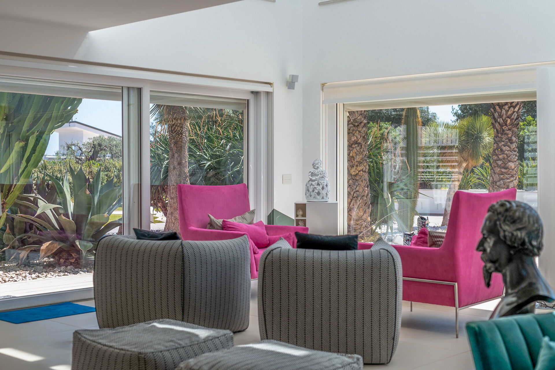 Large windows throughout both properties bring in an enormous amount of light and ensure that guests can enjoy views over the immaculately presented gardens that surround the property. The decor throughout is contemporary and stylish. Bright pinks and greens add a vibrancy and warmth to one of the living areas overlooking the pool, whilst elsewhere the clever use of wallpaper adds character to other rooms.
